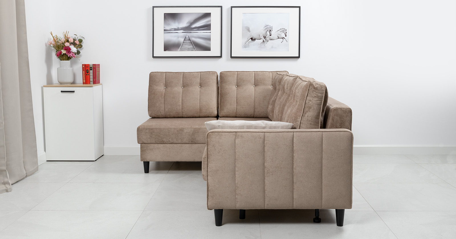 Диван-кровать угловой Арно ТД 565 велюр Лаки 04 песочный, Vertical 910 молочно-серый, сборка на любую сторону