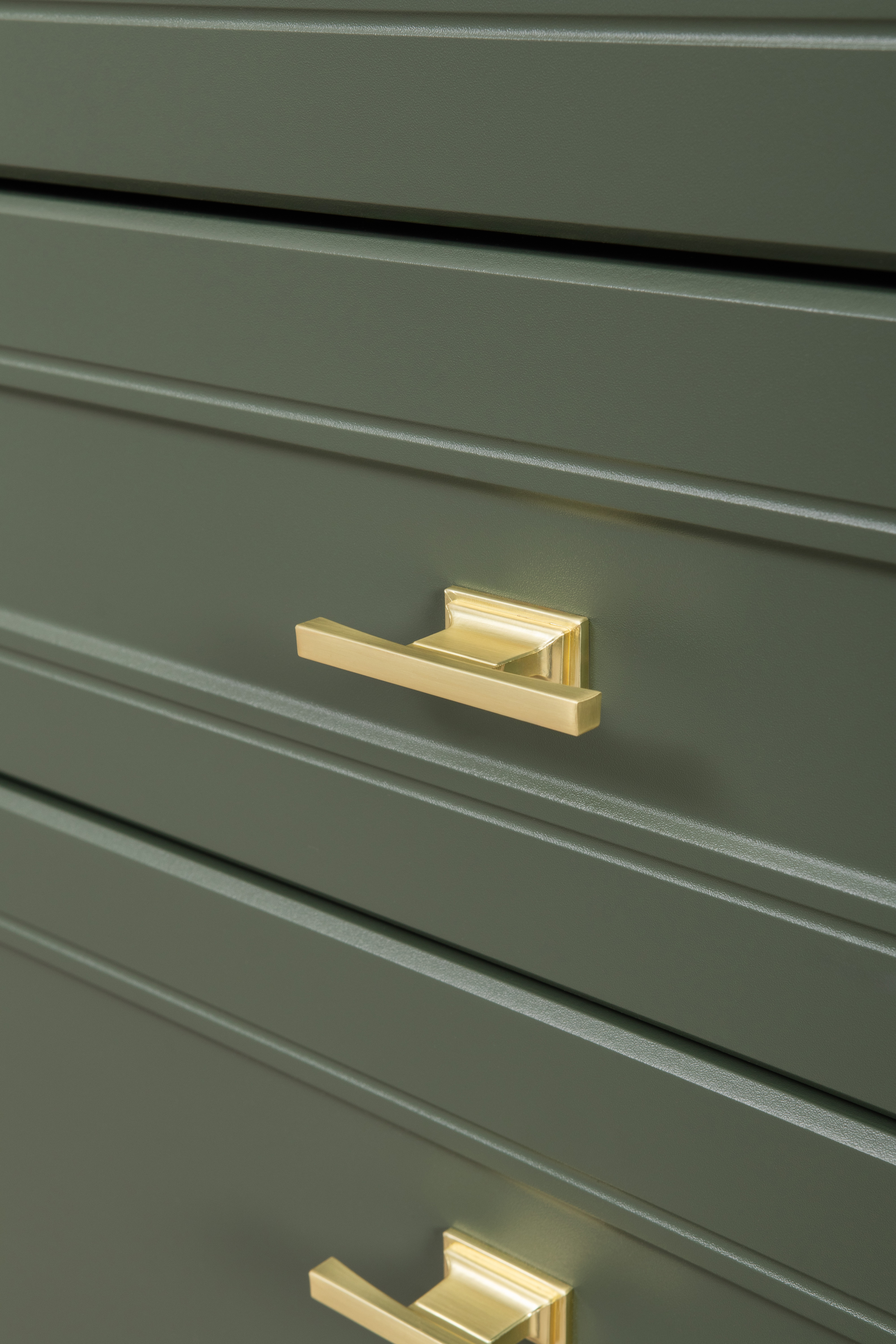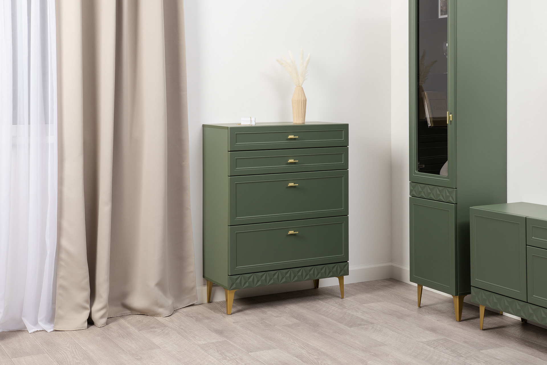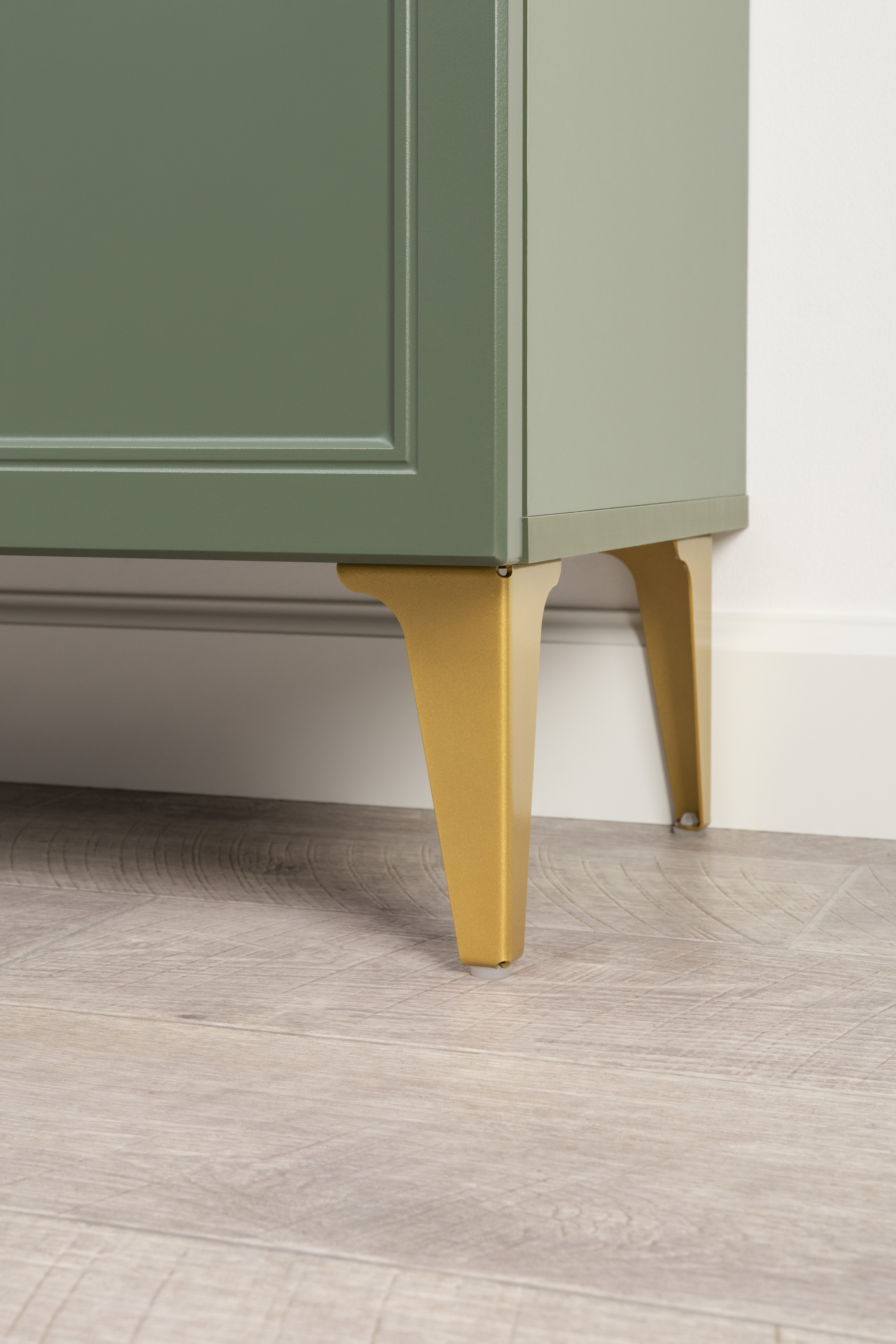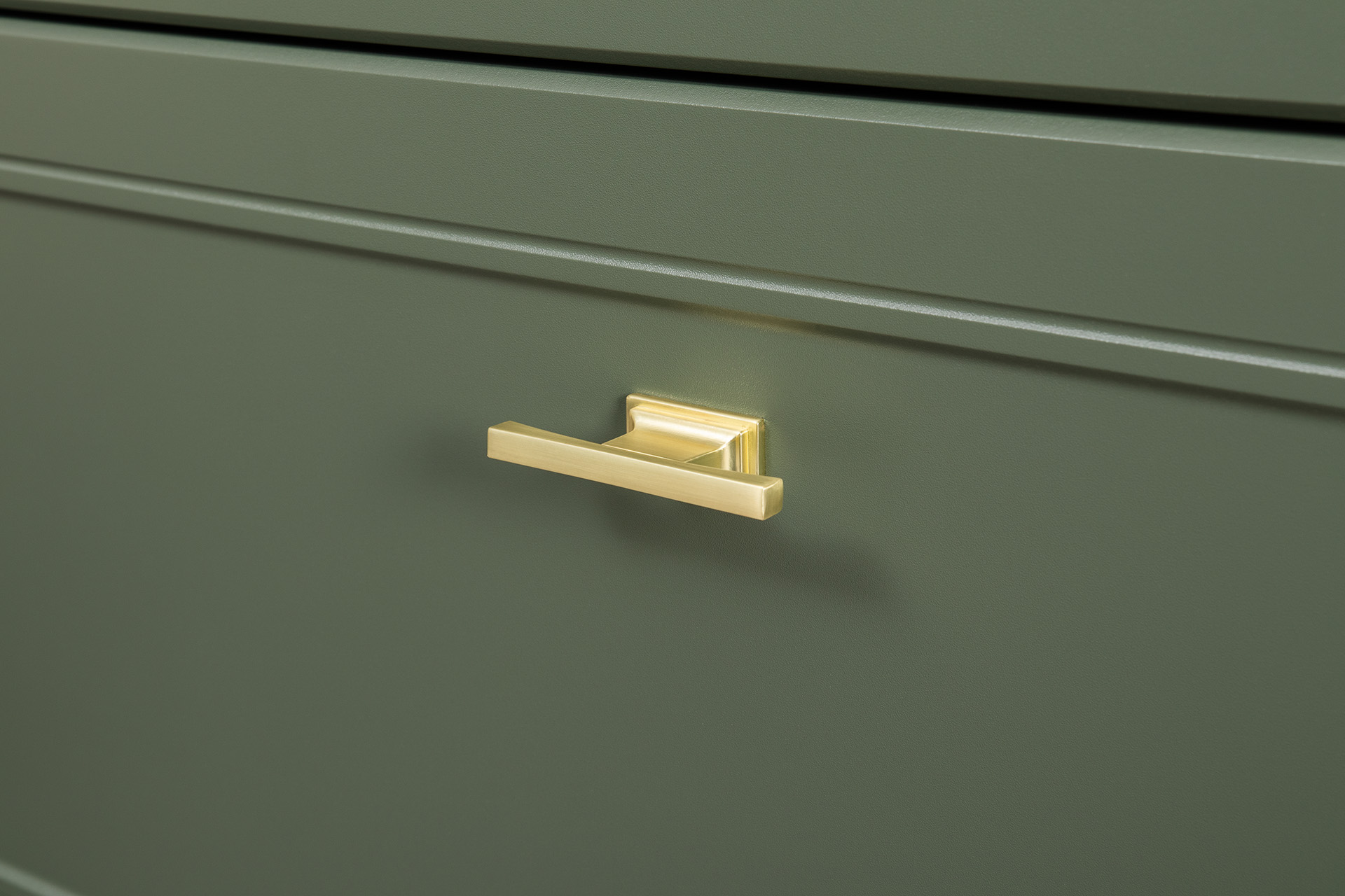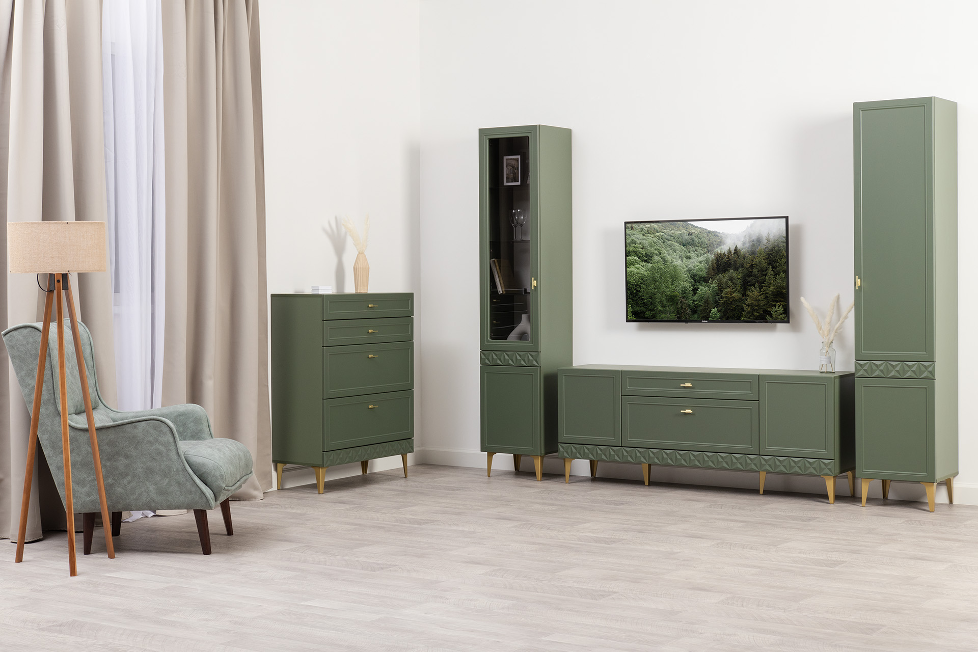 Изящные линии, глубокая фрезеровка фасадов из МДФ и благородные оттенки. Утончённая «Слоновая кость» и изысканная «Олива Шагрень» с глубоким зелёным тоном — создают атмосферу уюта, тепла и благородства. Металлические ручки и опоры золотого цвета придают мебели утончённый блеск, а петли и направляющие с доводчиками обеспечивают плавное и бесшумное закрытие фасадов.
