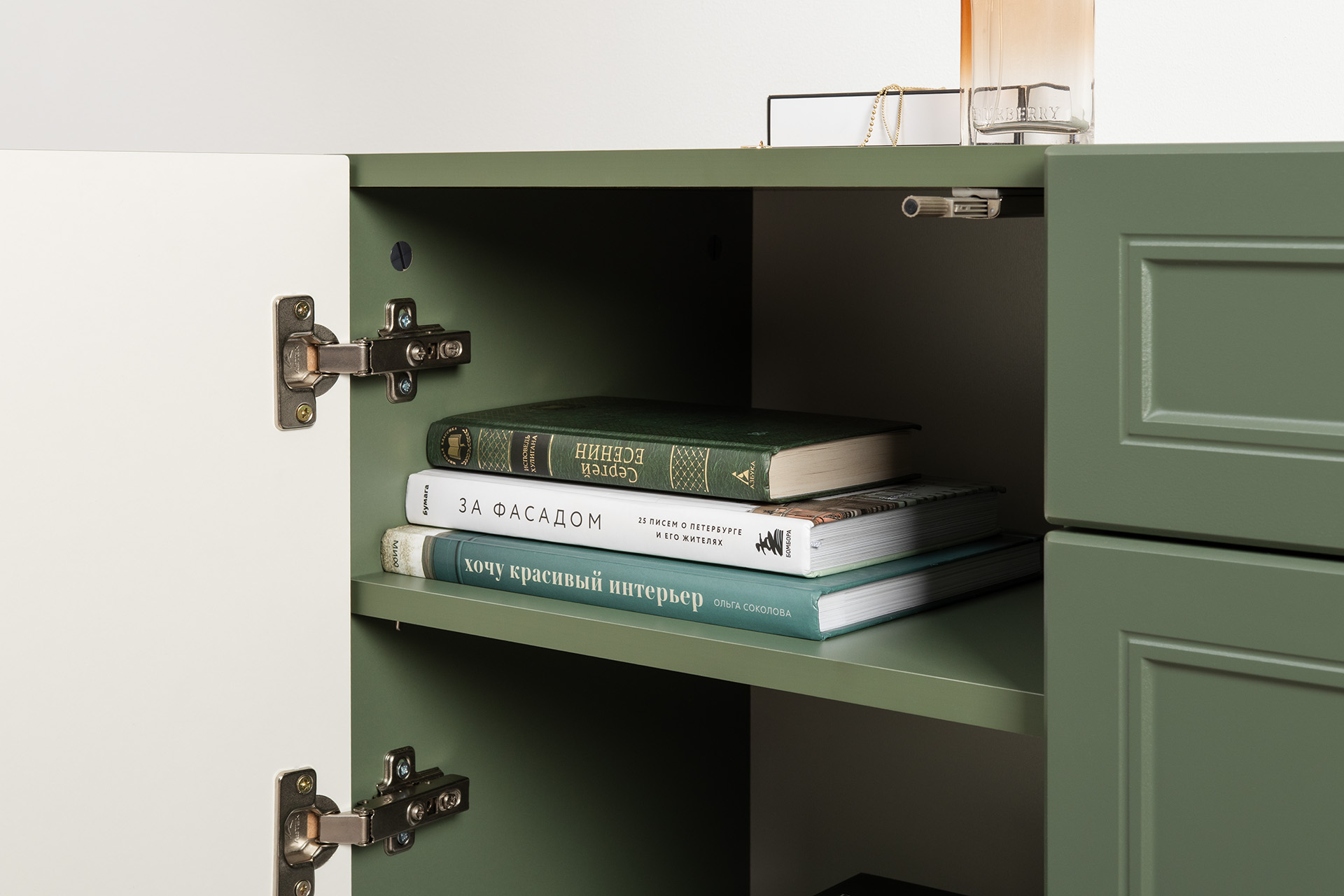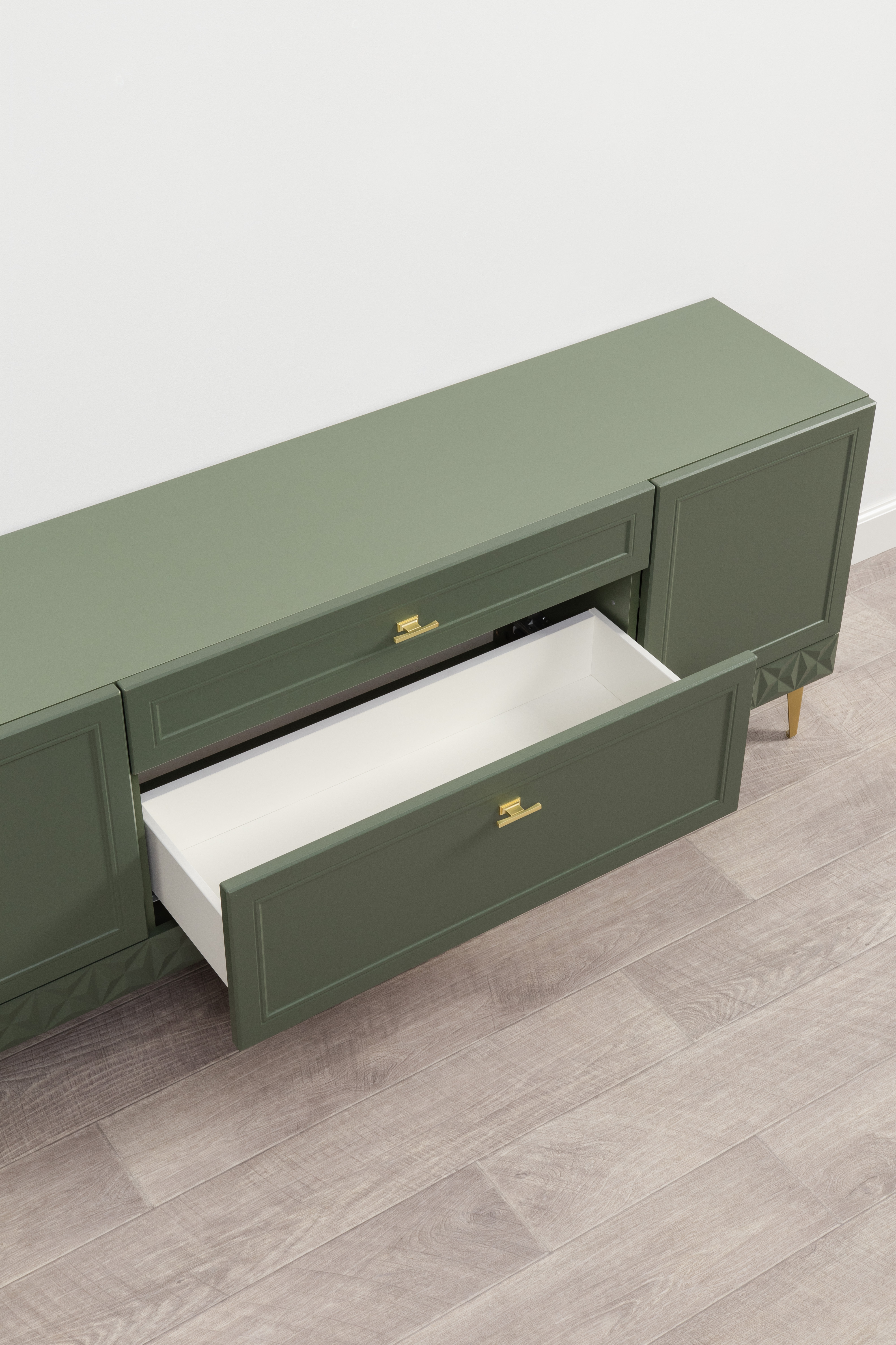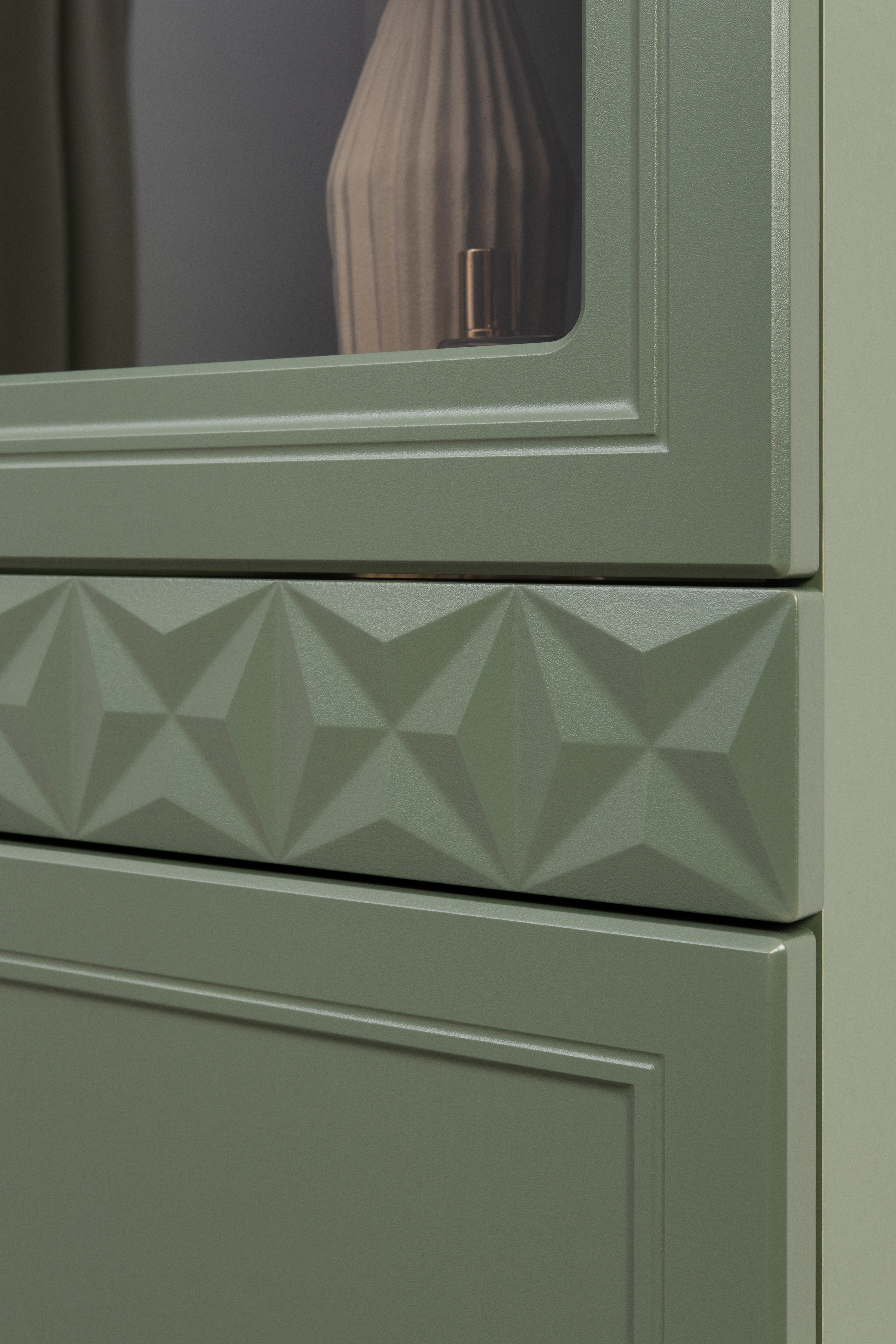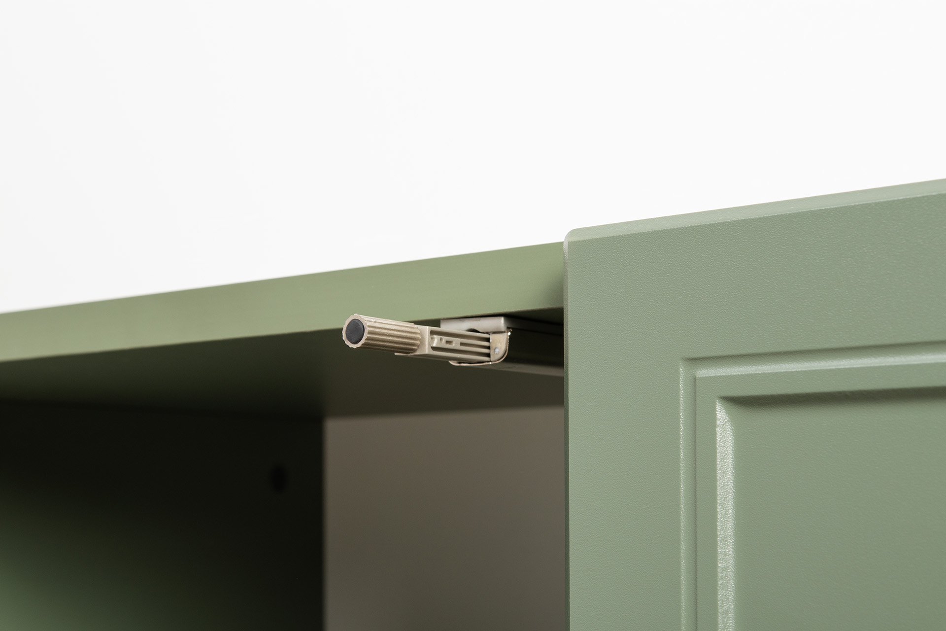 Изящные линии, глубокая фрезеровка фасадов из МДФ и благородные оттенки. Утончённая «Слоновая кость» и изысканная «Олива Шагрень» с глубоким зелёным тоном — создают атмосферу уюта, тепла и благородства. Металлические ручки и опоры золотого цвета придают мебели утончённый блеск, а петли и направляющие с доводчиками обеспечивают плавное и бесшумное закрытие фасадов.
