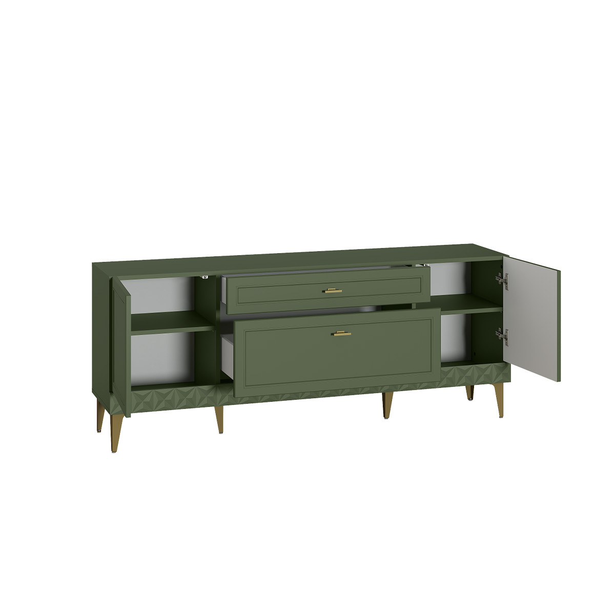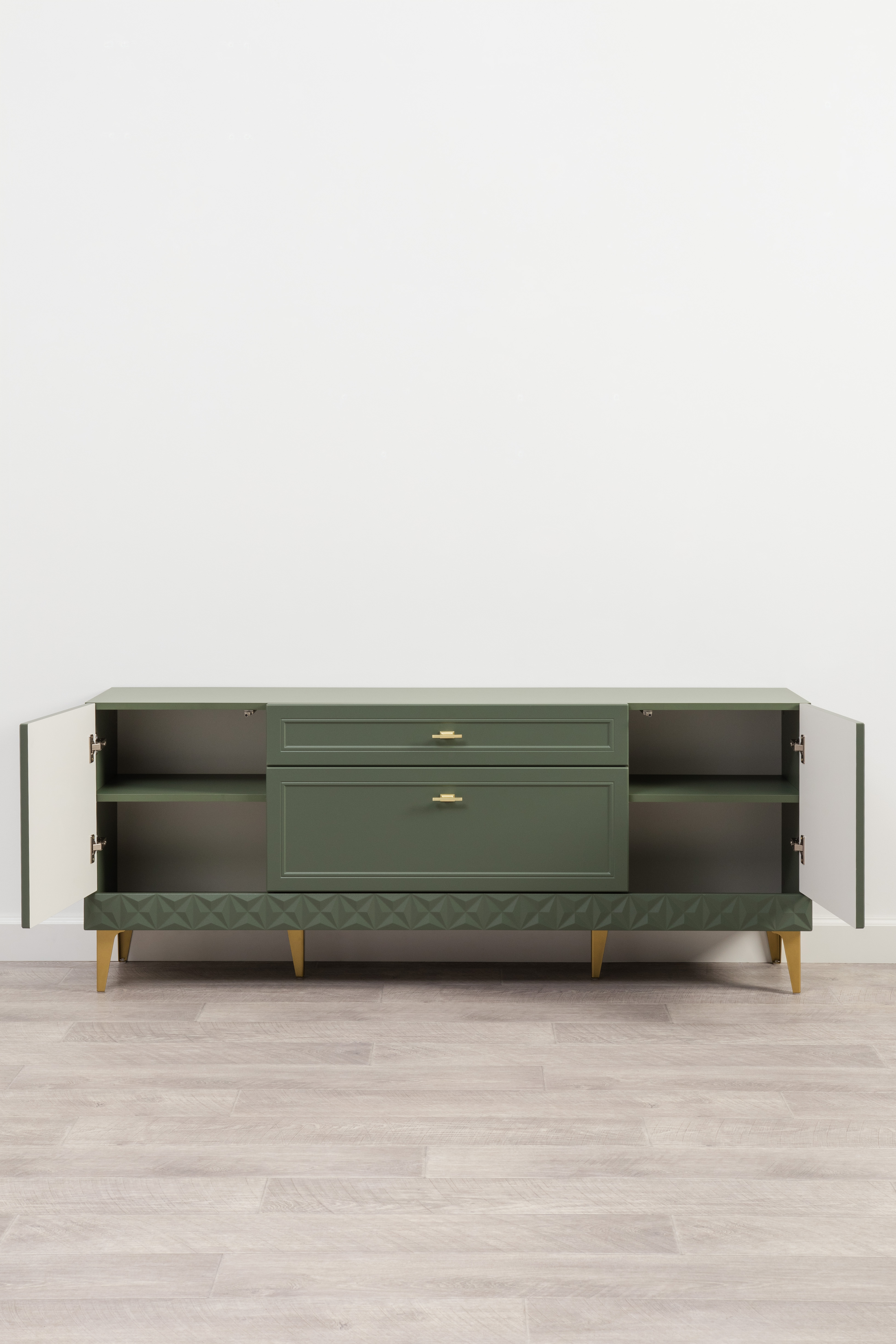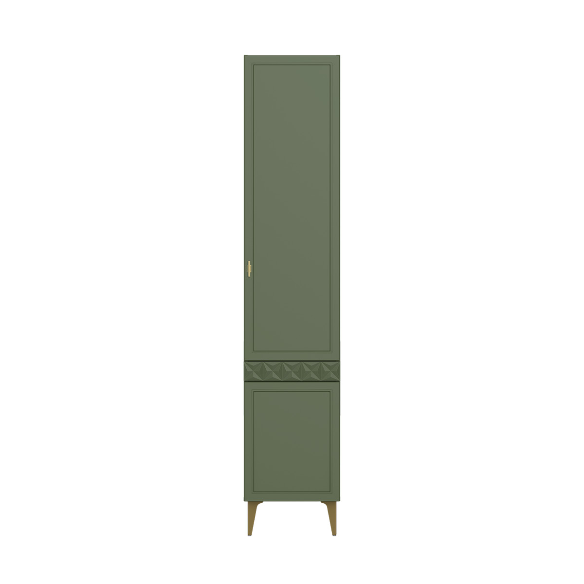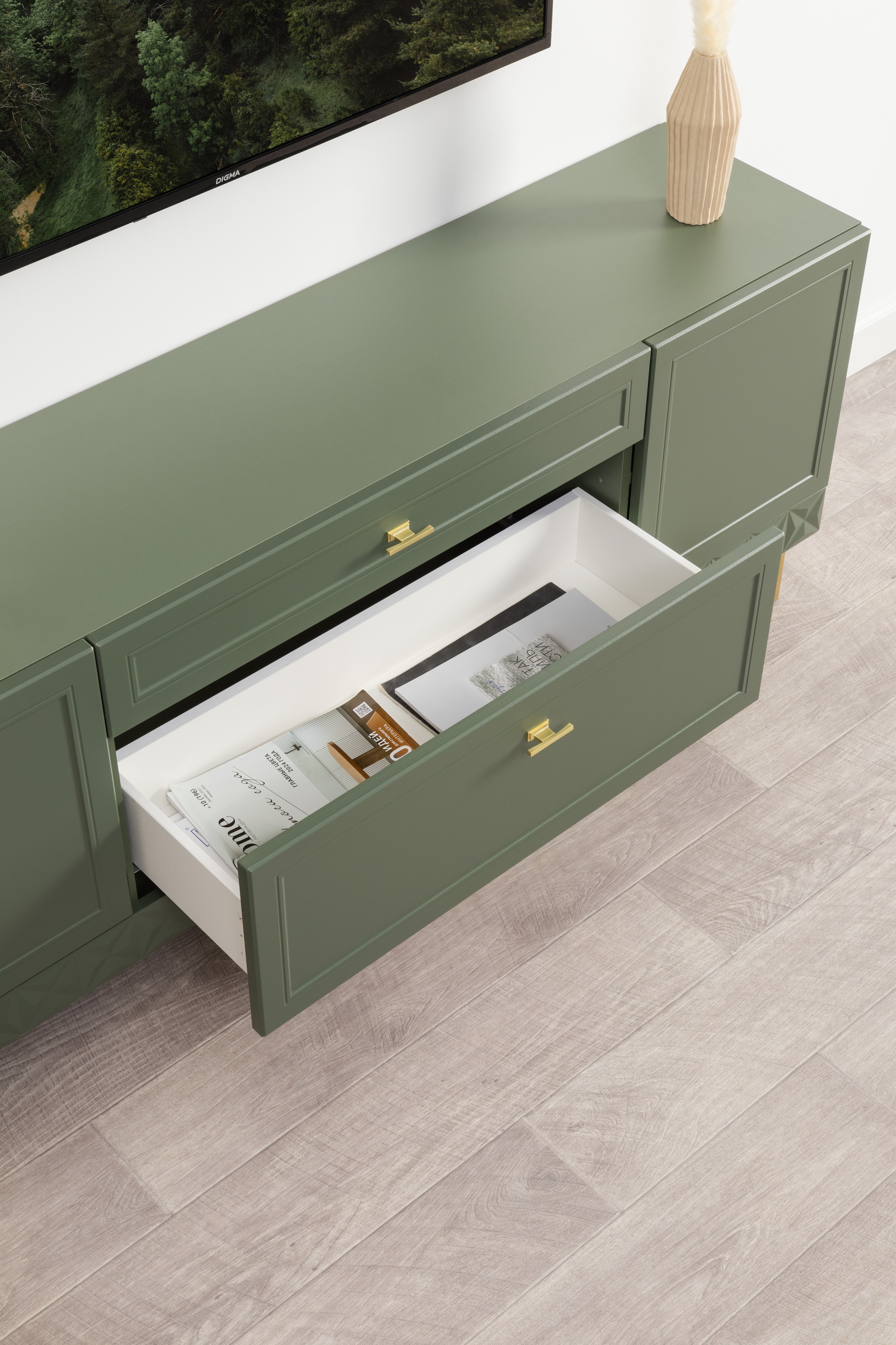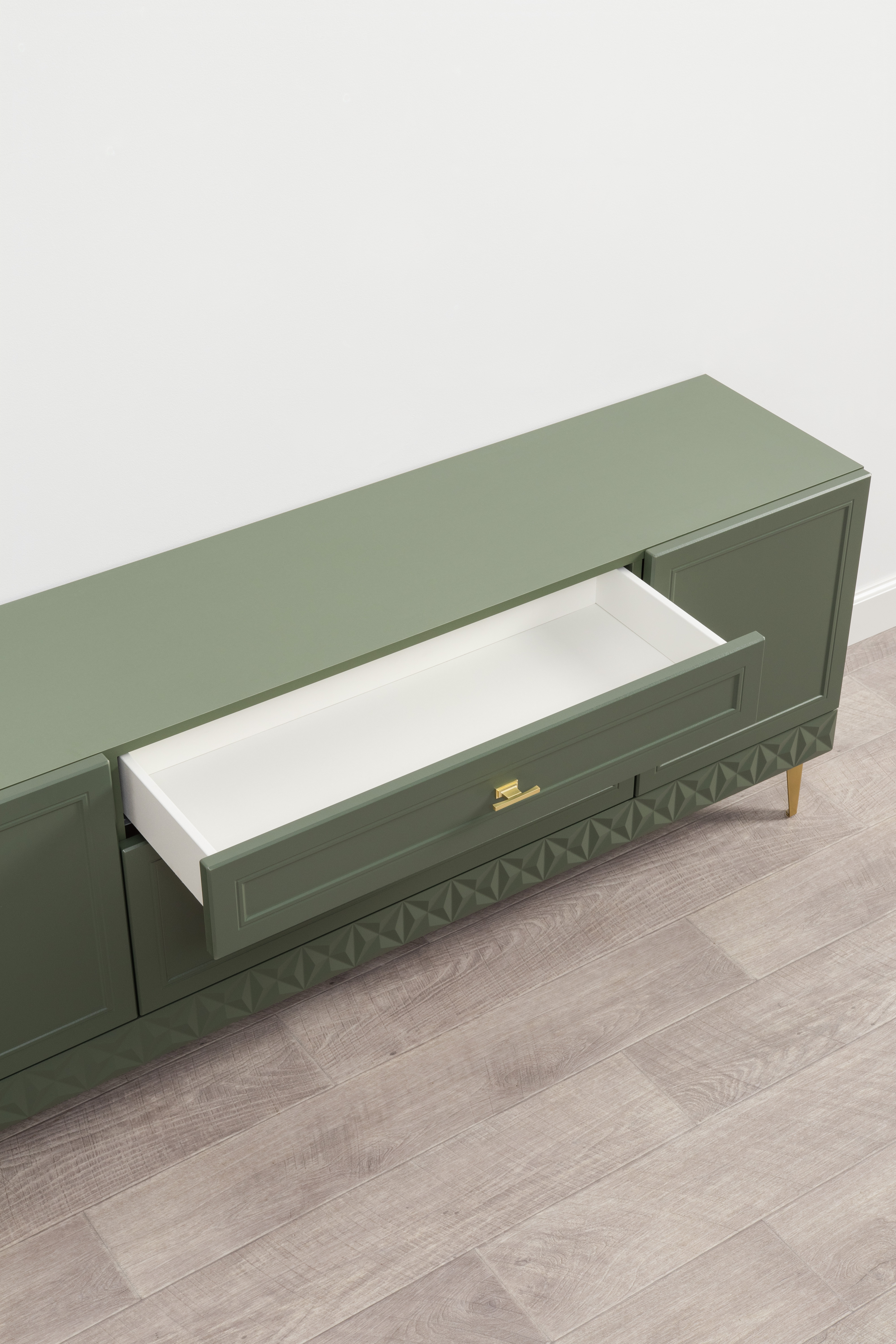 Изящные линии, глубокая фрезеровка фасадов из МДФ и благородные оттенки. Утончённая «Слоновая кость» и изысканная «Олива Шагрень» с глубоким зелёным тоном — создают атмосферу уюта, тепла и благородства. Металлические ручки и опоры золотого цвета придают мебели утончённый блеск, а петли и направляющие с доводчиками обеспечивают плавное и бесшумное закрытие фасадов.