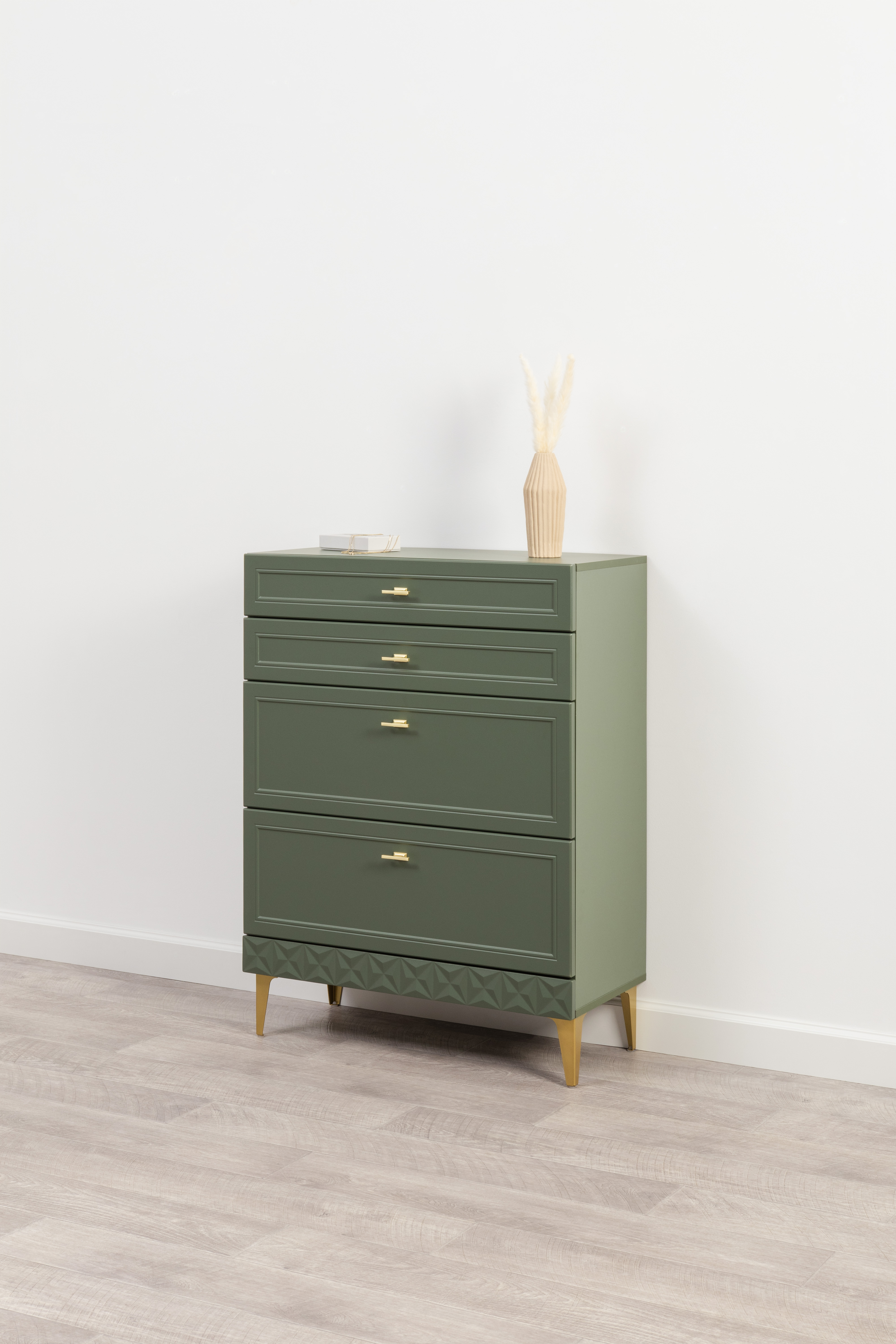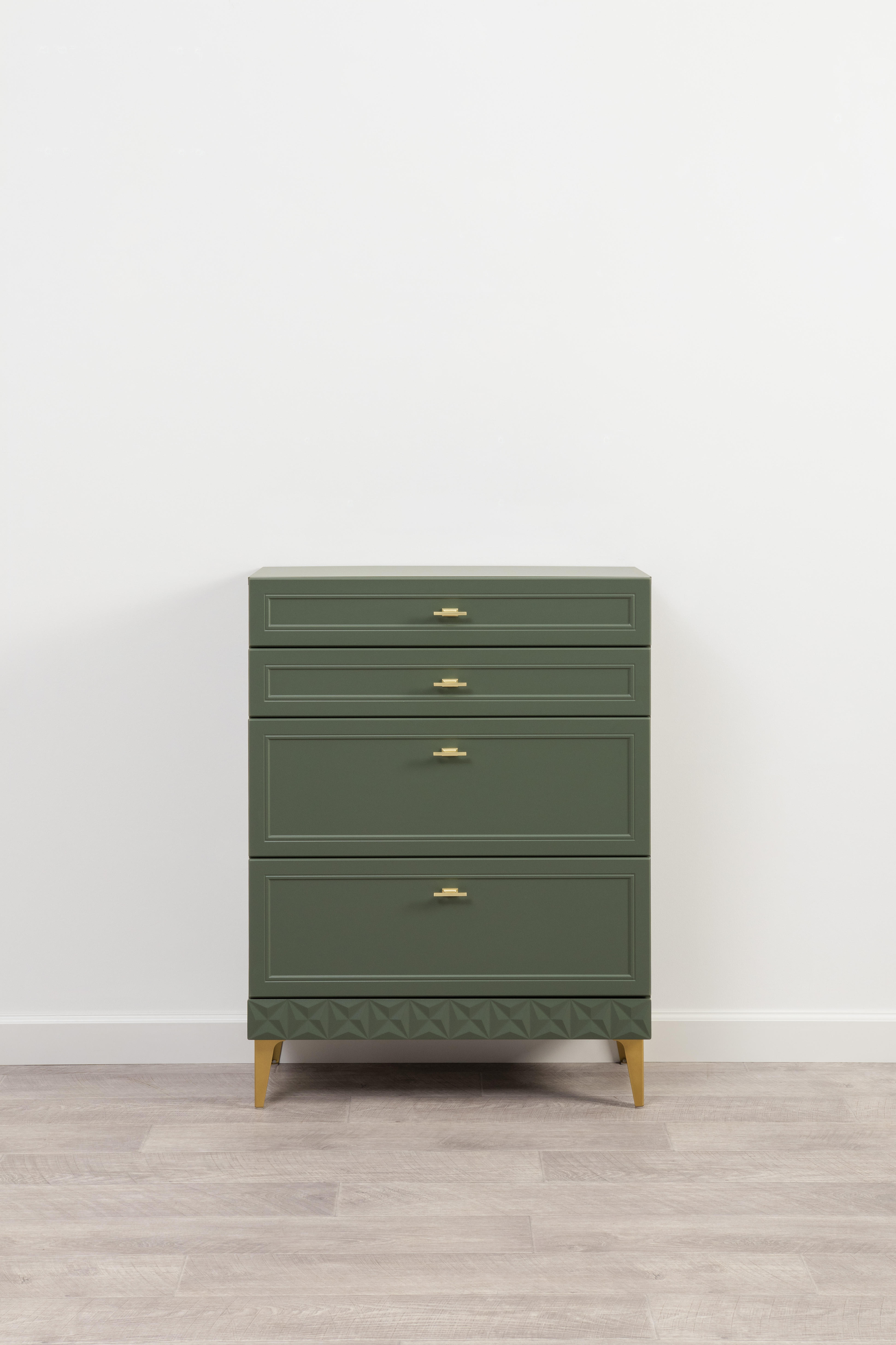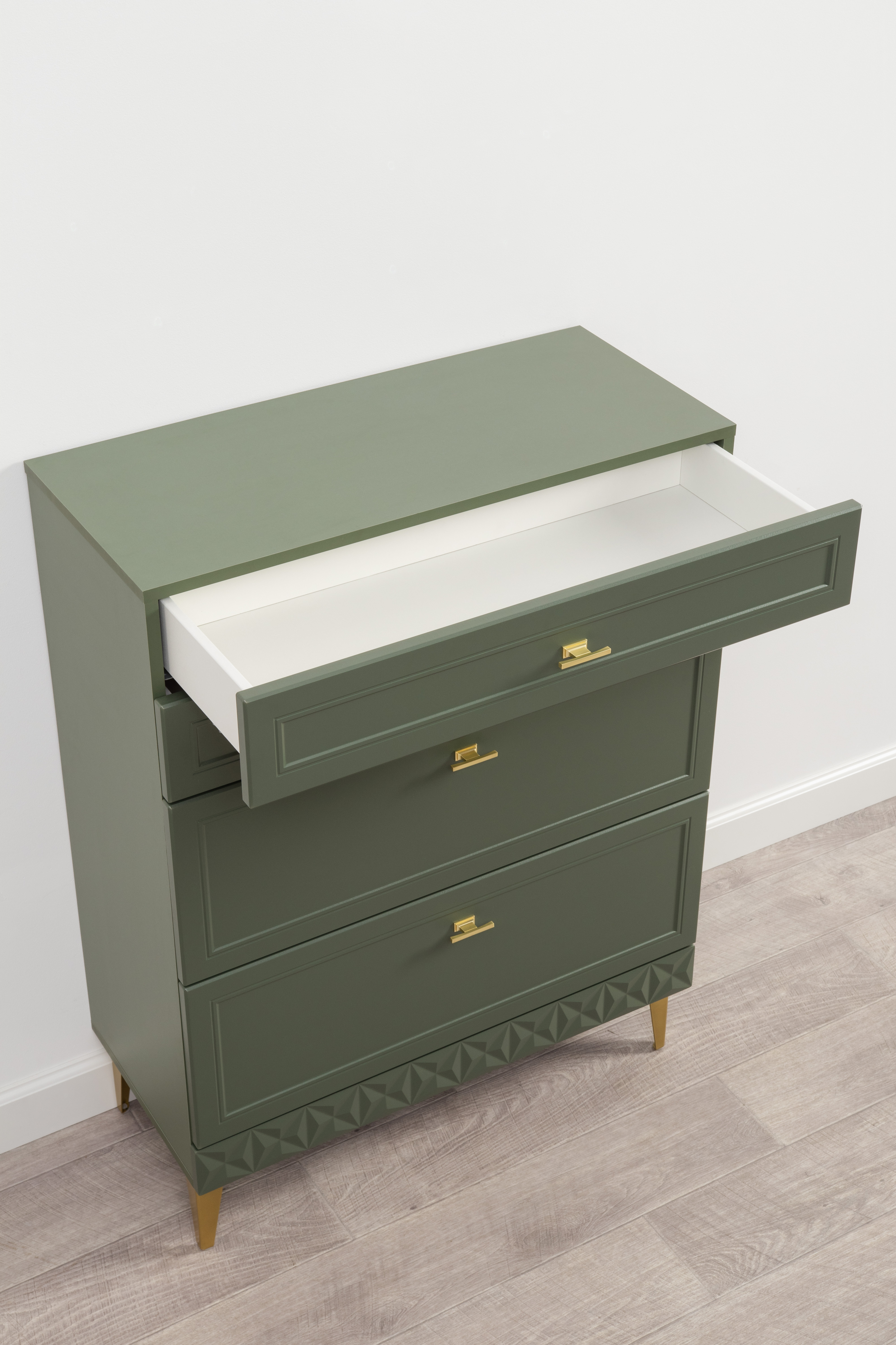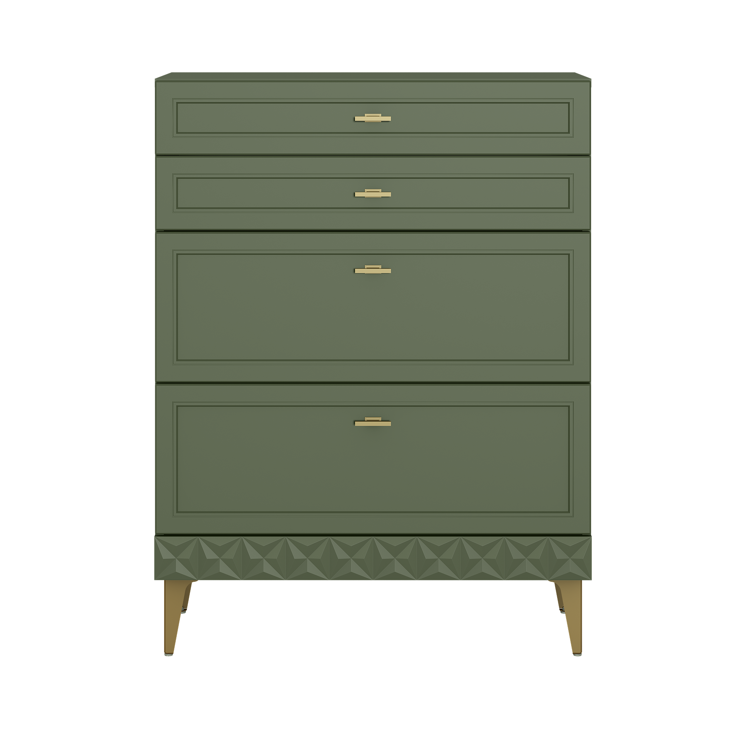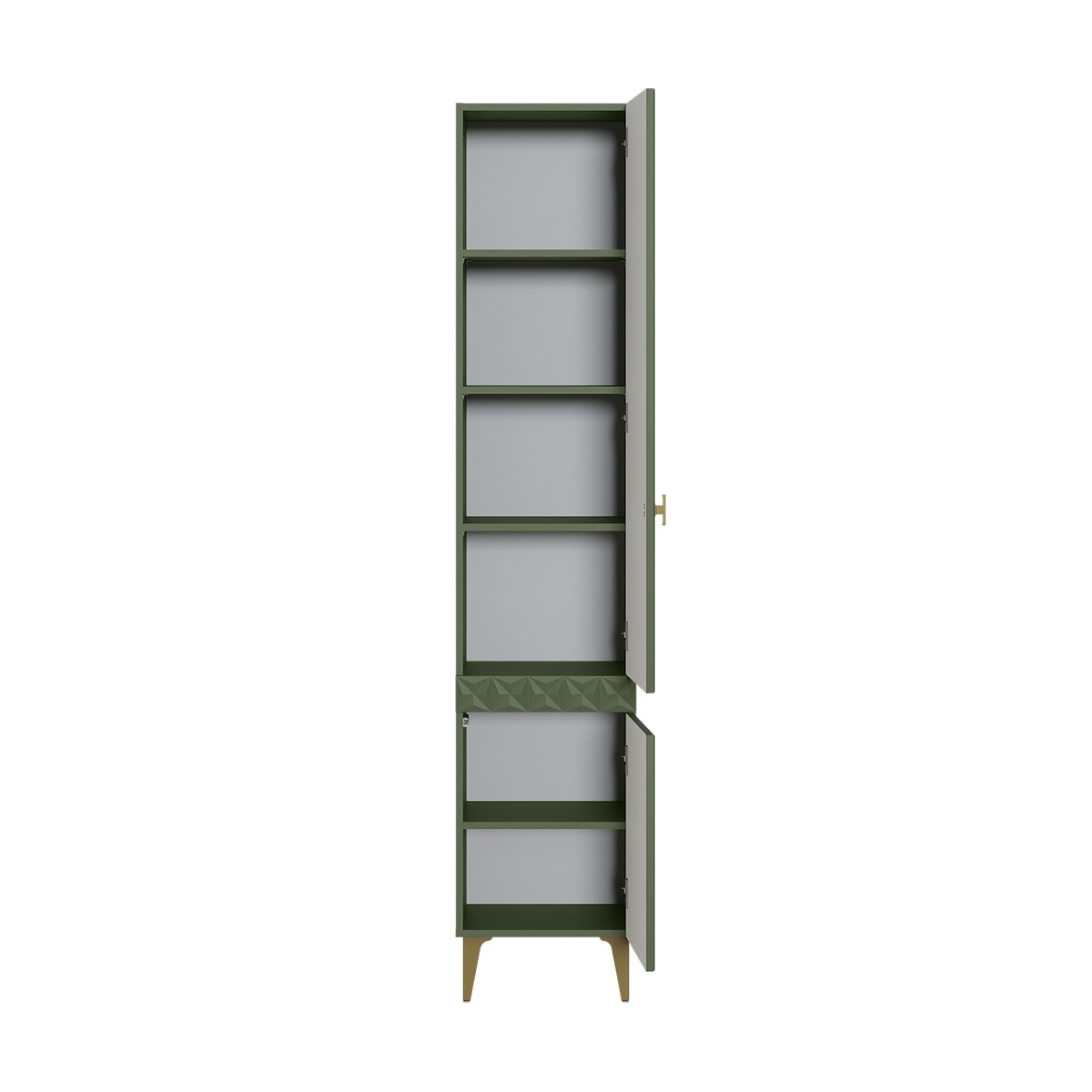 Изящные линии, глубокая фрезеровка фасадов из МДФ и благородные оттенки. Утончённая «Слоновая кость» и изысканная «Олива Шагрень» с глубоким зелёным тоном — создают атмосферу уюта, тепла и благородства. Металлические ручки и опоры золотого цвета придают мебели утончённый блеск, а петли и направляющие с доводчиками обеспечивают плавное и бесшумное закрытие фасадов.