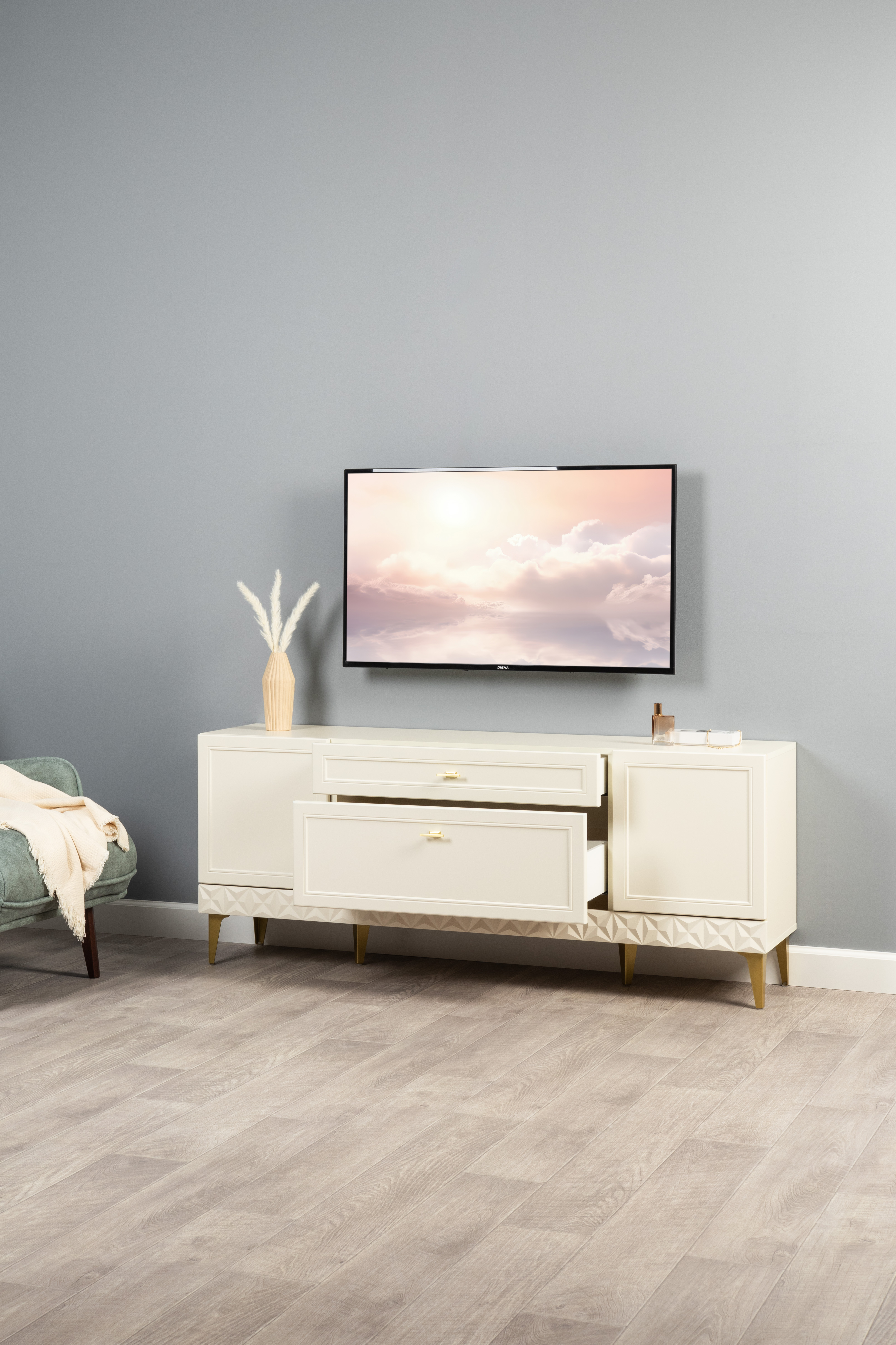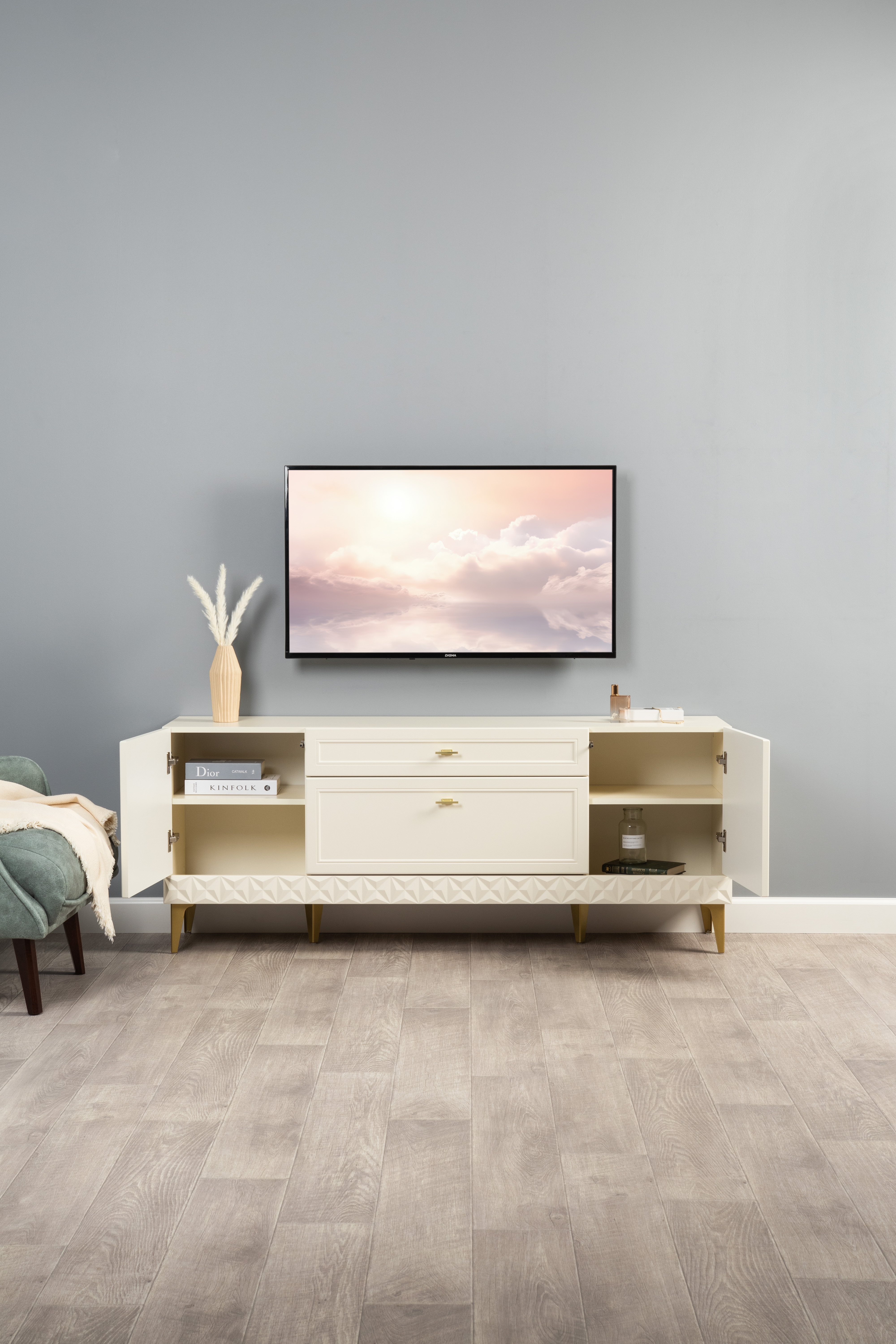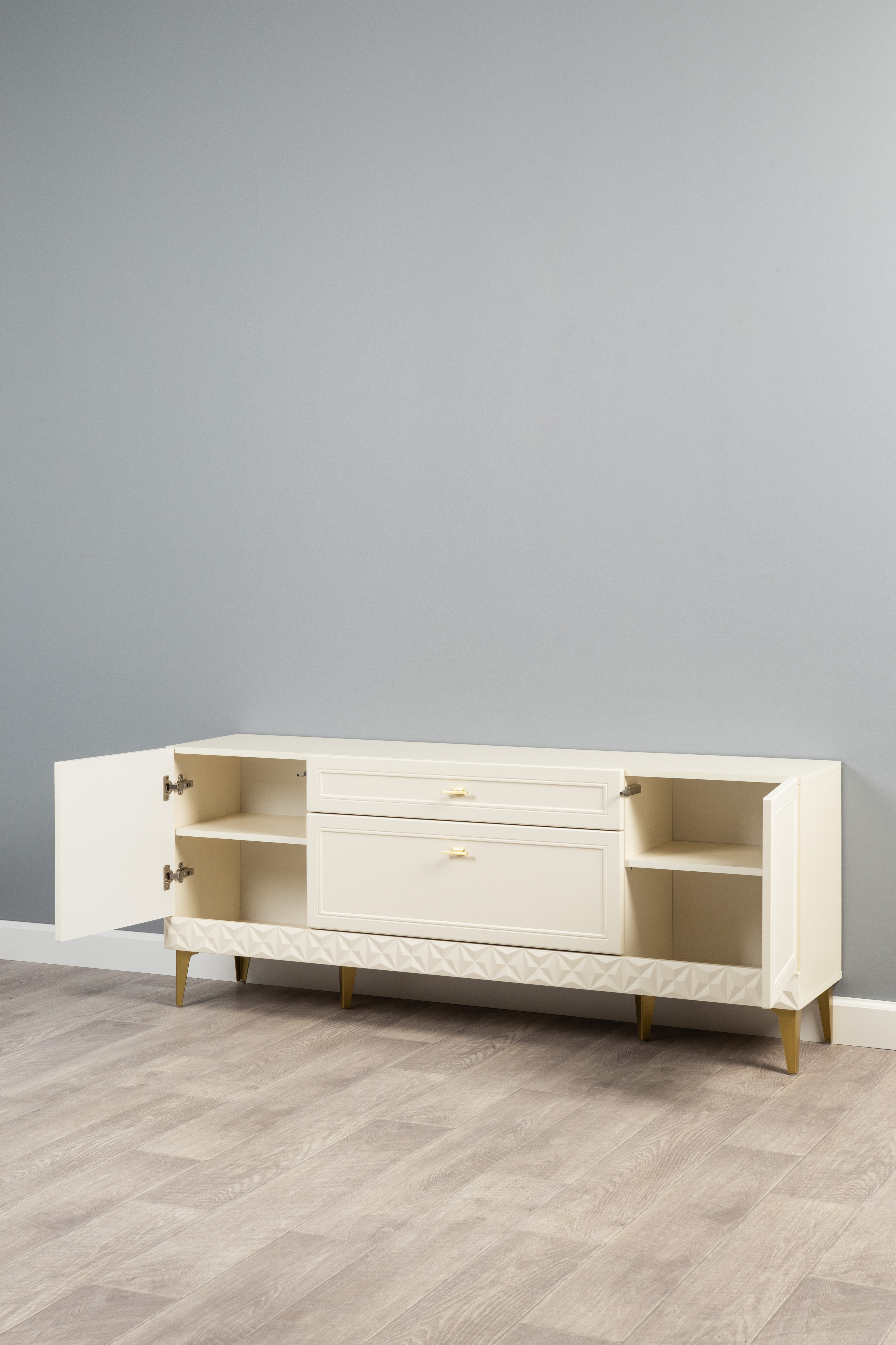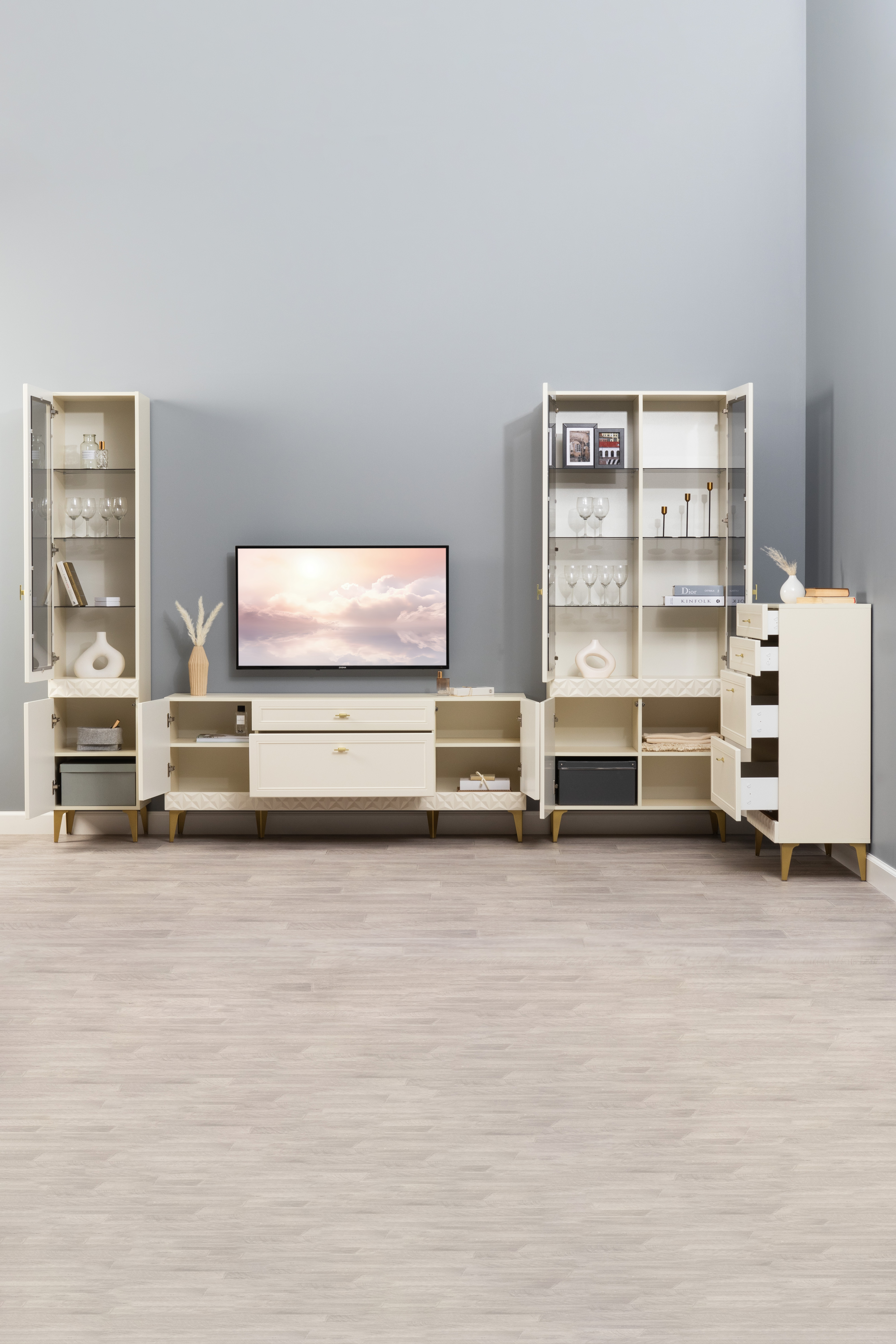 Гостиная Марион композиция 1 слоновая кость С341 PE, слоновая кость 6898 ПВХ, белый PE шагрень (собирается на любую сторону)