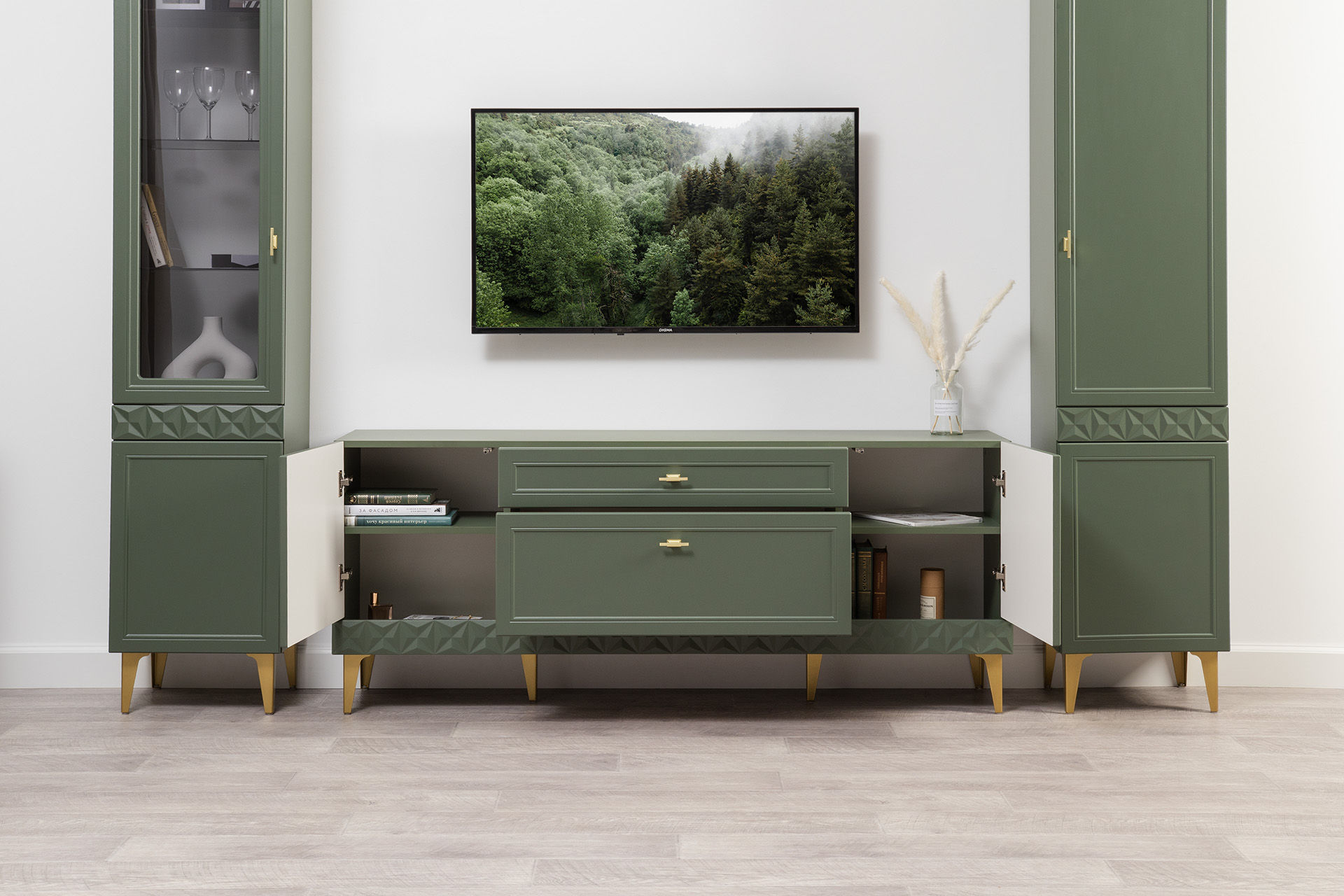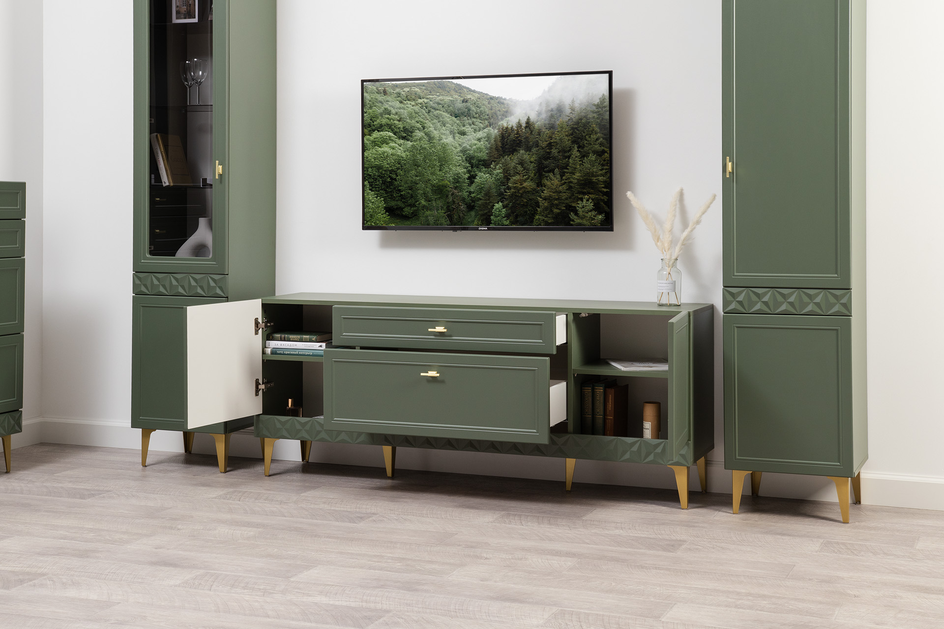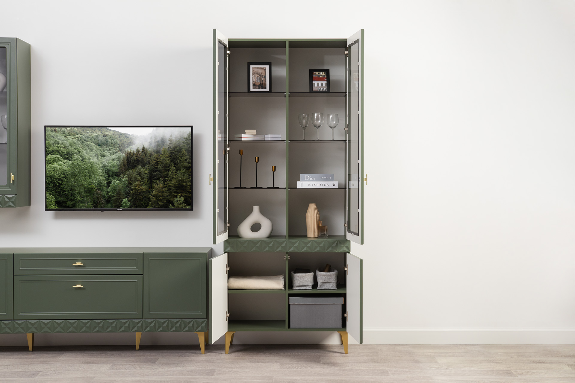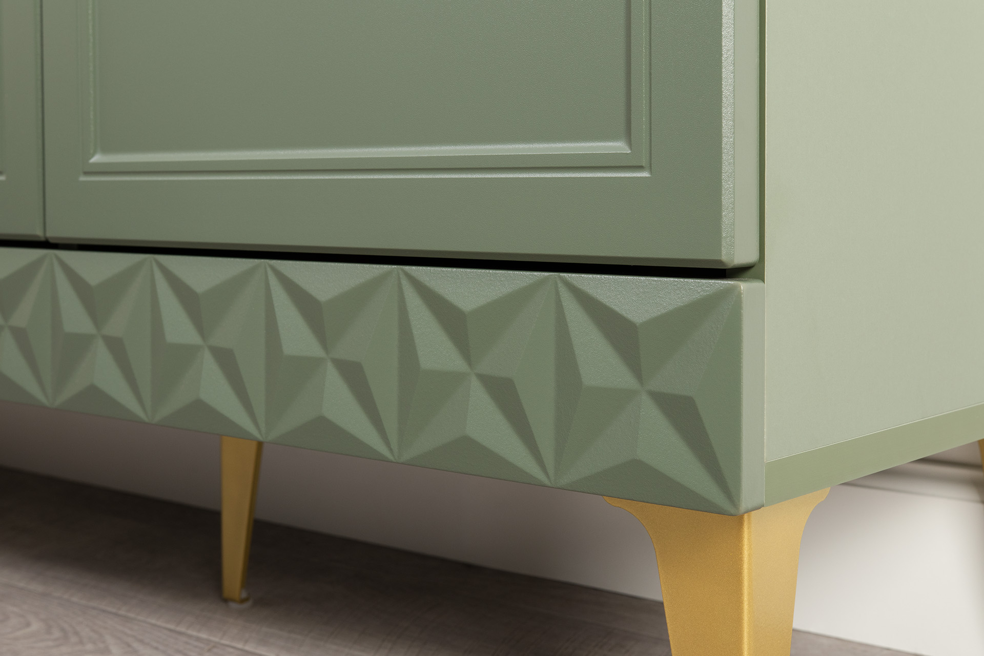 Изящные линии, глубокая фрезеровка фасадов из МДФ и благородные оттенки. Утончённая «Слоновая кость» и изысканная «Олива Шагрень» с глубоким зелёным тоном — создают атмосферу уюта, тепла и благородства. Металлические ручки и опоры золотого цвета придают мебели утончённый блеск, а петли и направляющие с доводчиками обеспечивают плавное и бесшумное закрытие фасадов.