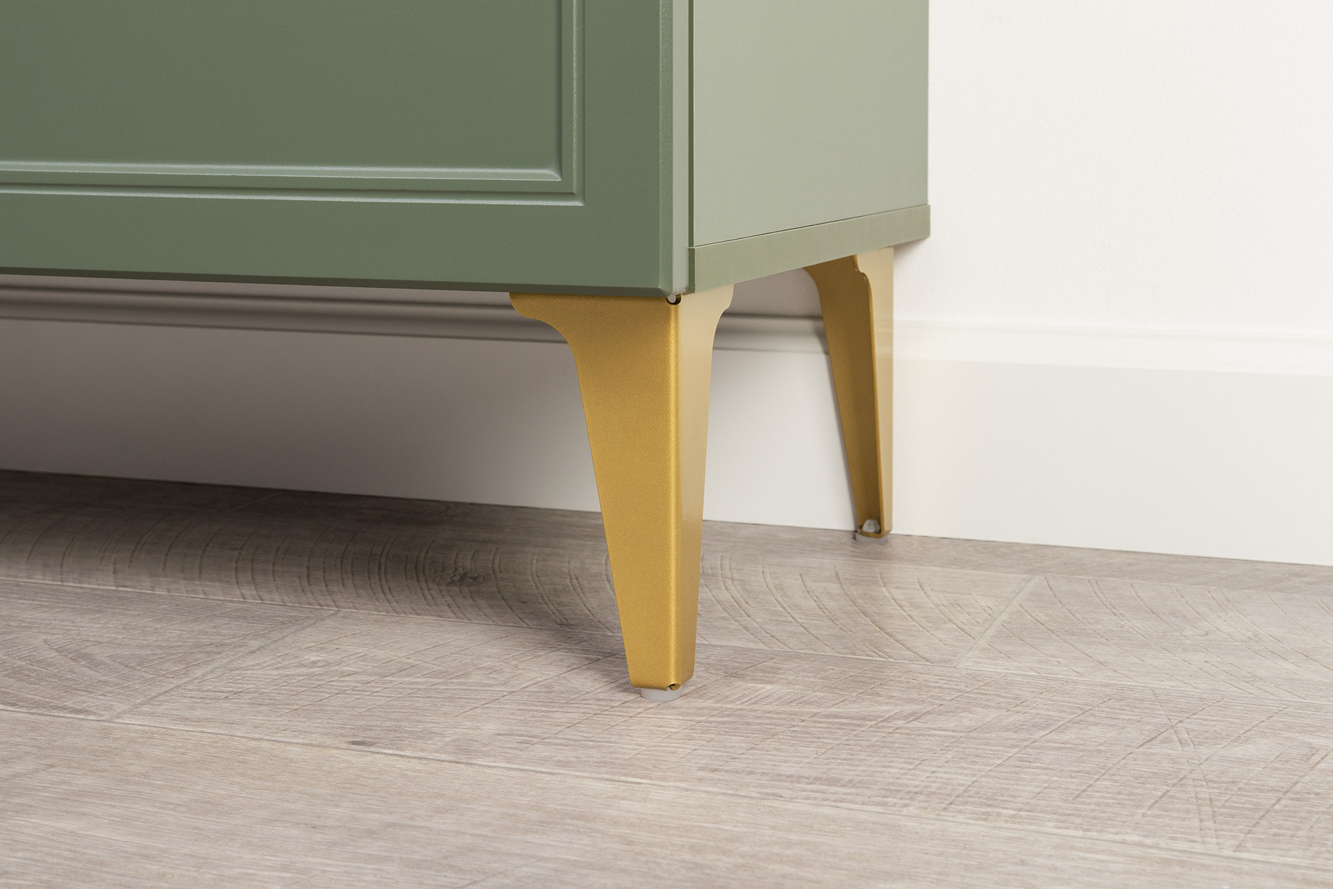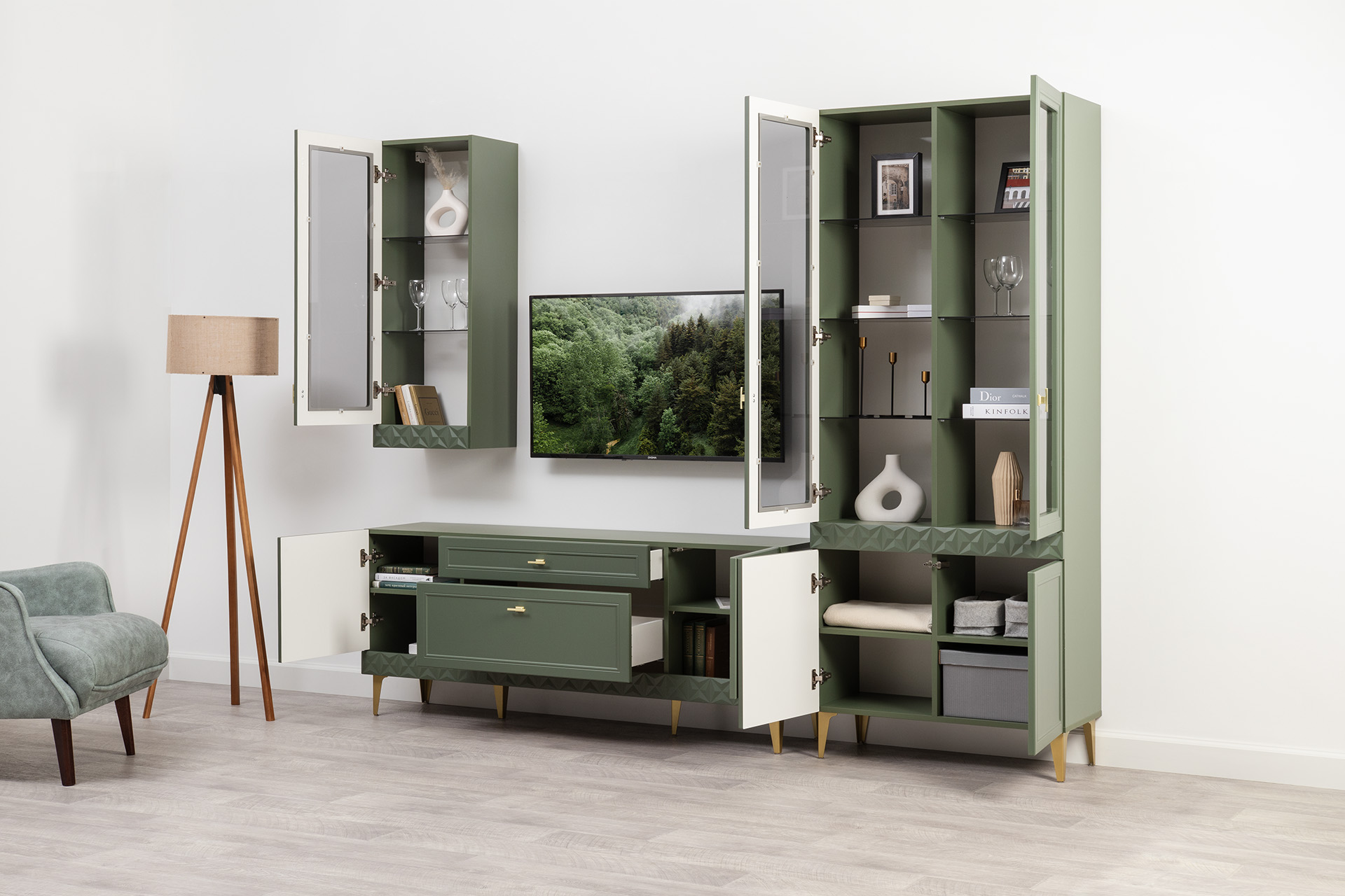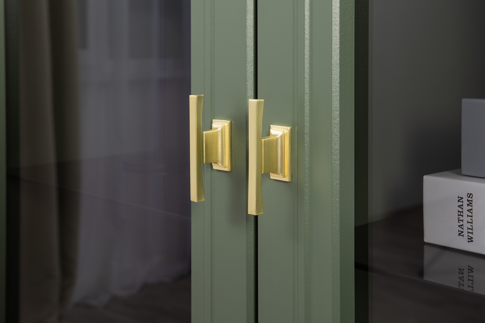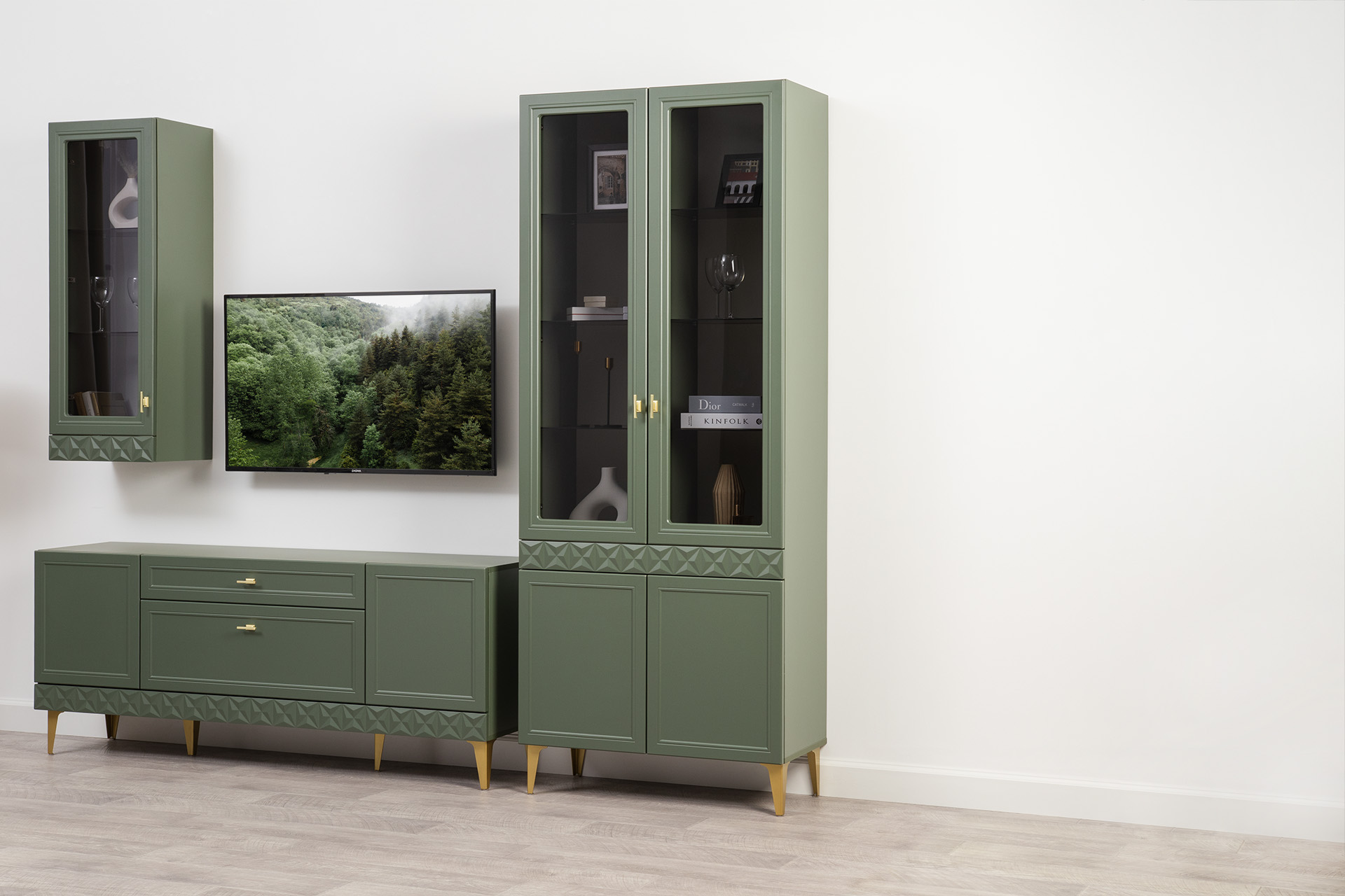 Изящные линии, глубокая фрезеровка фасадов из МДФ и благородные оттенки. Утончённая «Слоновая кость» и изысканная «Олива Шагрень» с глубоким зелёным тоном — создают атмосферу уюта, тепла и благородства. Металлические ручки и опоры золотого цвета придают мебели утончённый блеск, а петли и направляющие с доводчиками обеспечивают плавное и бесшумное закрытие фасадов.