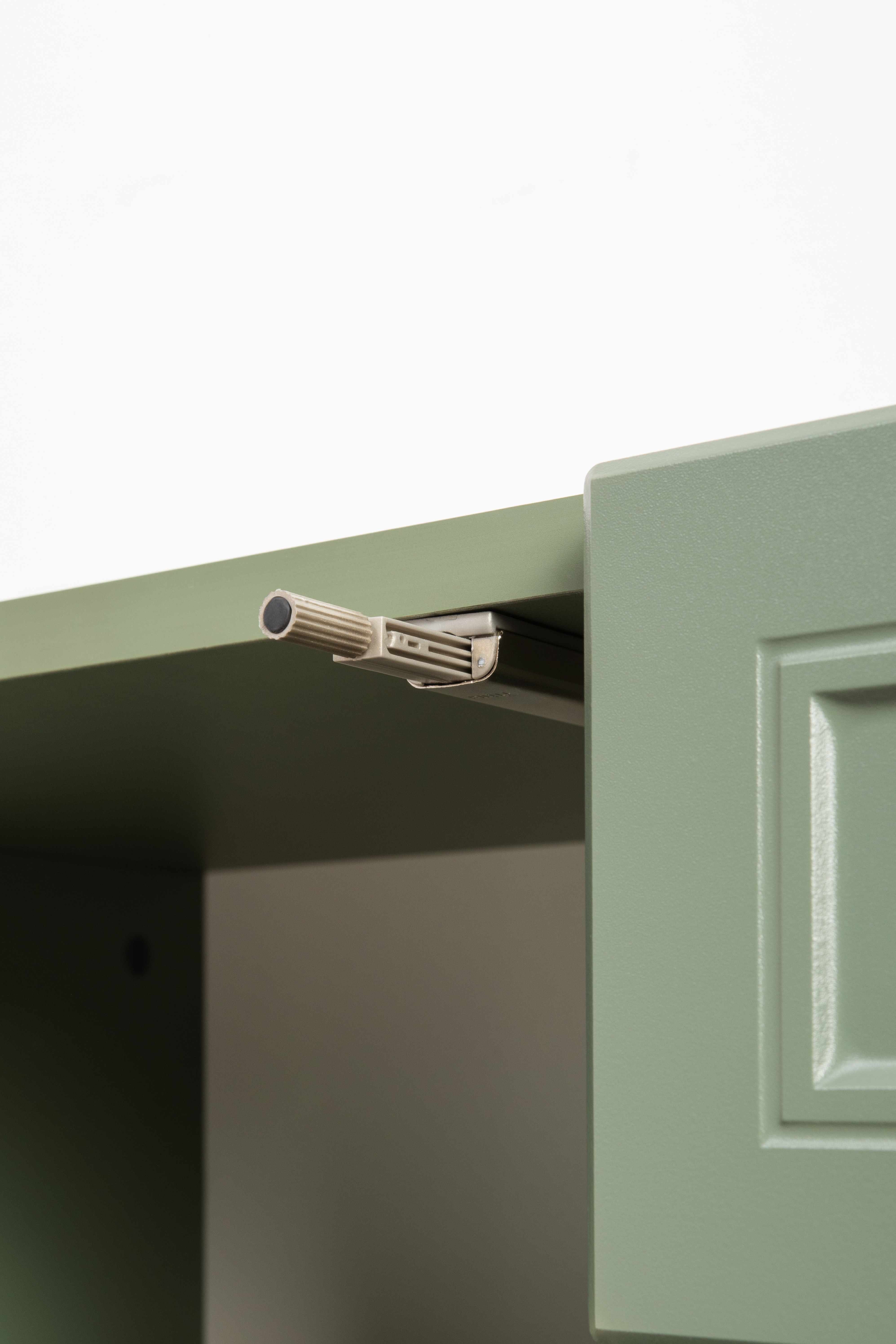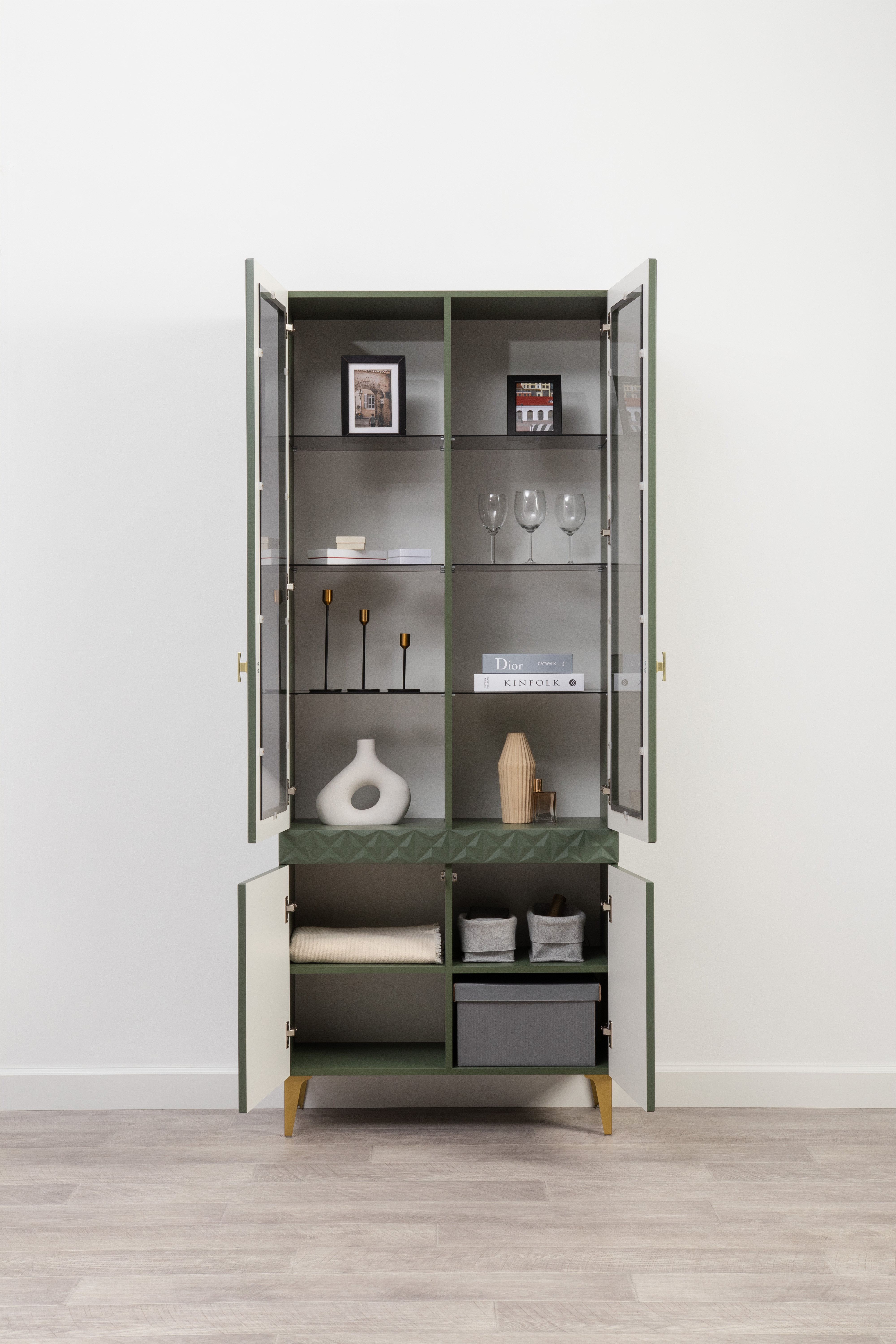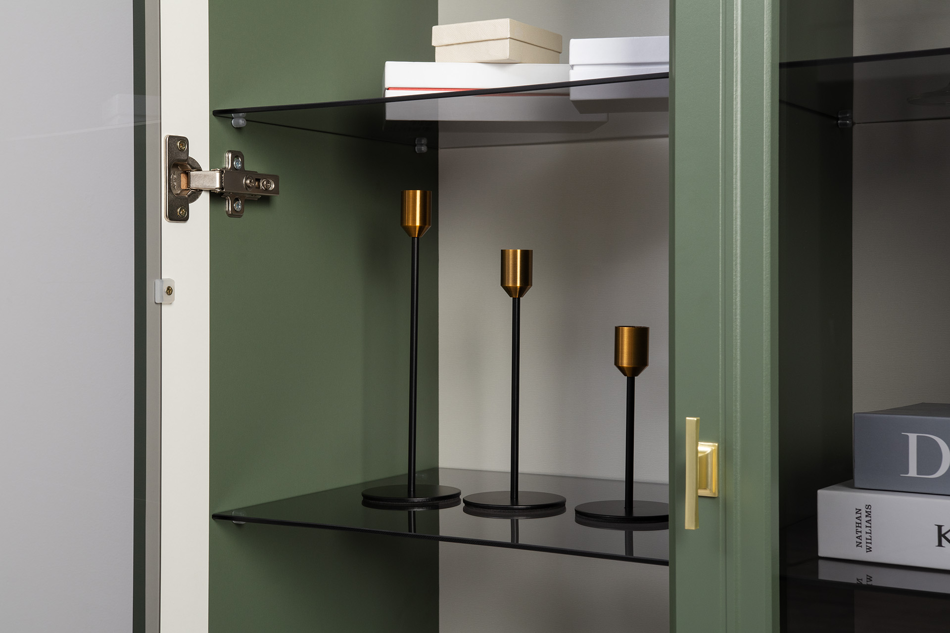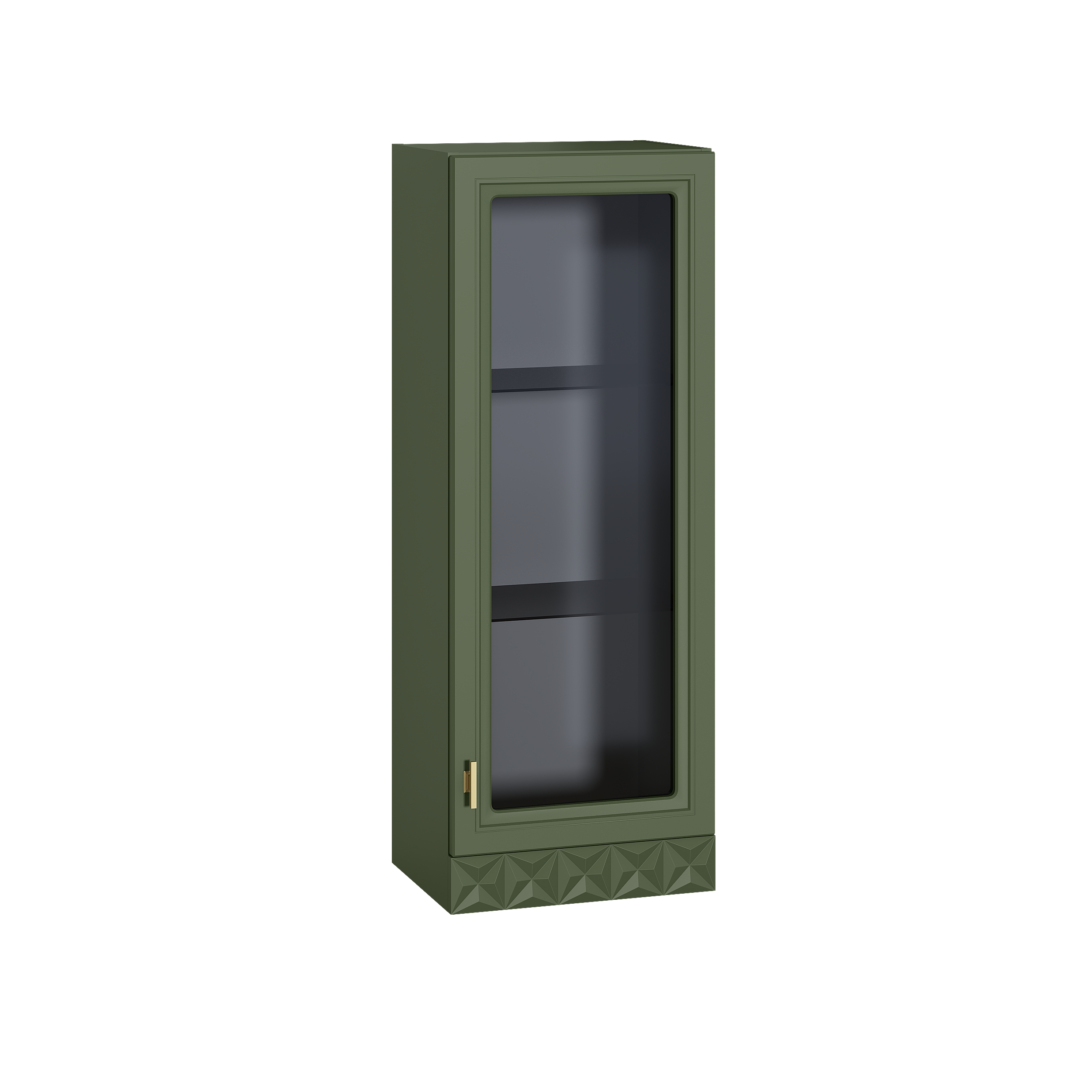 Изящные линии, глубокая фрезеровка фасадов из МДФ и благородные оттенки. Утончённая «Слоновая кость» и изысканная «Олива Шагрень» с глубоким зелёным тоном — создают атмосферу уюта, тепла и благородства. Металлические ручки и опоры золотого цвета придают мебели утончённый блеск, а петли и направляющие с доводчиками обеспечивают плавное и бесшумное закрытие фасадов.