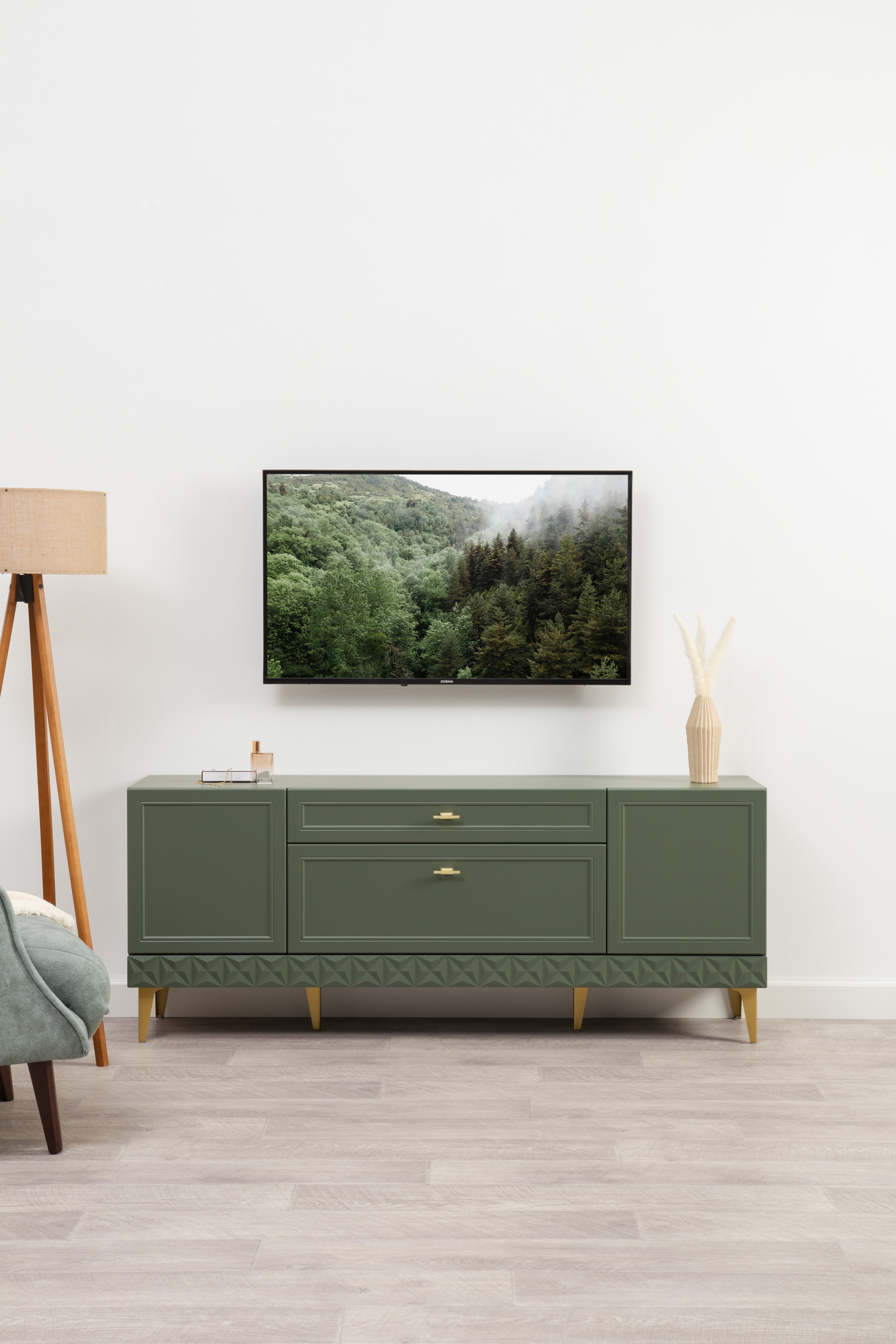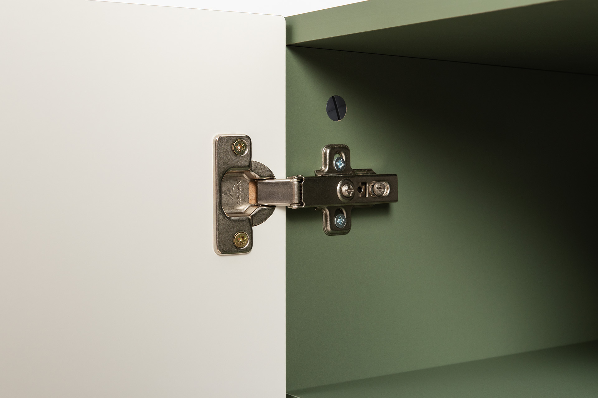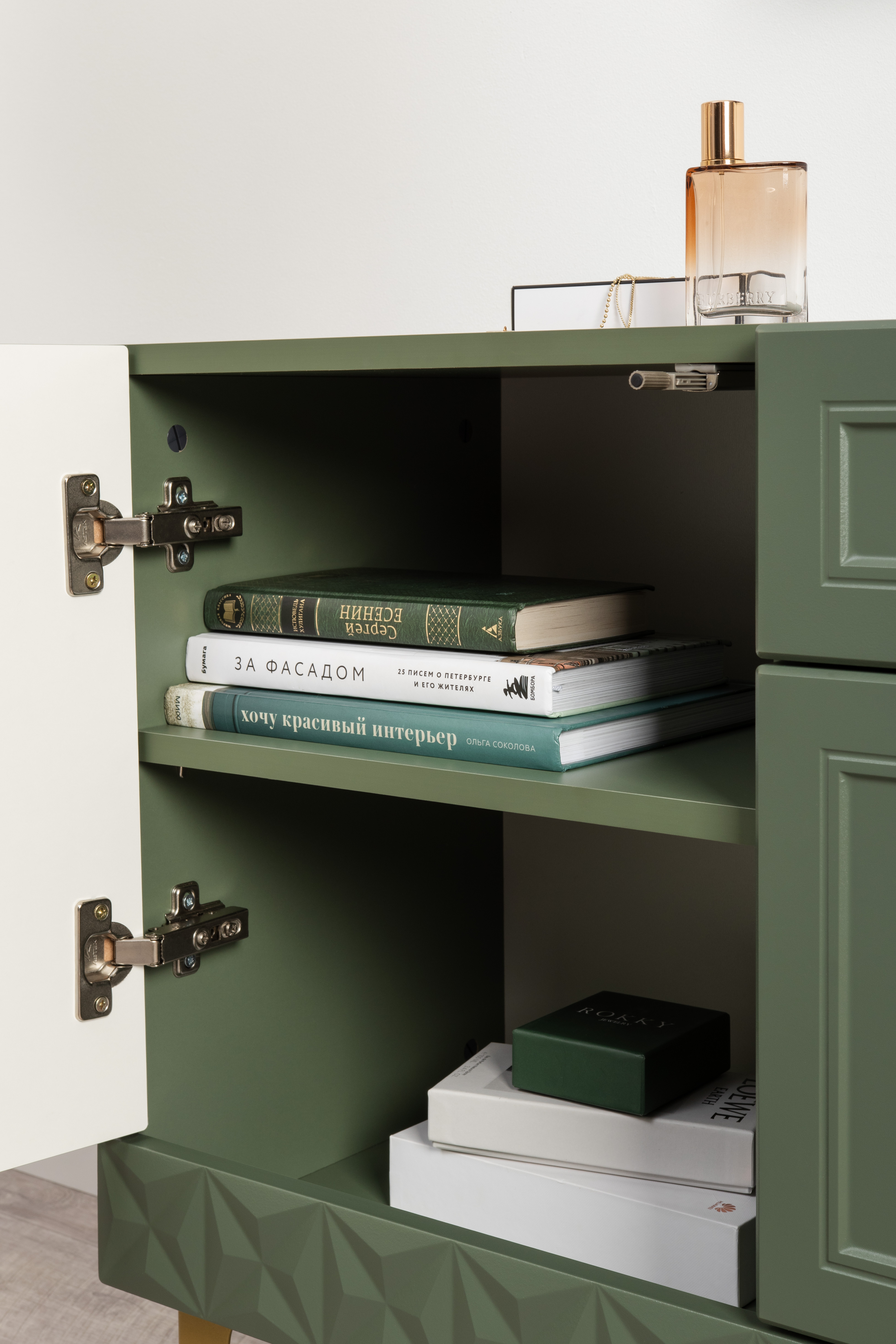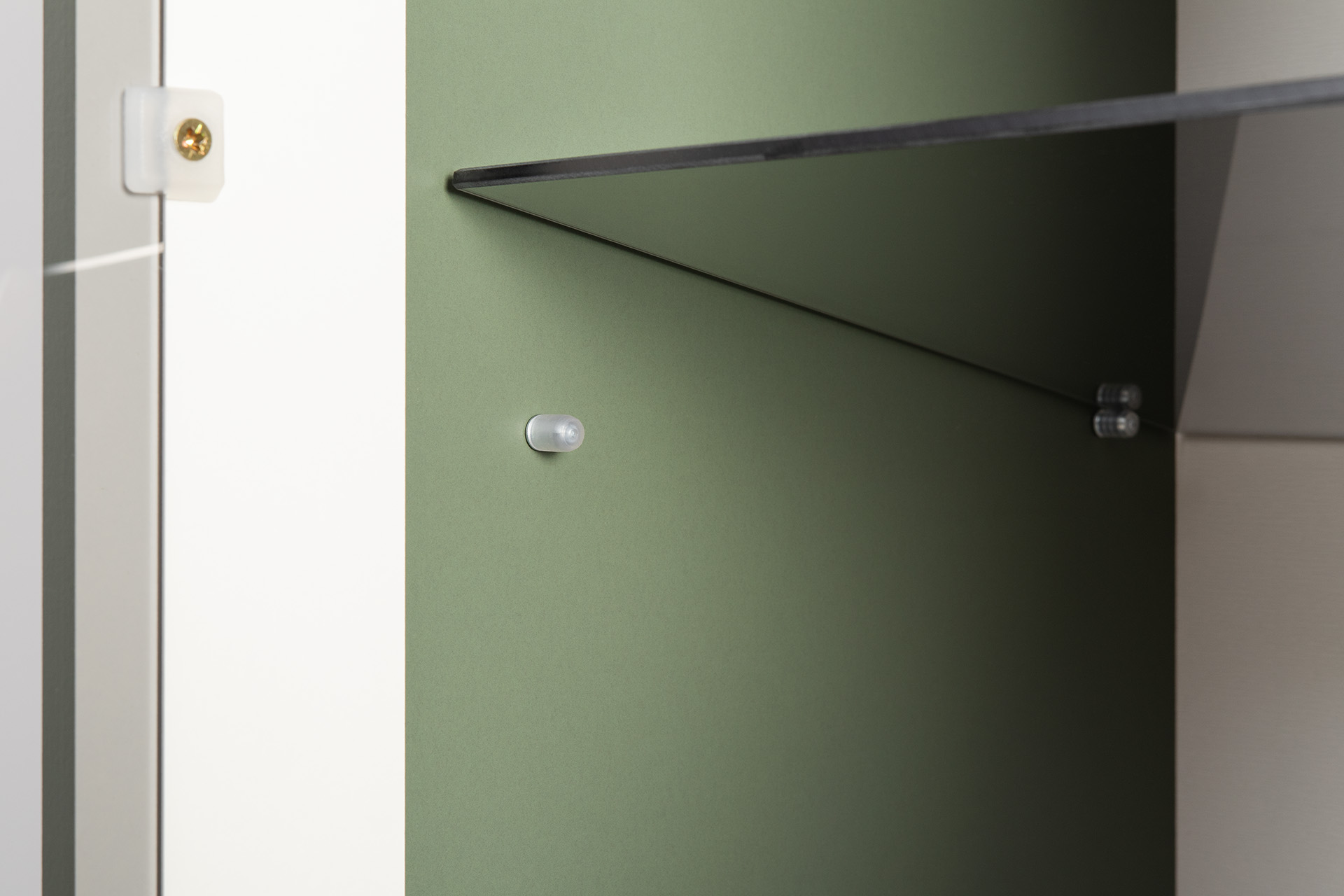 Изящные линии, глубокая фрезеровка фасадов из МДФ и благородные оттенки. Утончённая «Слоновая кость» и изысканная «Олива Шагрень» с глубоким зелёным тоном — создают атмосферу уюта, тепла и благородства. Металлические ручки и опоры золотого цвета придают мебели утончённый блеск, а петли и направляющие с доводчиками обеспечивают плавное и бесшумное закрытие фасадов.