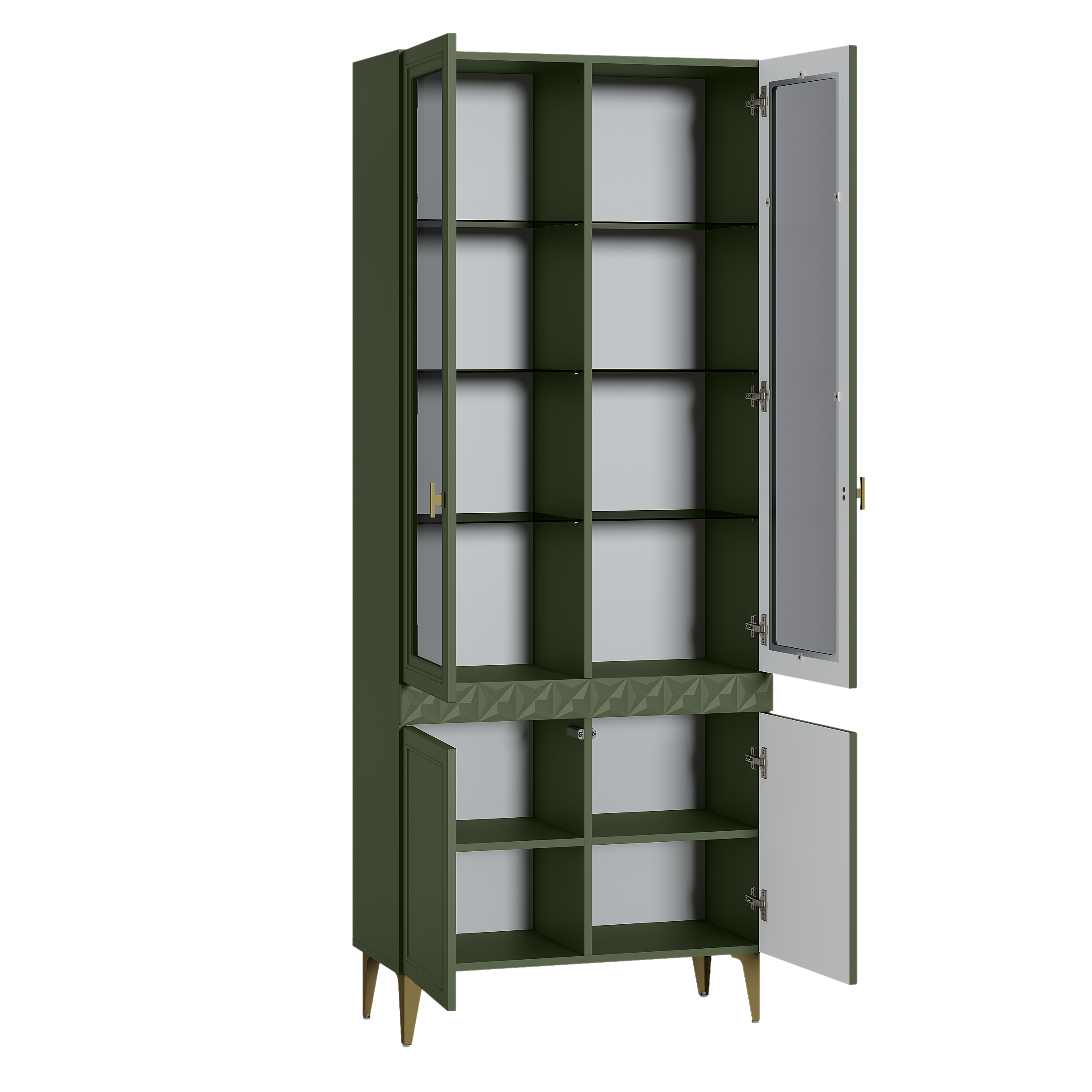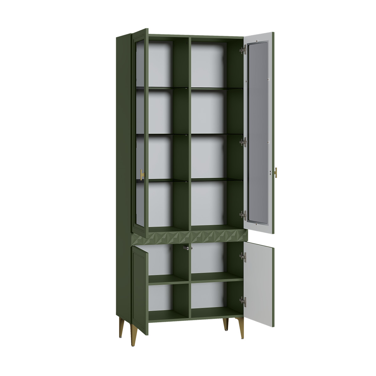 В коллекции представлены три типа витрин с тонированным закалённым стеклом, которые придают пространству лёгкость и свет. «Марион» — идеальное сочетание традиций и актуального дизайна в каждой детали.