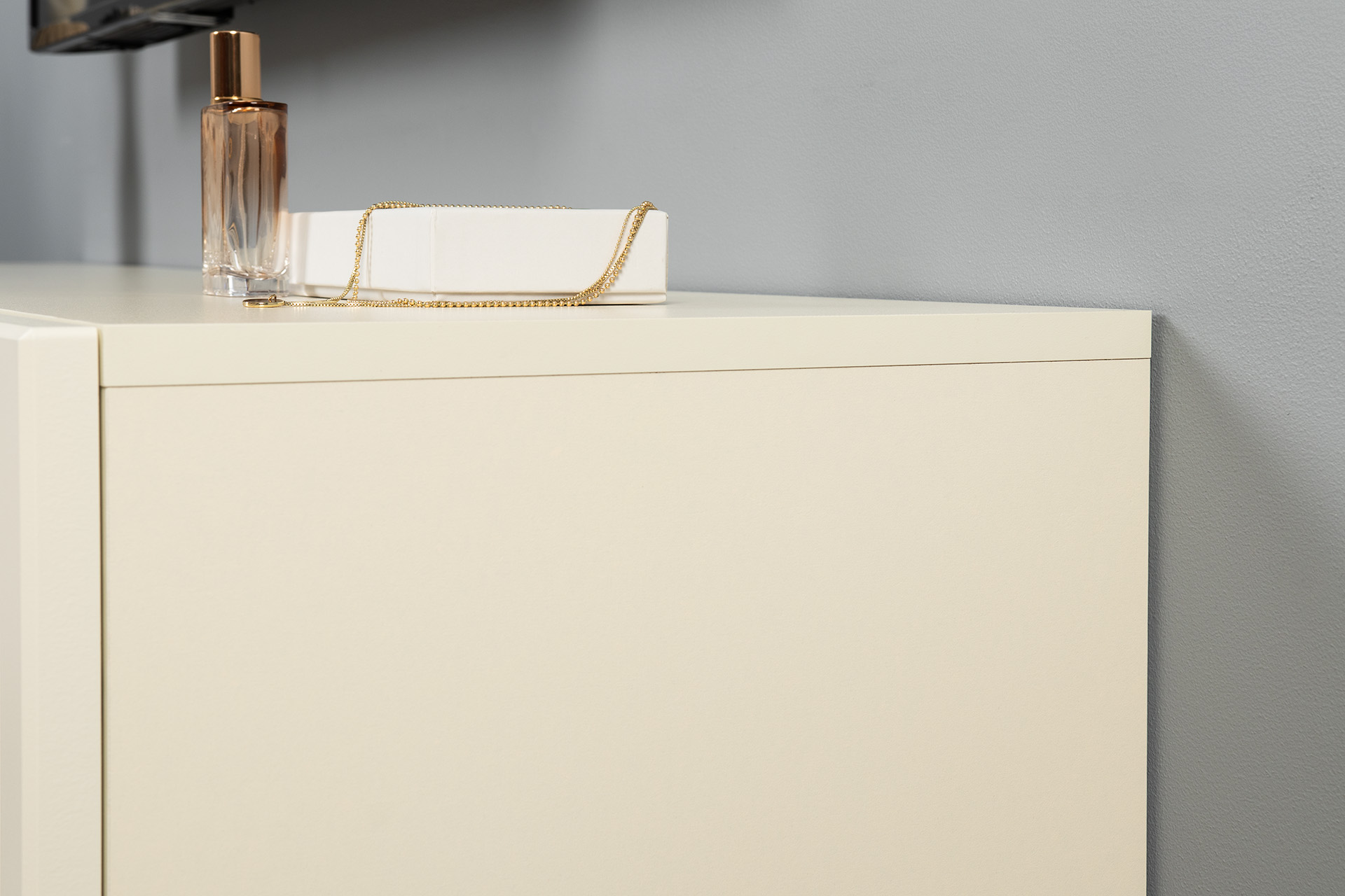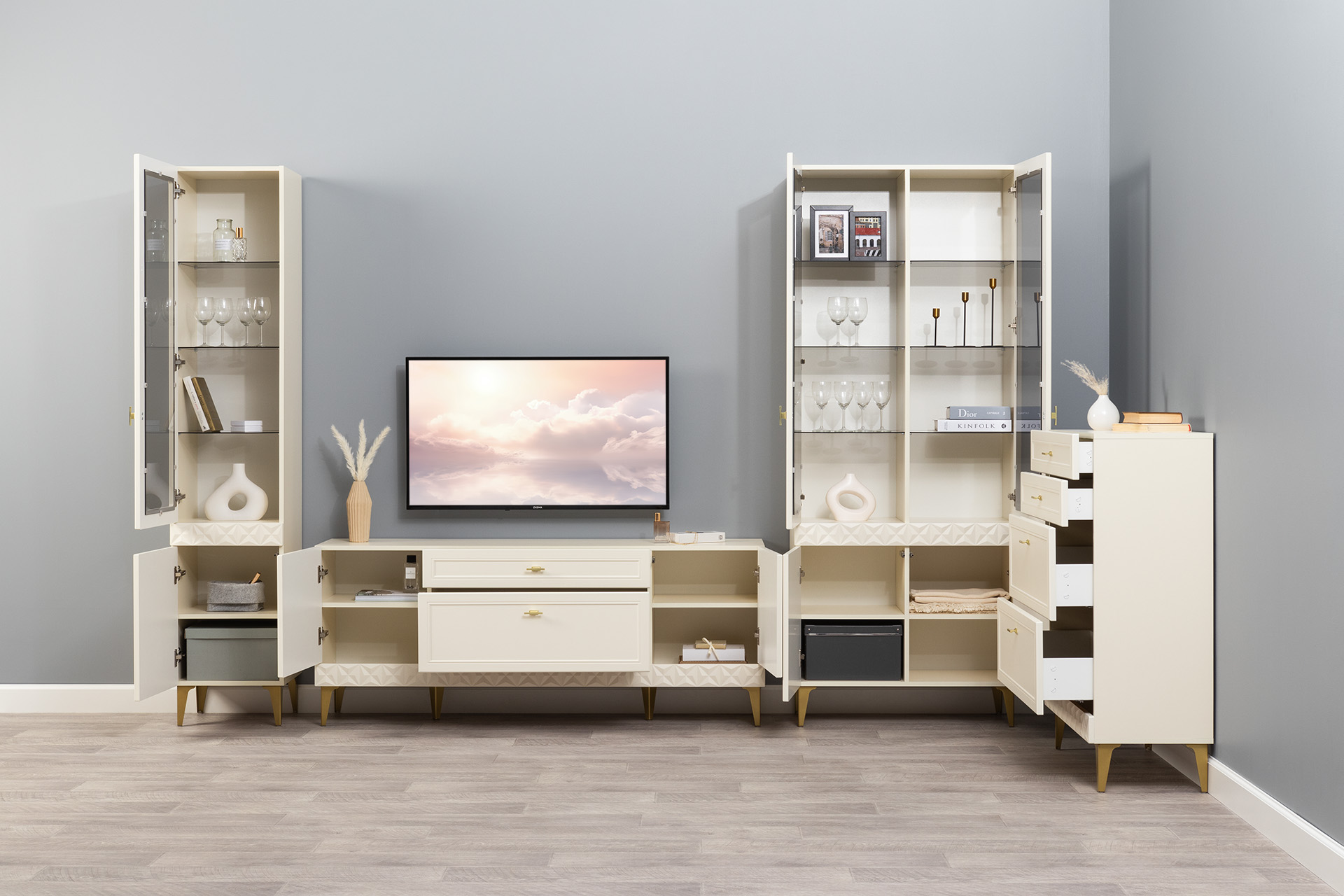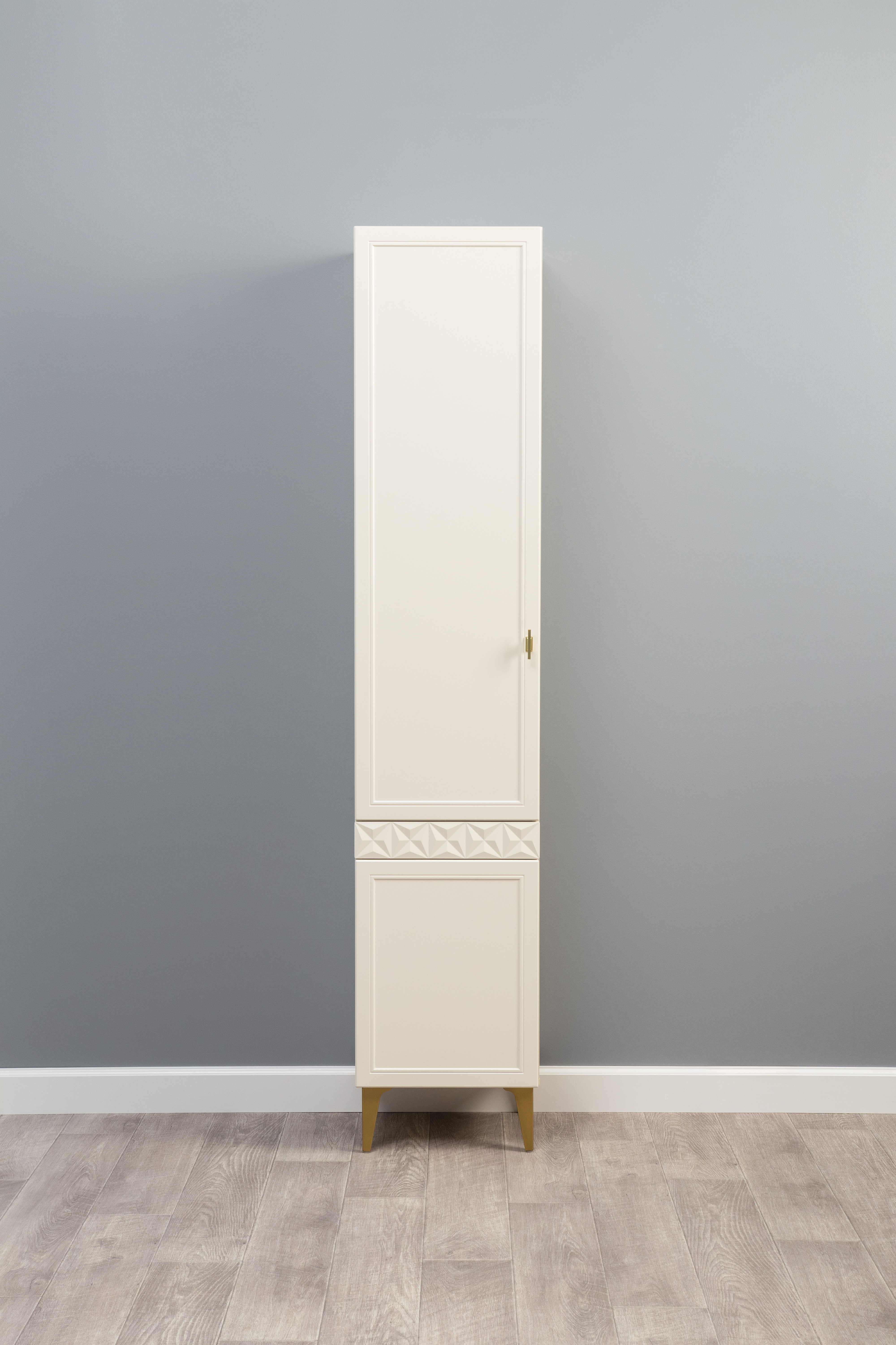 Изящные линии, глубокая фрезеровка фасадов из МДФ и благородные оттенки. Утончённая «Слоновая кость» и изысканная «Олива Шагрень» с глубоким зелёным тоном — создают атмосферу уюта, тепла и благородства. Металлические ручки и опоры золотого цвета придают мебели утончённый блеск, а петли и направляющие с доводчиками обеспечивают плавное и бесшумное закрытие фасадов.