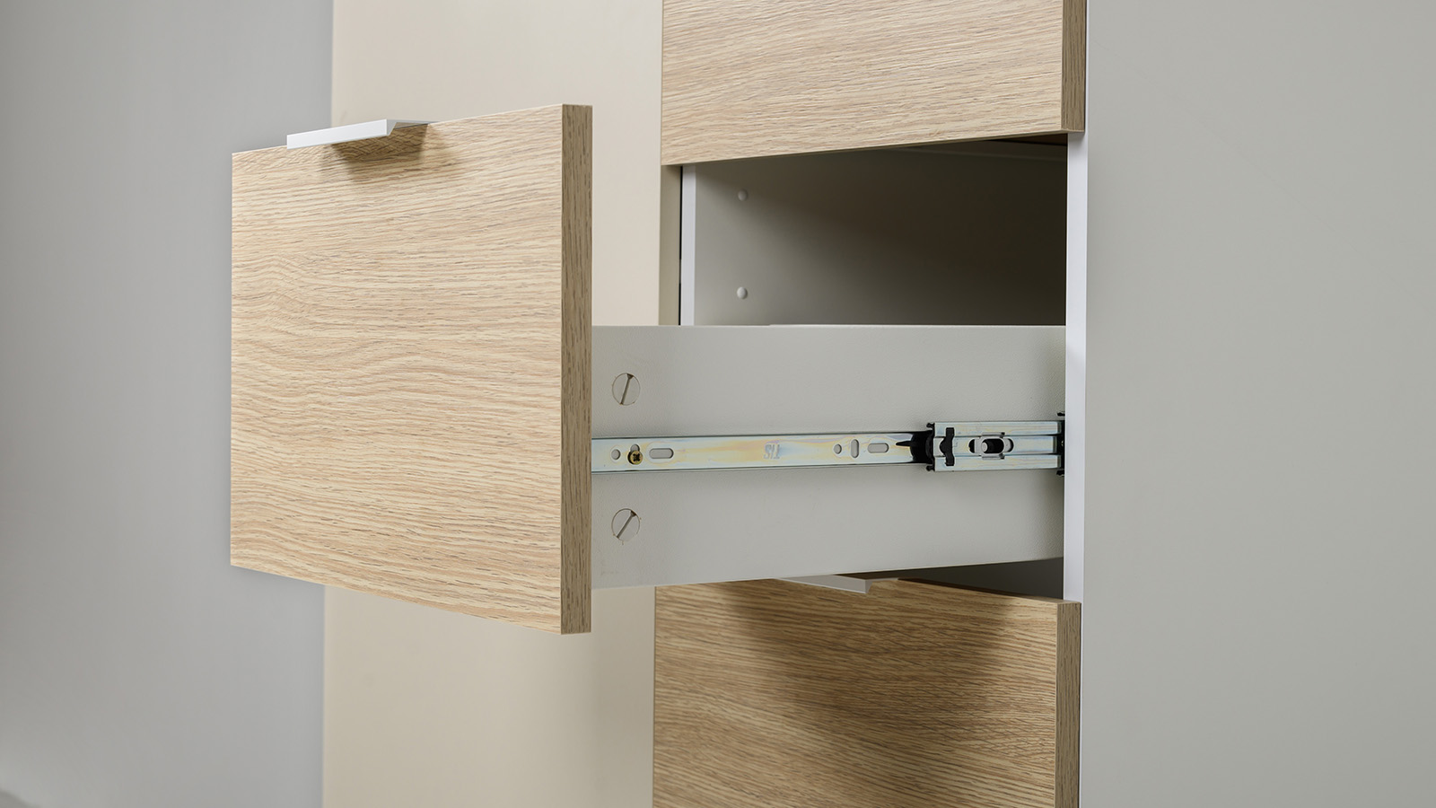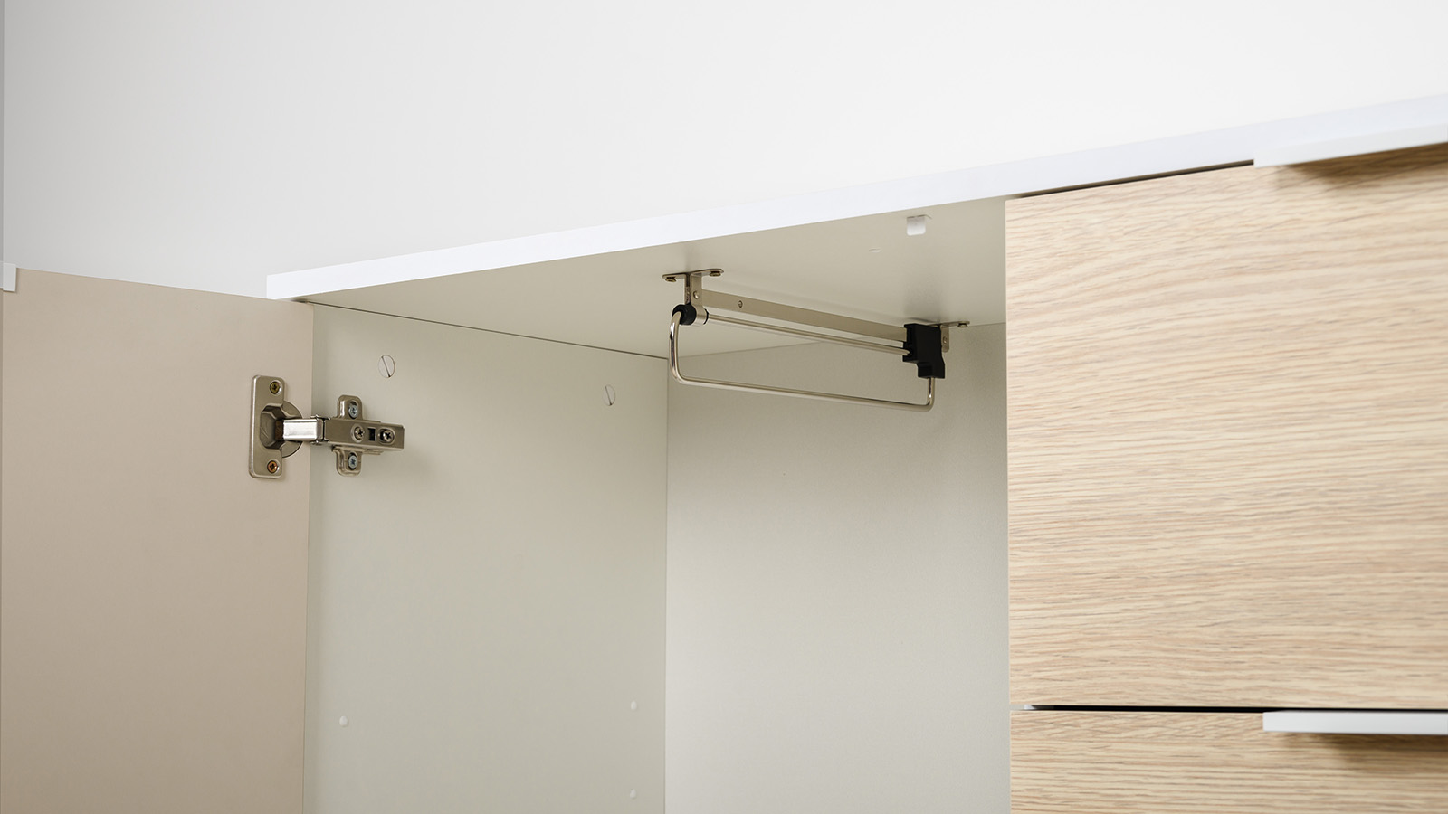 Все вещи ребёнка будут на своём месте. На столе есть крепление для рюкзака или наушников. Наполнение шкафов для одежды можно менять на выбор: полки либо штанги. Петли фасадов оснащены доводчиками.