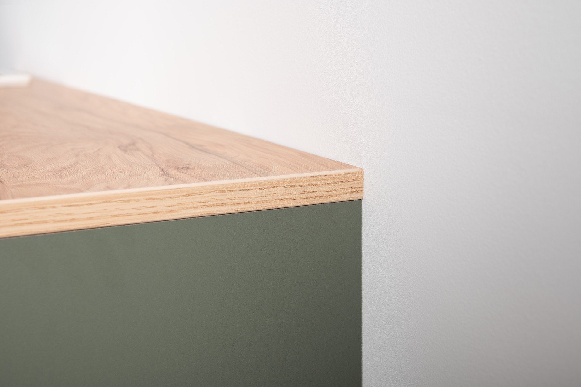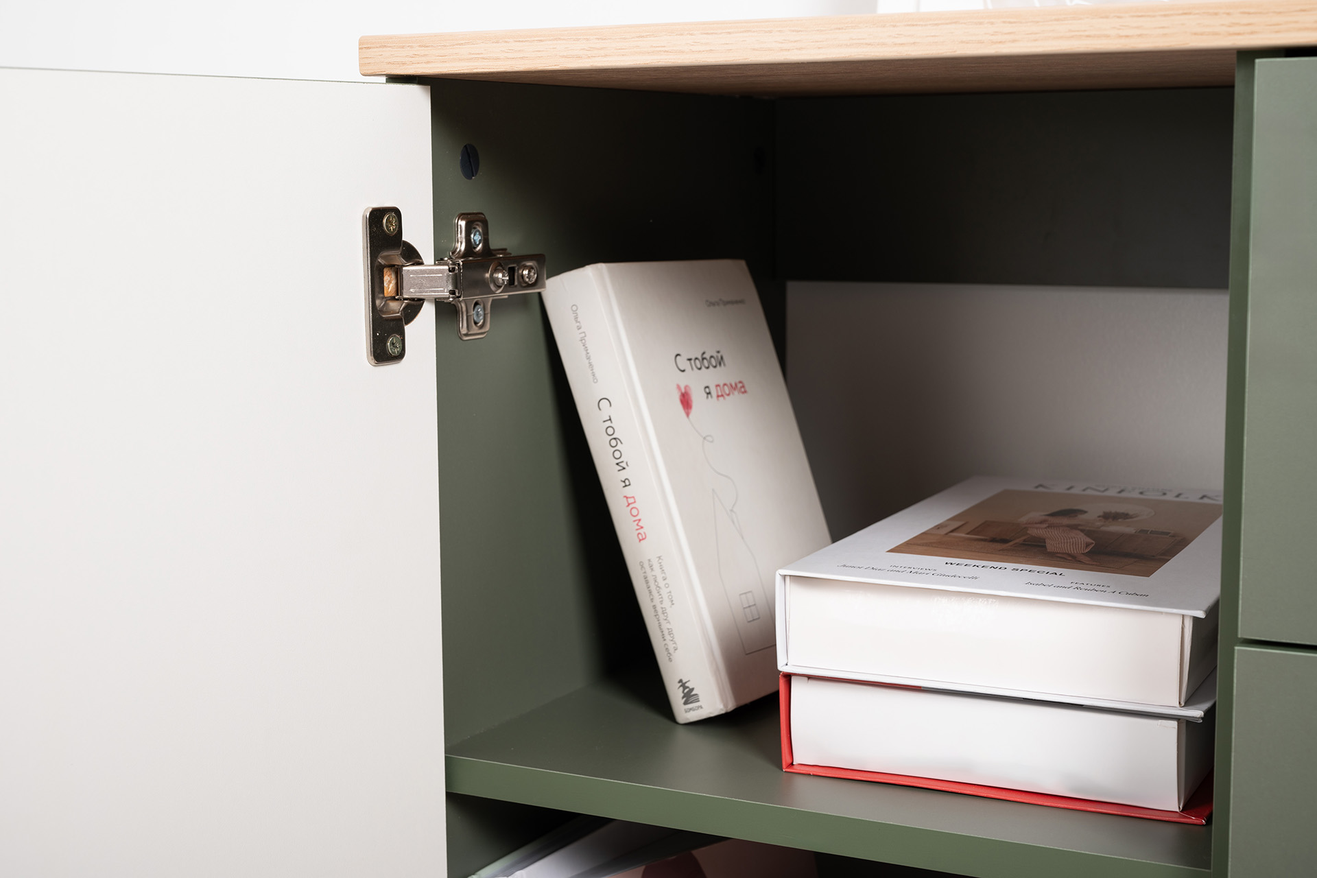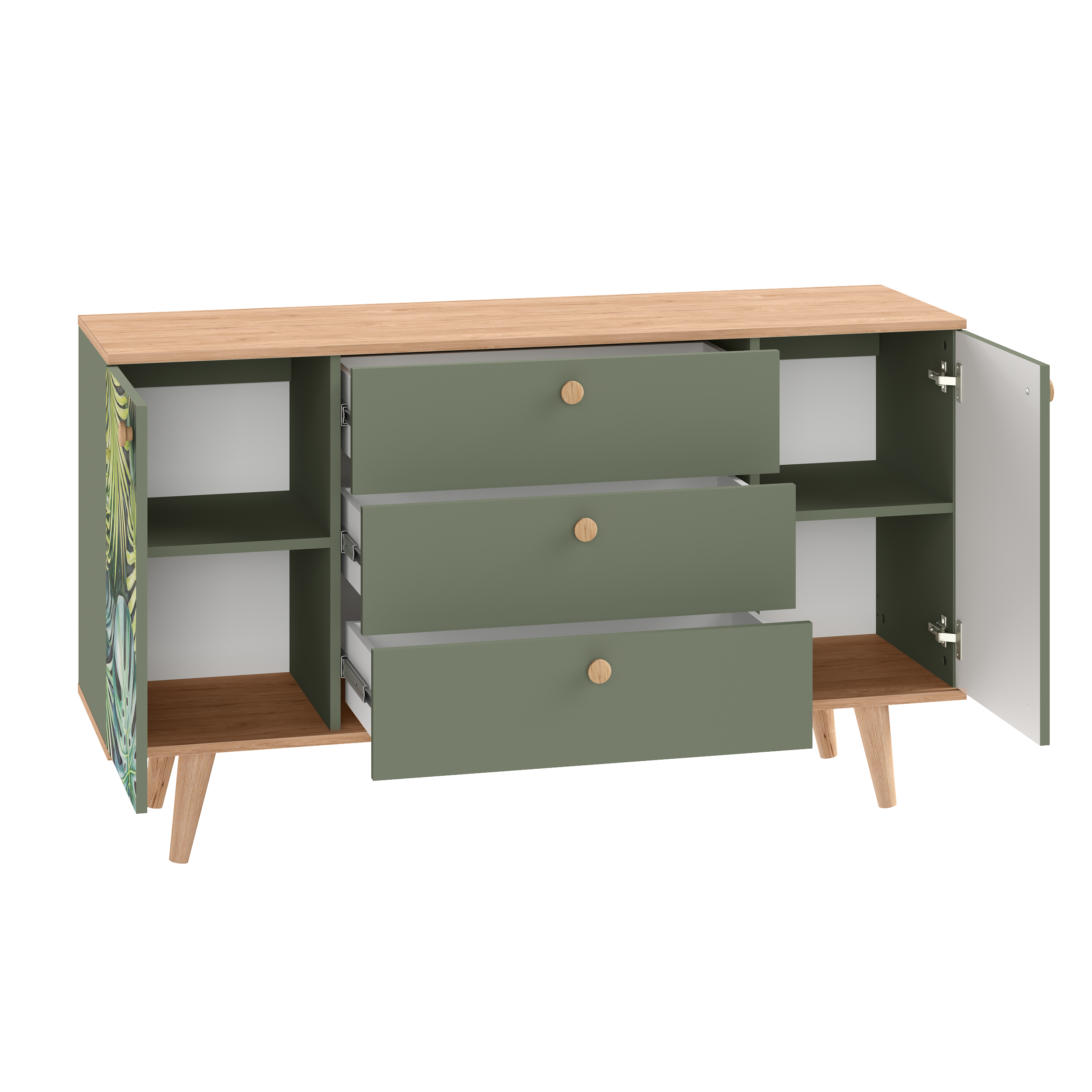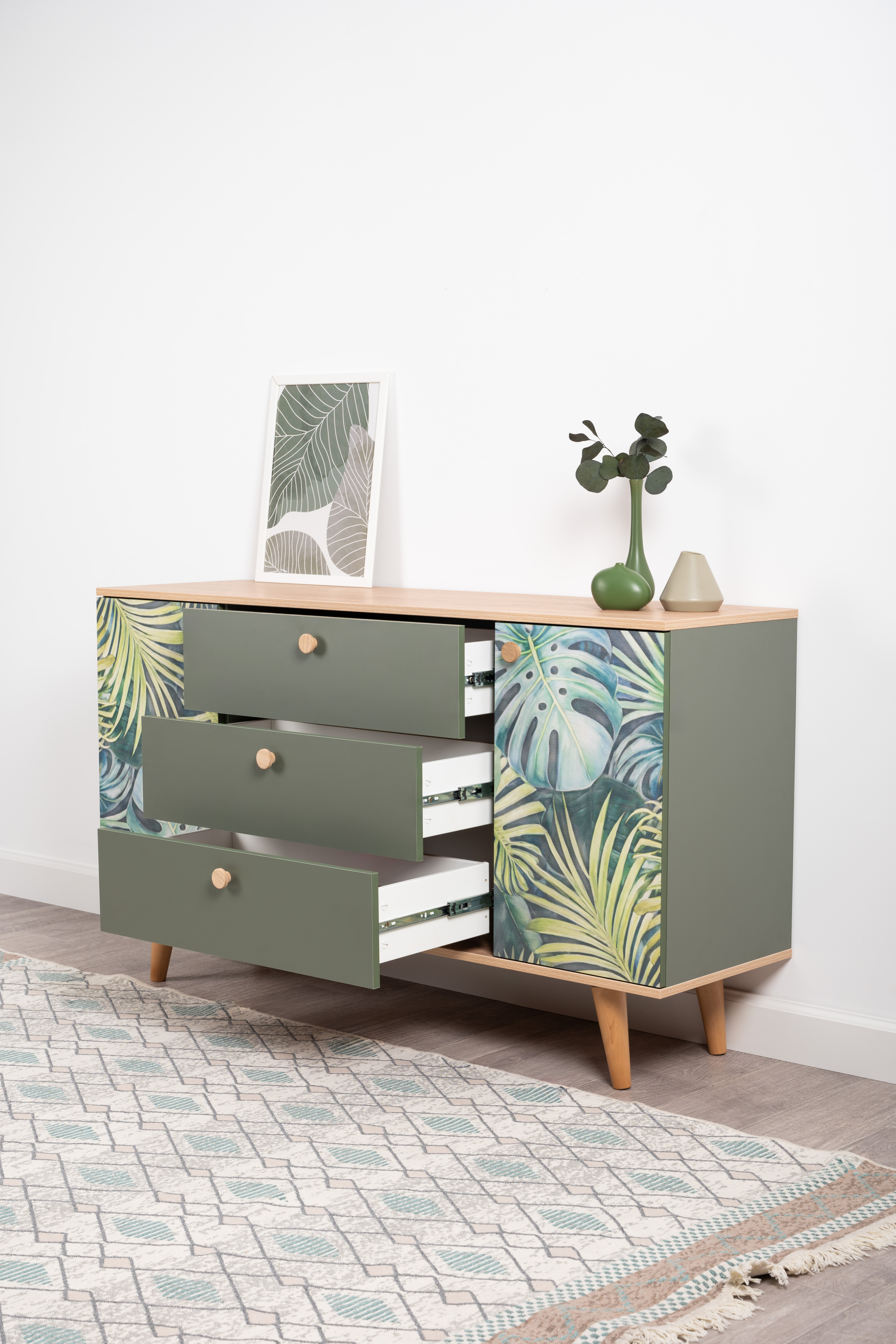 Комод Маттиас 16.245 дымчатый зеленый K521, гикори рокфорд натуральный KO86 PW, белый PE шагрень, фотопечать