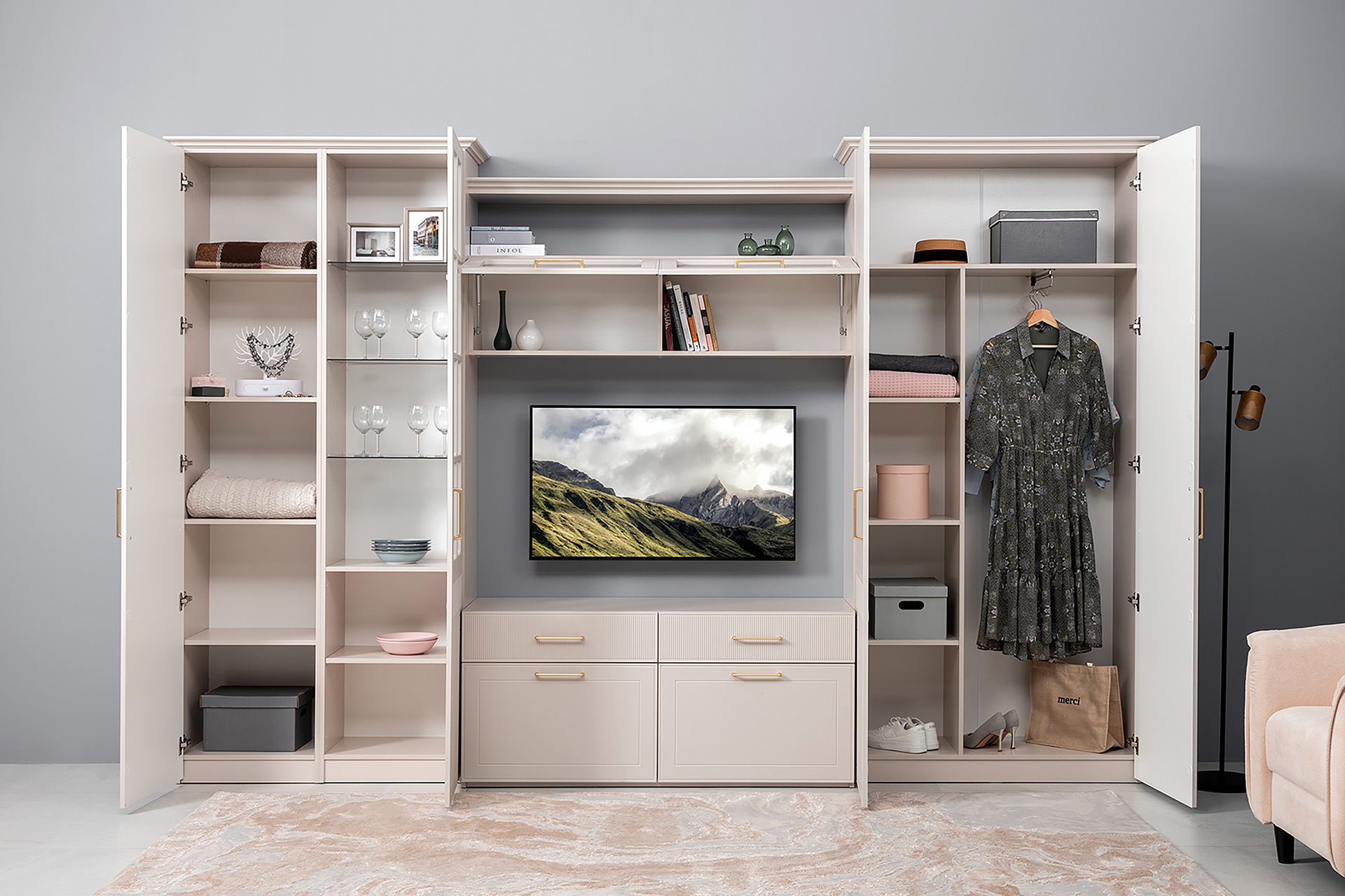 Петли с доводчиками, полное выдвижение ящиков, выдвижная штанга в шкафу для одежды и съемные полки делают использование максимально комфортным.