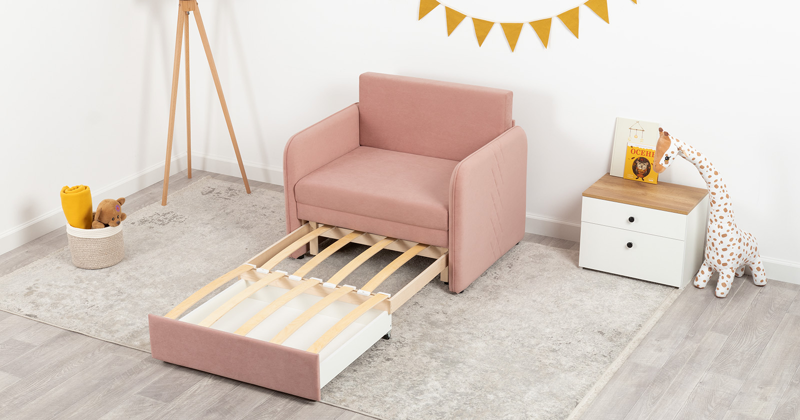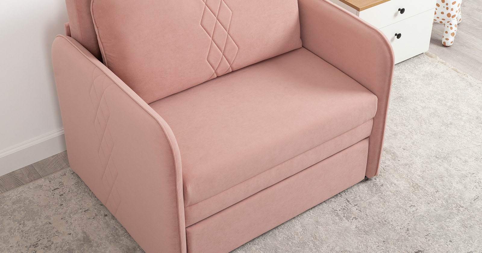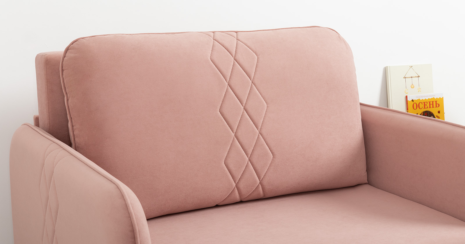 Стильный компактный диван для детской и гостиной. При своих скромных размерах он трансформируется в полноценное спальное место для детей и подростков. Лаконичный дизайн в виде декоративной стежки подчеркивает фактуру велюра, а небольшие размеры позволят разместить его в любом пространстве.