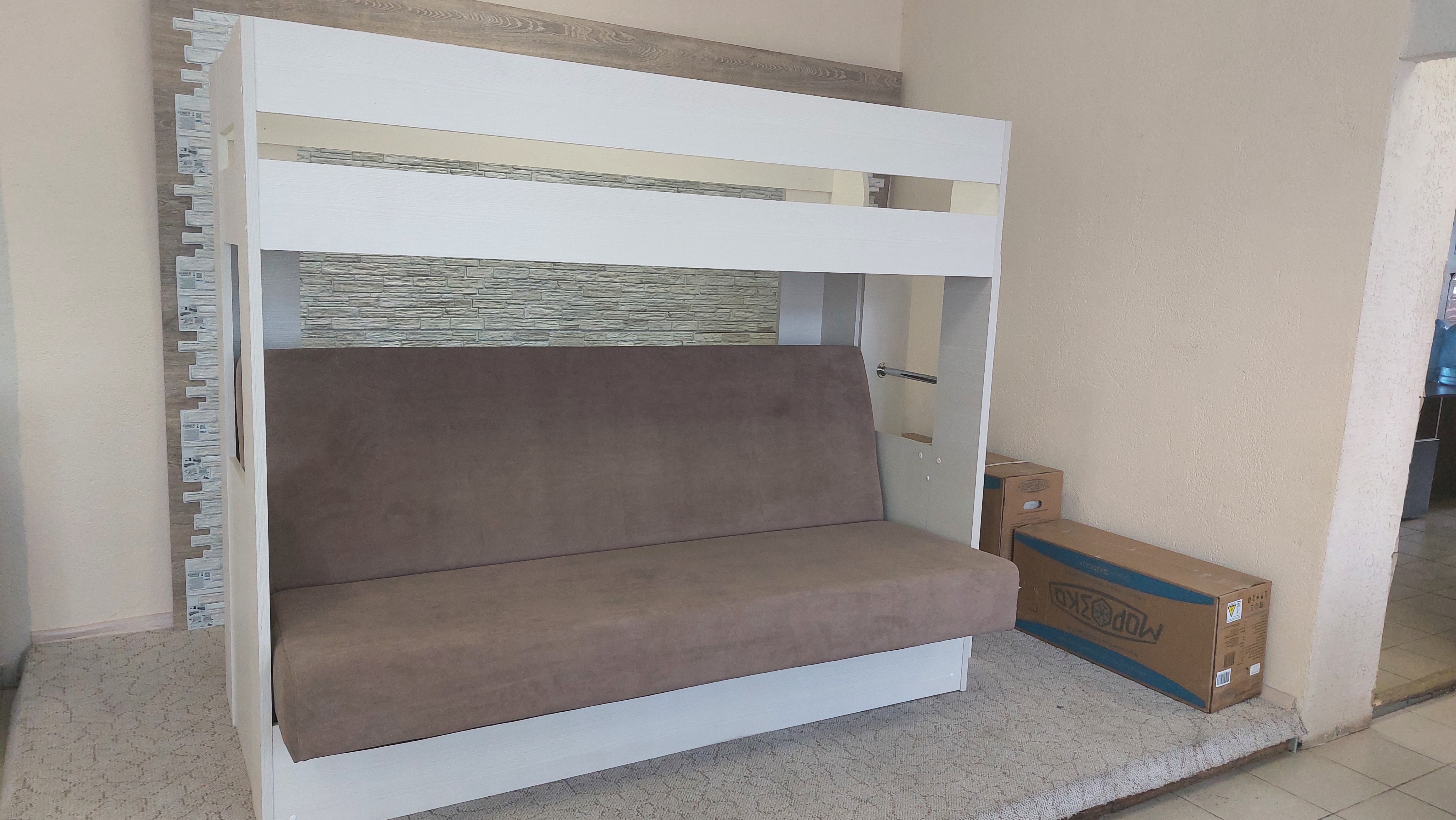 Диван раскладывается, сборка у кровати универсальная: Вы можете установить лестницу как справа, так и слева.