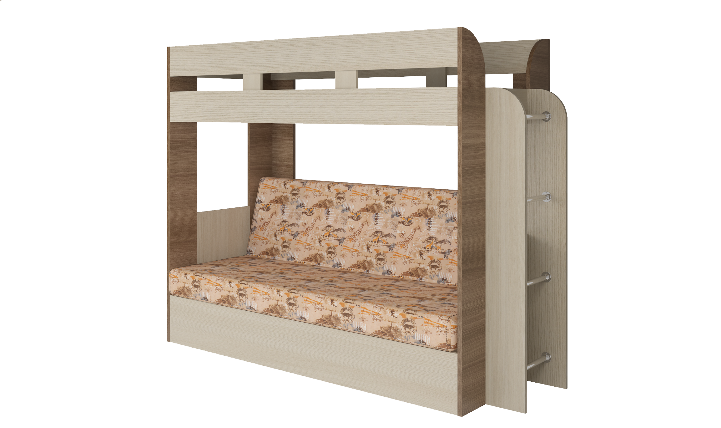 Кровать детская двухъярусная Карамель 75 ясень шимо темный/светлый, диван - велюр Савана (сборка на любую сторону) спальное место верх 80х190, низ 120х185