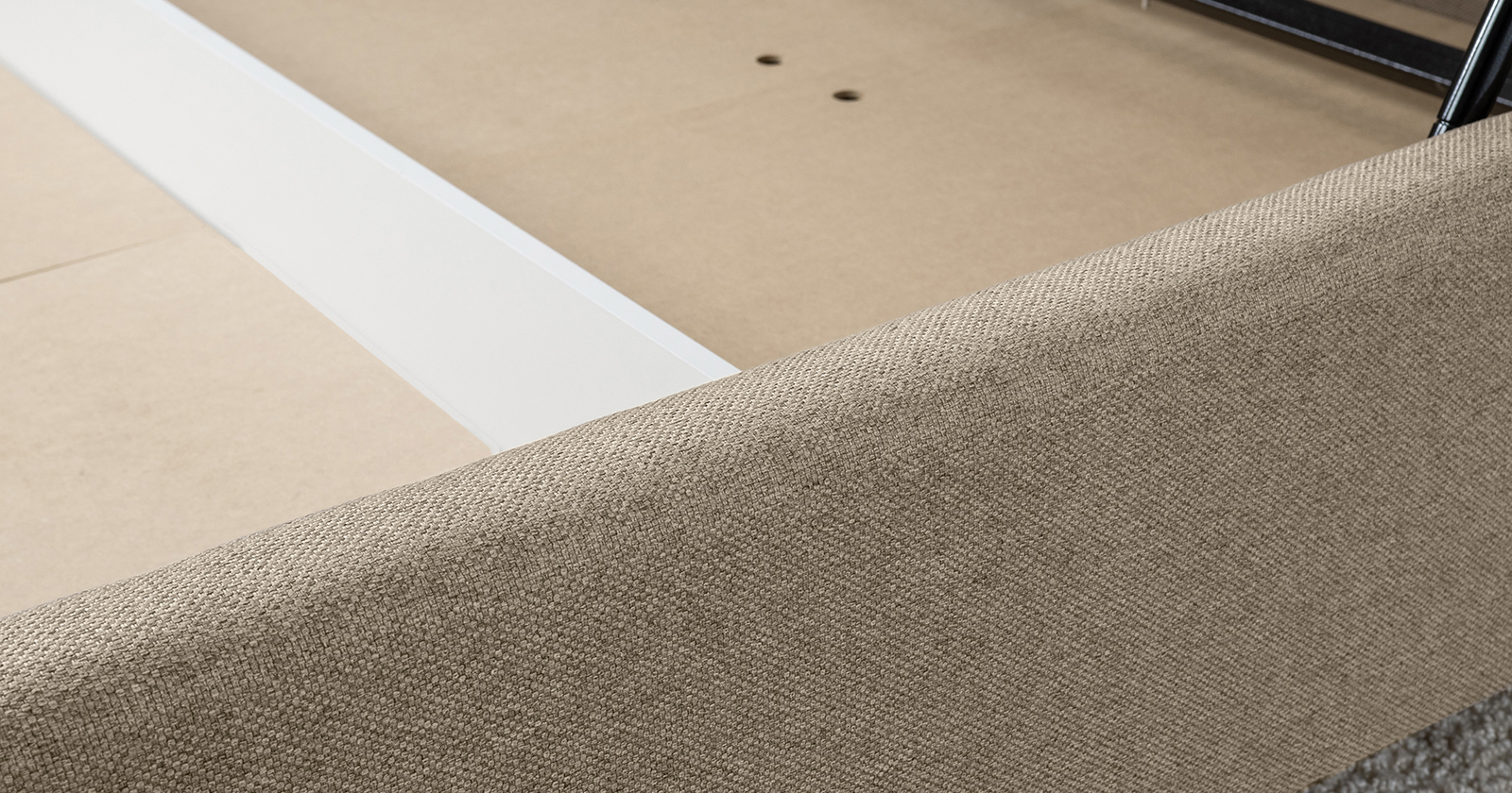 Основание кровати укомплектовано матрасодержателями. Жесткое кроватное дно из МДФ 6 мм. Задняя стенка изголовья выполнена в тех. ткани (спанбонд).