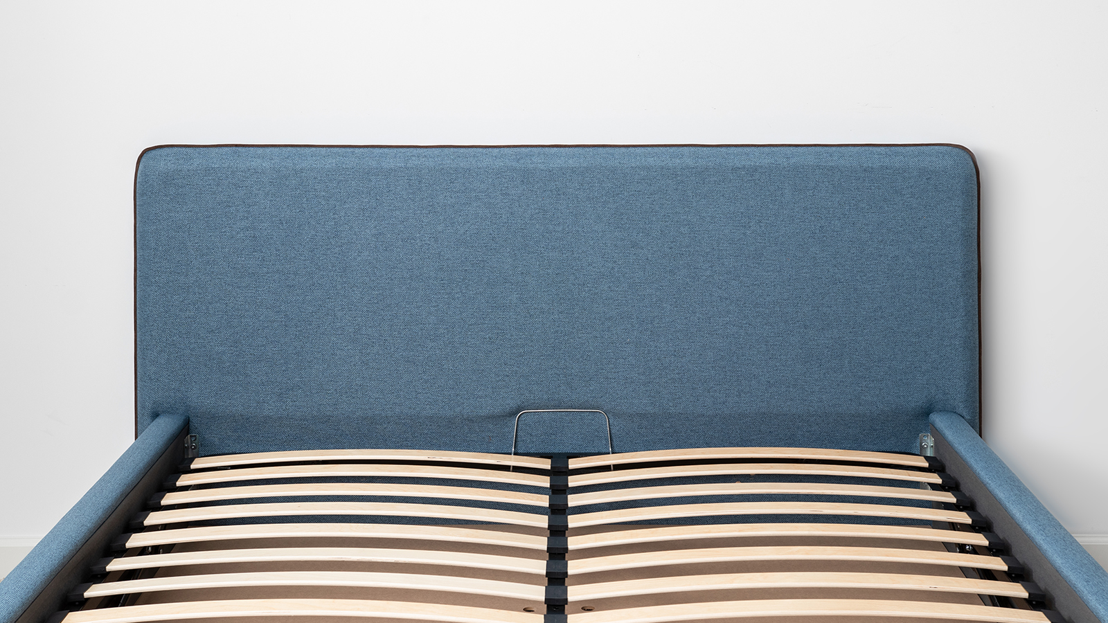 Основание кровати укомплектовано матрасодержателями. Жесткое кроватное дно из МДФ 6 мм. Задняя стенка изголовья выполнена в тех. ткани (спанбонд).