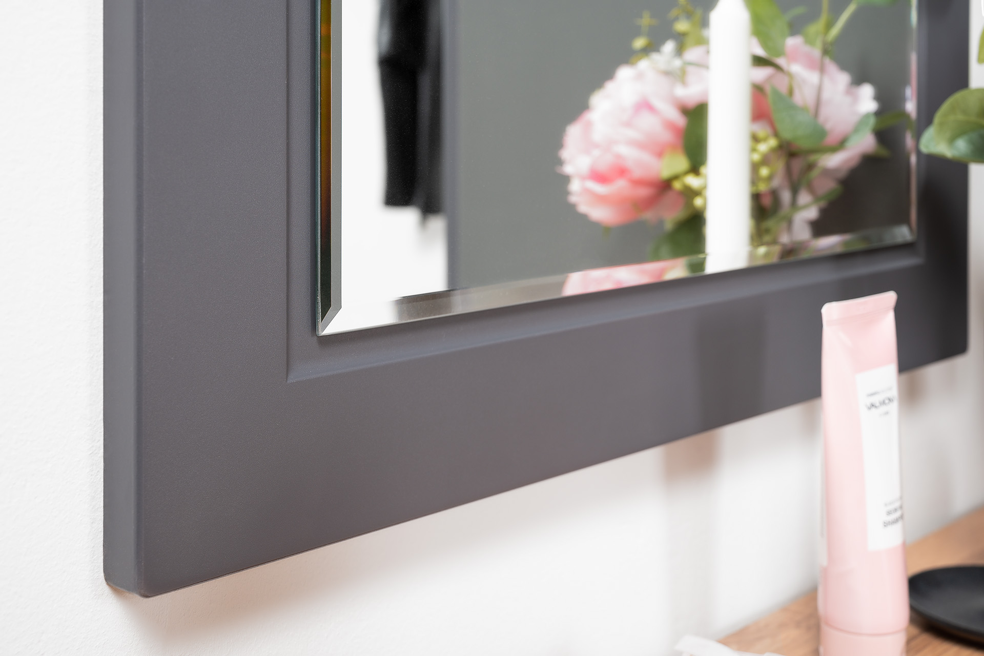 Прихожая доступна в двух цветовых решениях – белый/графит в сочетании с теплым древесным декором.