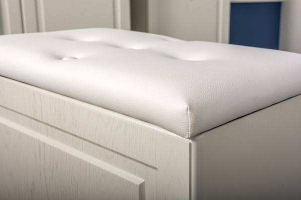Пуф на колесах, подъемная крышка. Искусственная кожа белого цвета.