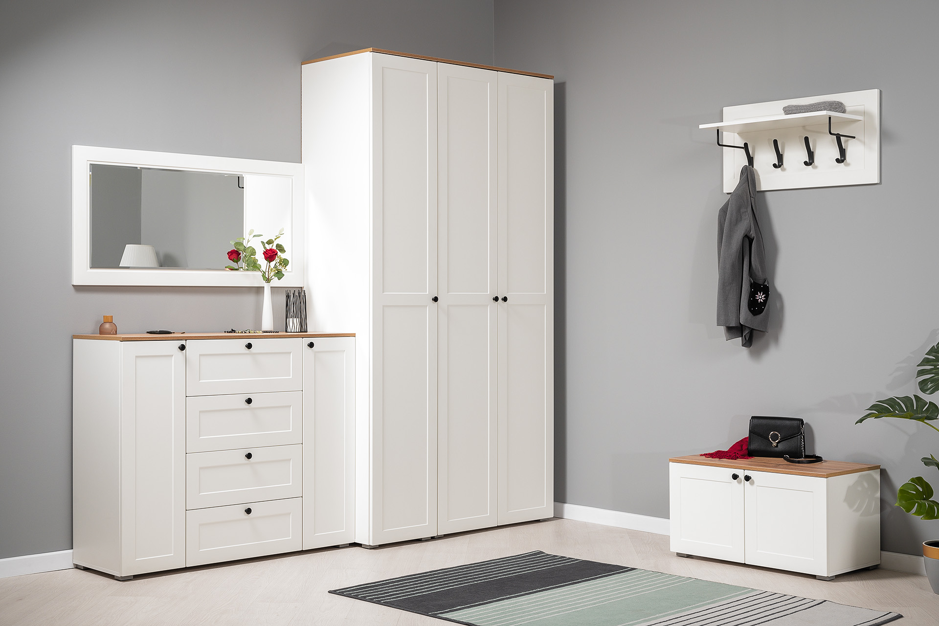 Вместительная шкафная группа позволит оптимально организовать хранение, а продуманные габариты тумбы, комода и зеркала дают возможность собрать различные компоновки.