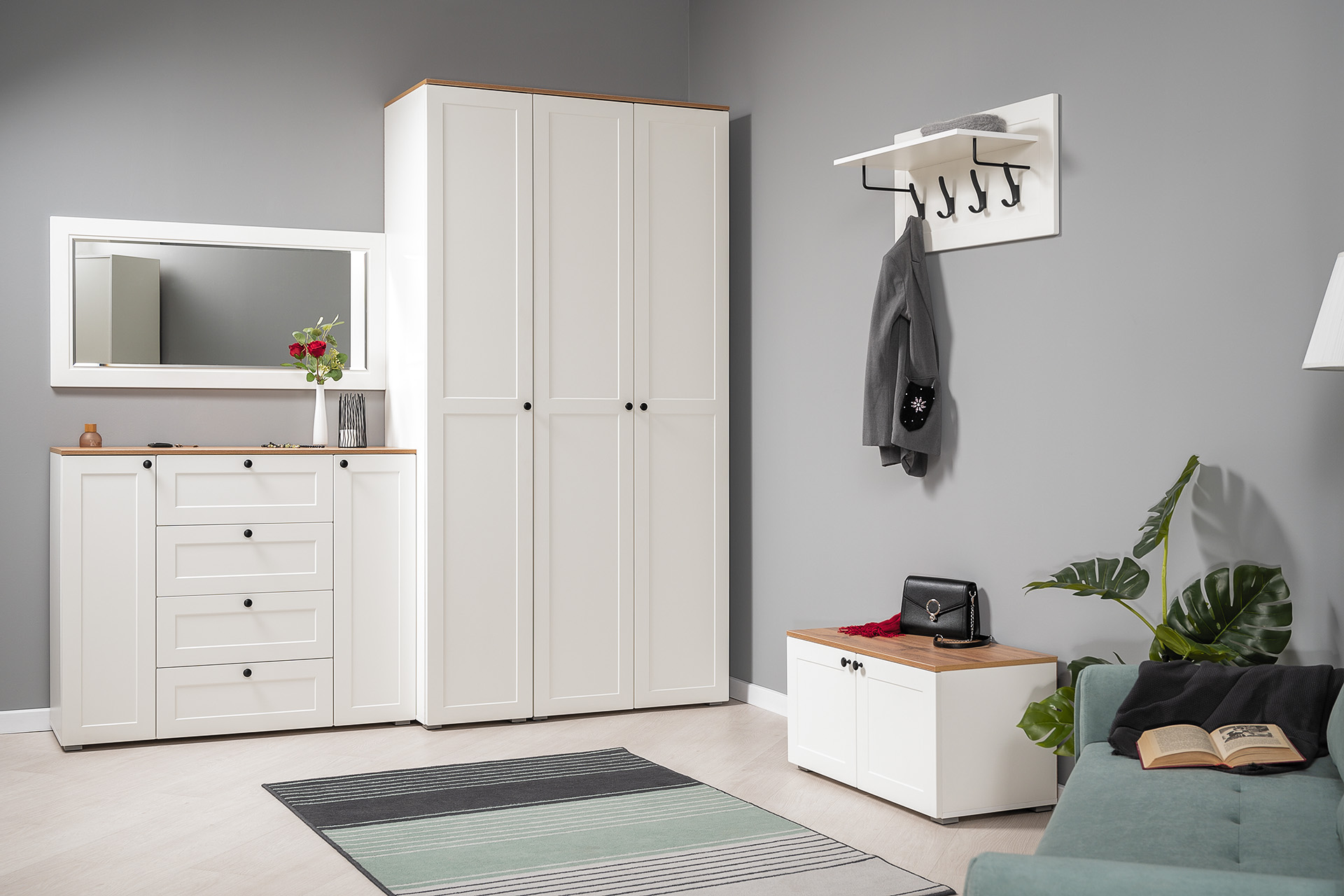 Прихожая доступна в двух цветовых решениях – белый/графит в сочетании с теплым древесным декором.
