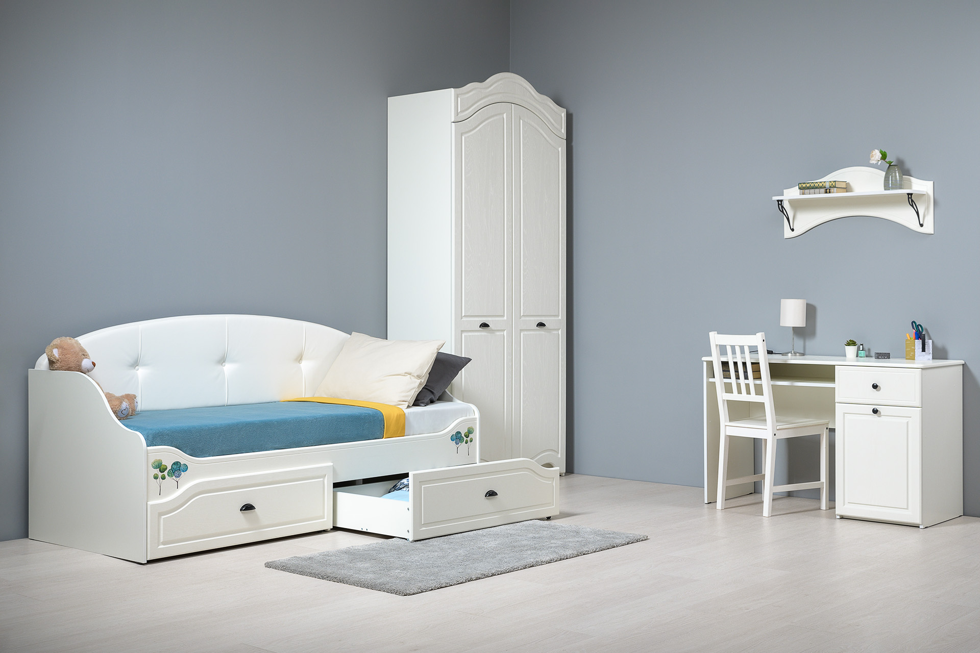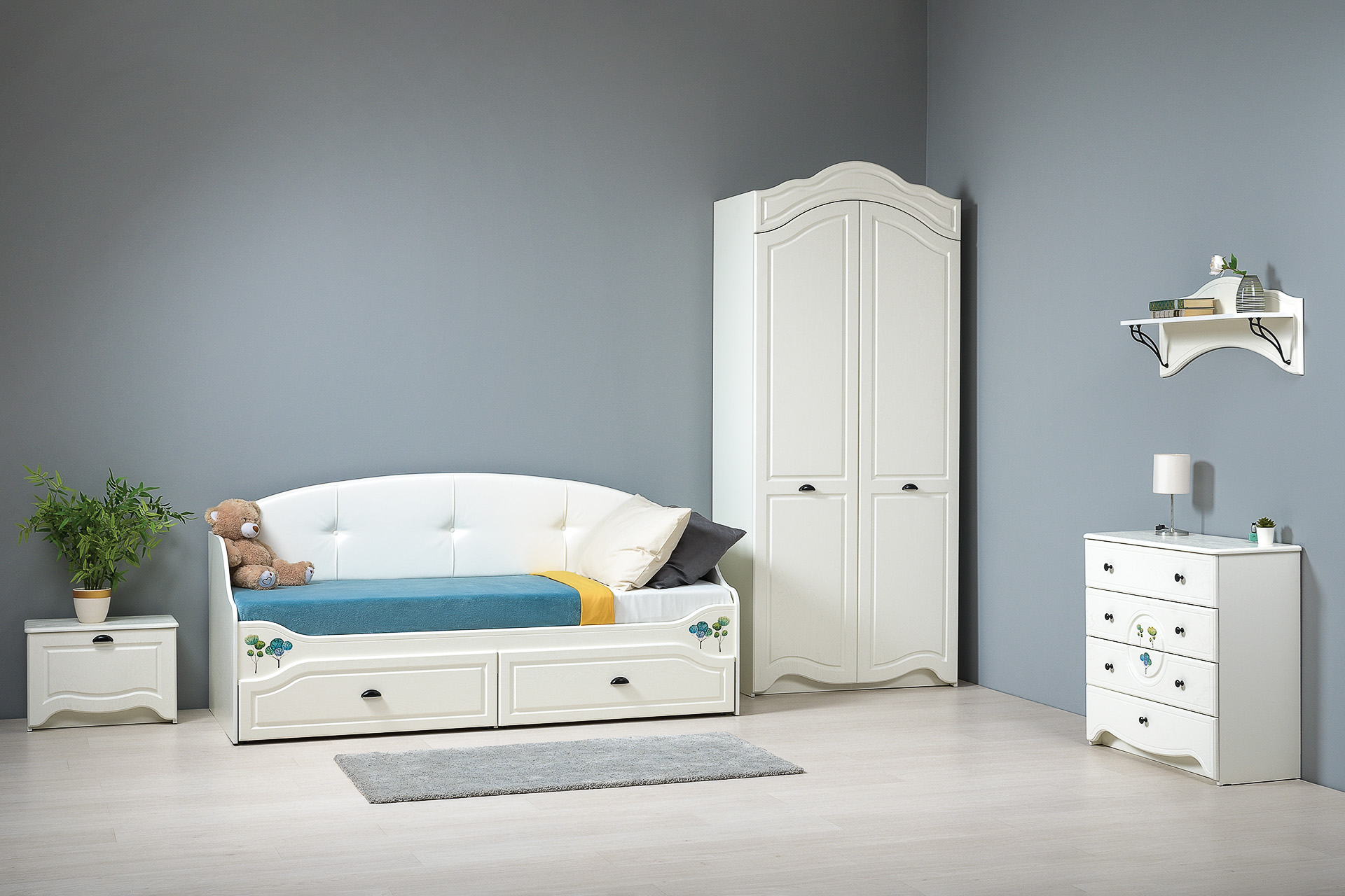 В коллекции Роуз 4 элемента с разным функционалом, которые помогут грамотно сформировать пространство детской комнаты: кровать с большим спальным местом и емкими выкатными ящиками будет шикарно смотреться при любой постановке в интерьере; вместительный комод сможет идеально распределить вещи и игрушки; просторный шкаф сохранит в порядке детский гардероб, а лаконичная, но немаловажная тумбочка отлично дополнит