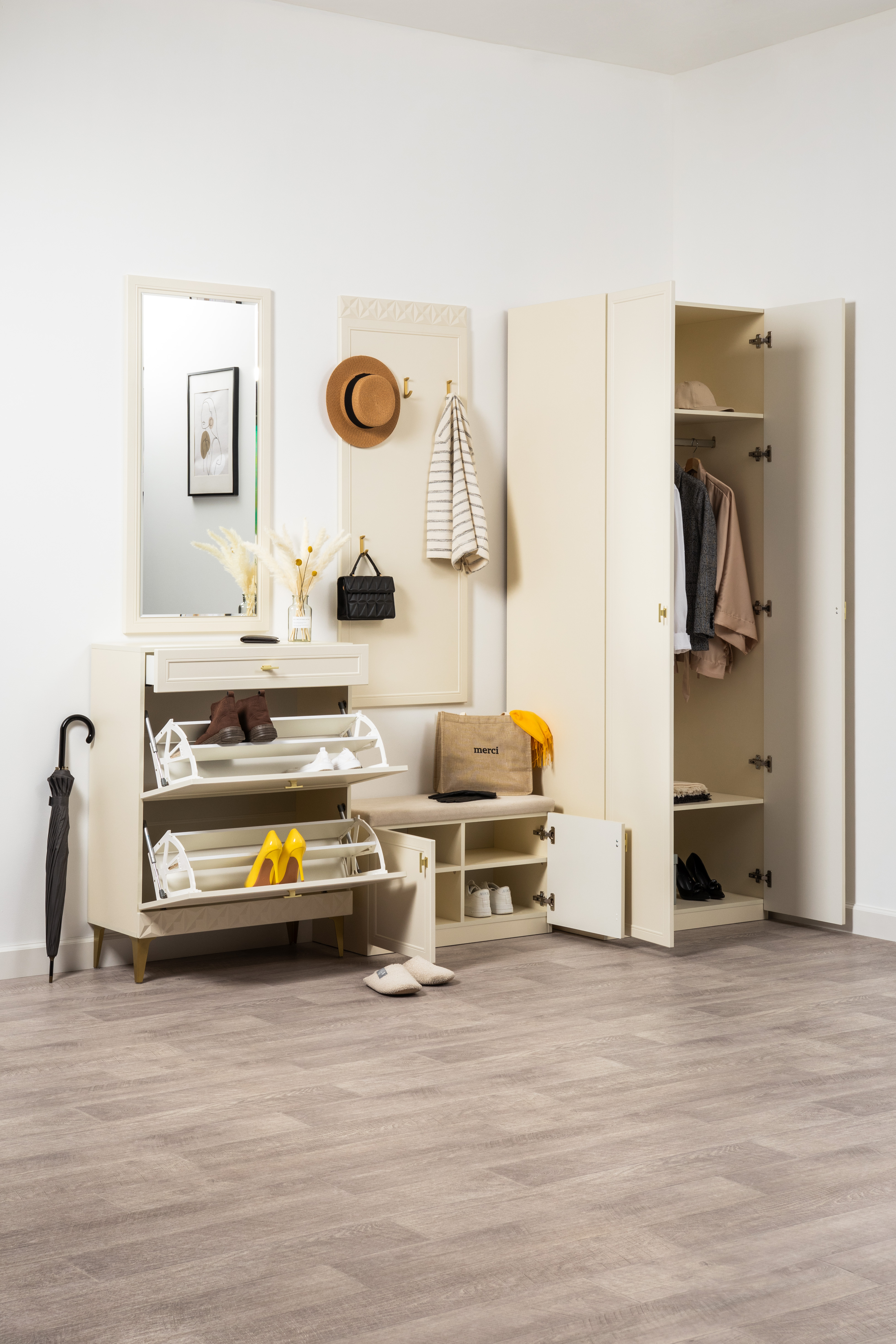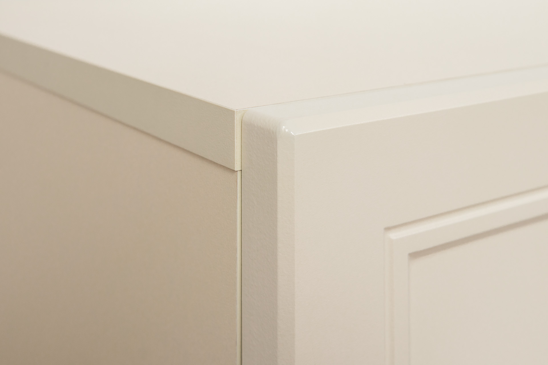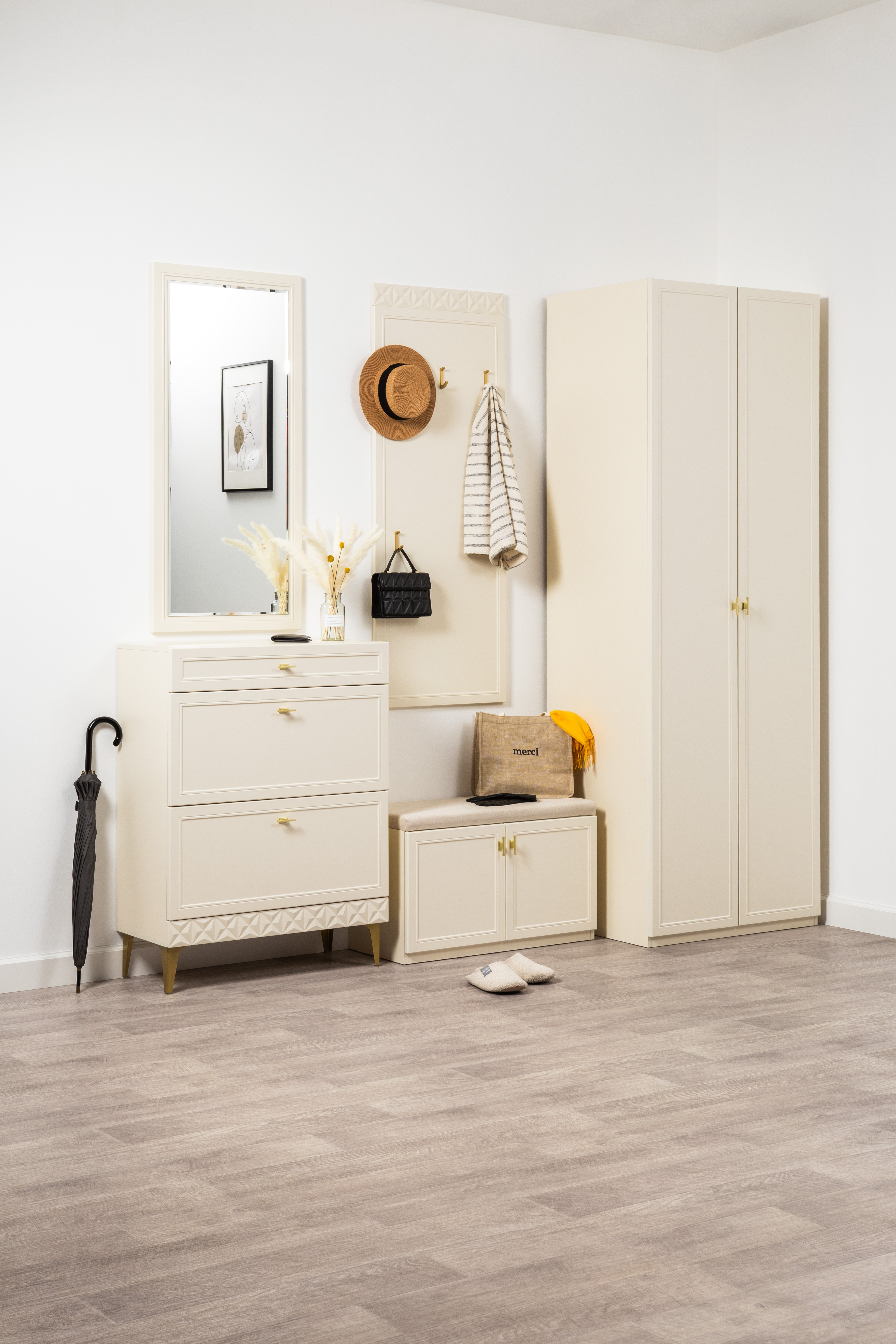 Изящные линии, глубокая фрезеровка фасадов из МДФ и благородные оттенки. Утончённая «Слоновая кость» и изысканная «Олива Шагрень» с глубоким зелёным тоном — создают атмосферу уюта, тепла и благородства. Металлические ручки и опоры золотого цвета придают мебели утончённый блеск, а петли и направляющие с доводчиками обеспечивают плавное и бесшумное закрытие фасадов.