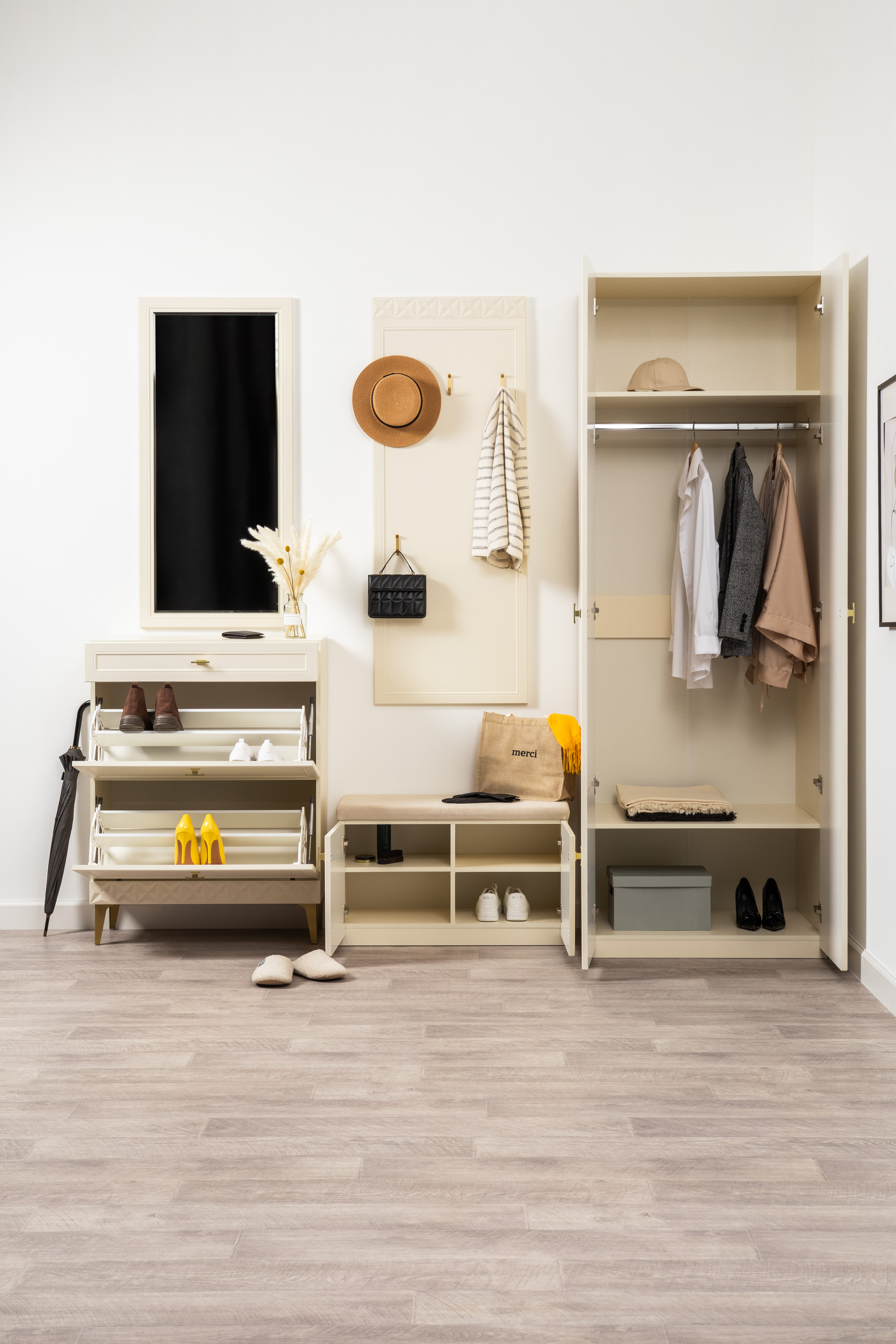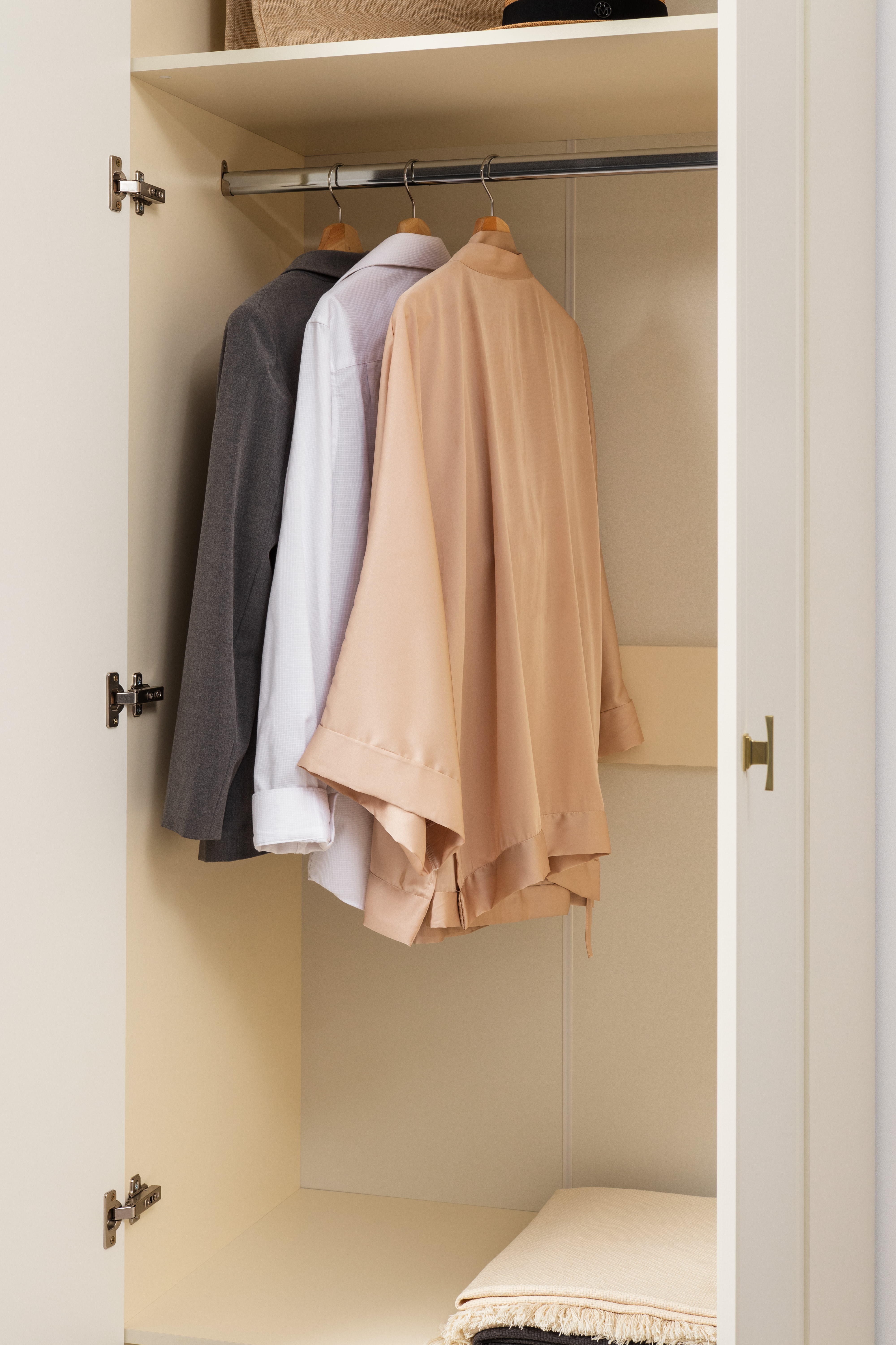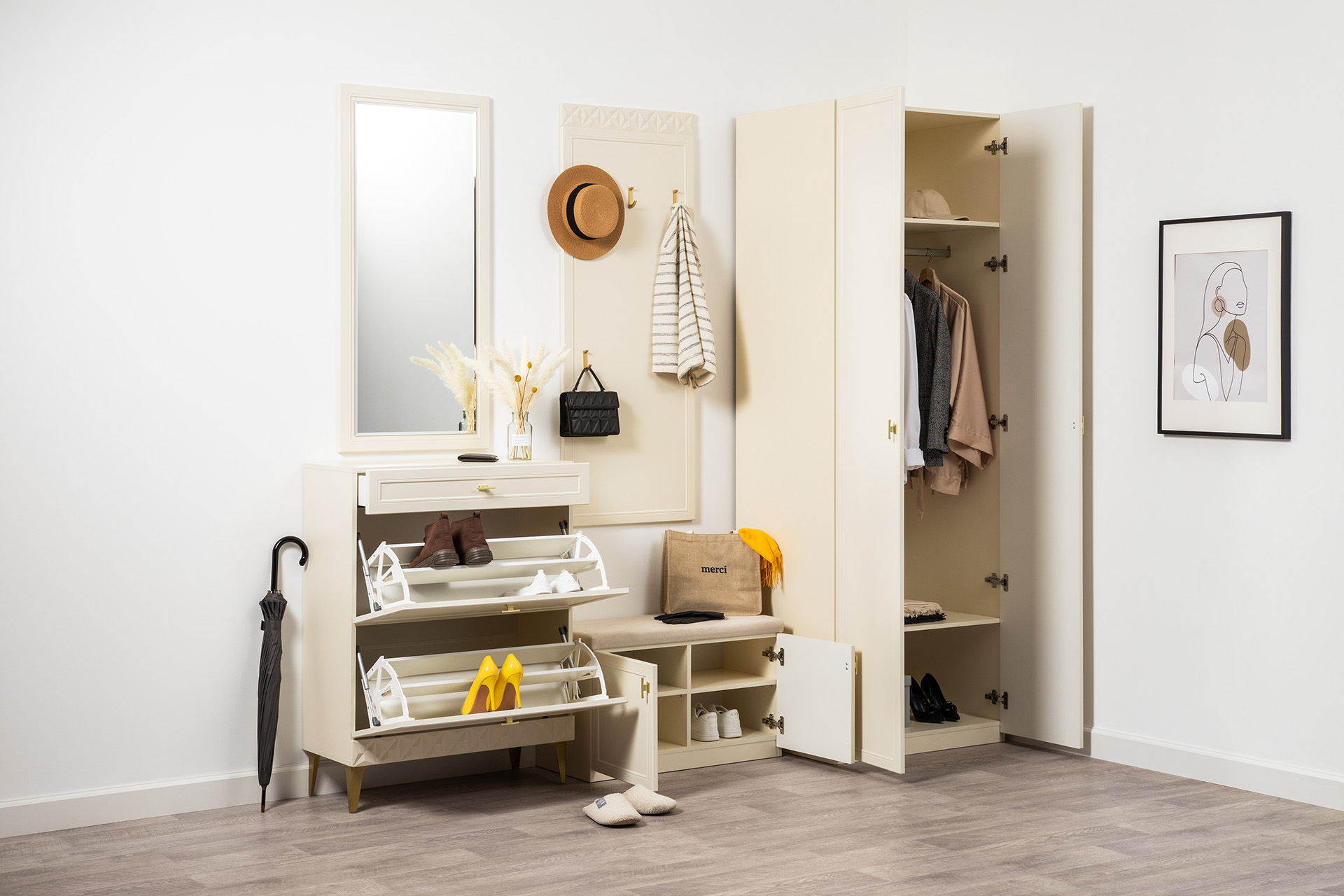 Изящные линии, глубокая фрезеровка фасадов из МДФ и благородные оттенки. Утончённая «Слоновая кость» и изысканная «Олива Шагрень» с глубоким зелёным тоном — создают атмосферу уюта, тепла и благородства. Металлические ручки и опоры золотого цвета придают мебели утончённый блеск, а петли и направляющие с доводчиками обеспечивают плавное и бесшумное закрытие фасадов.