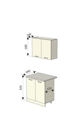 Модули в данном комплекте 40, 60 и 80 см, над плитой предусмотрен шкаф под вытяжку на 60 см.