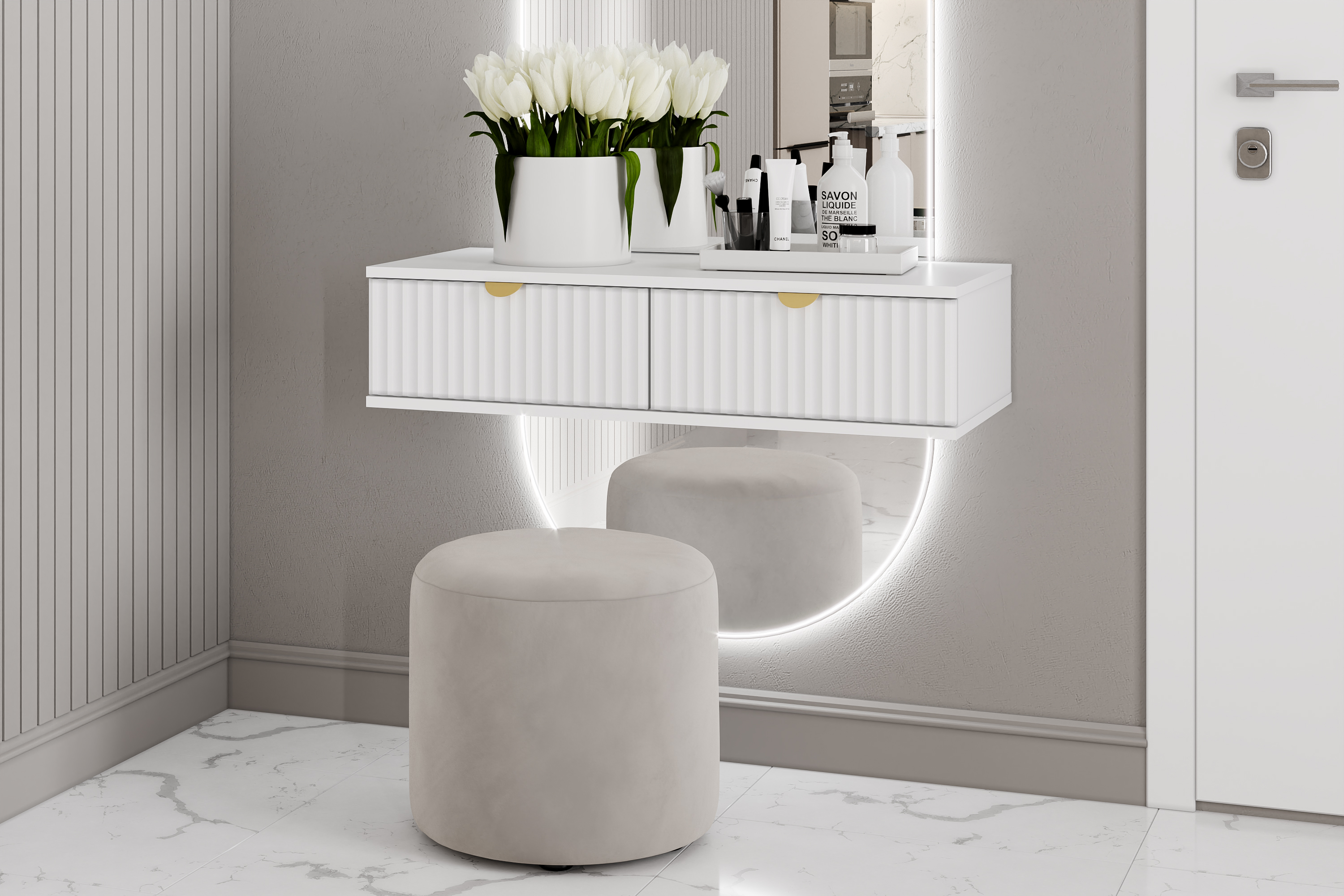 Тумба под ТВ в гостиную Петра 13.281 белый PE шагрень, милк софт ПВХ, бетон чикаго беж ПВХ
