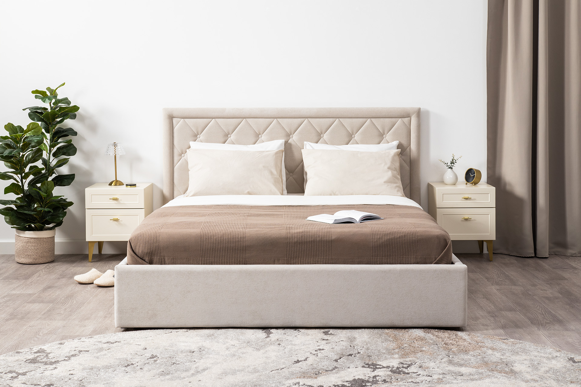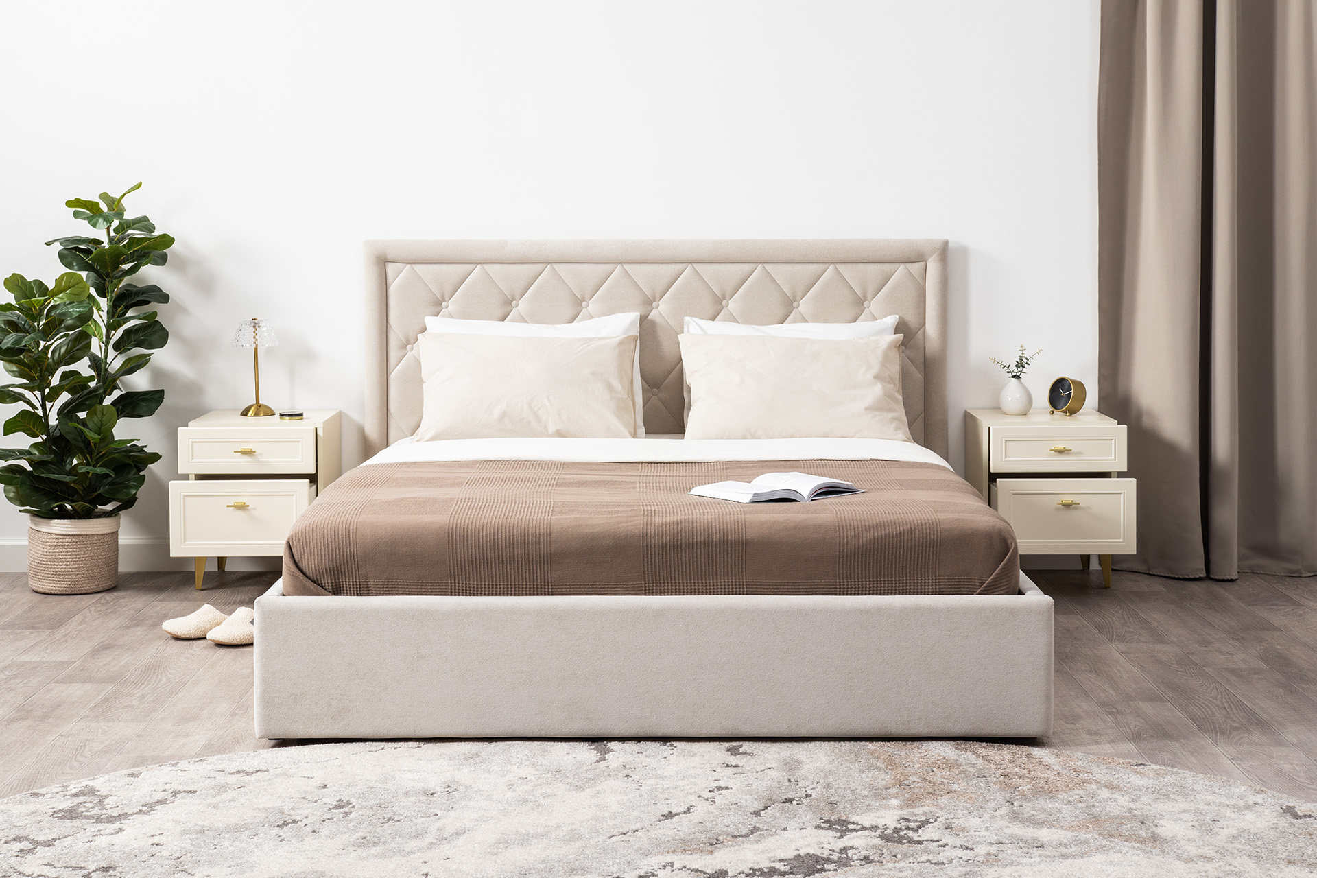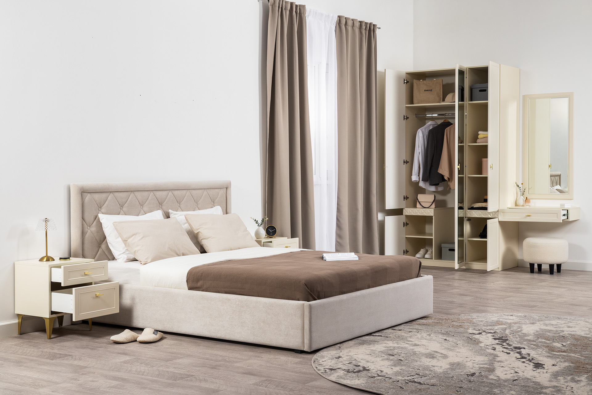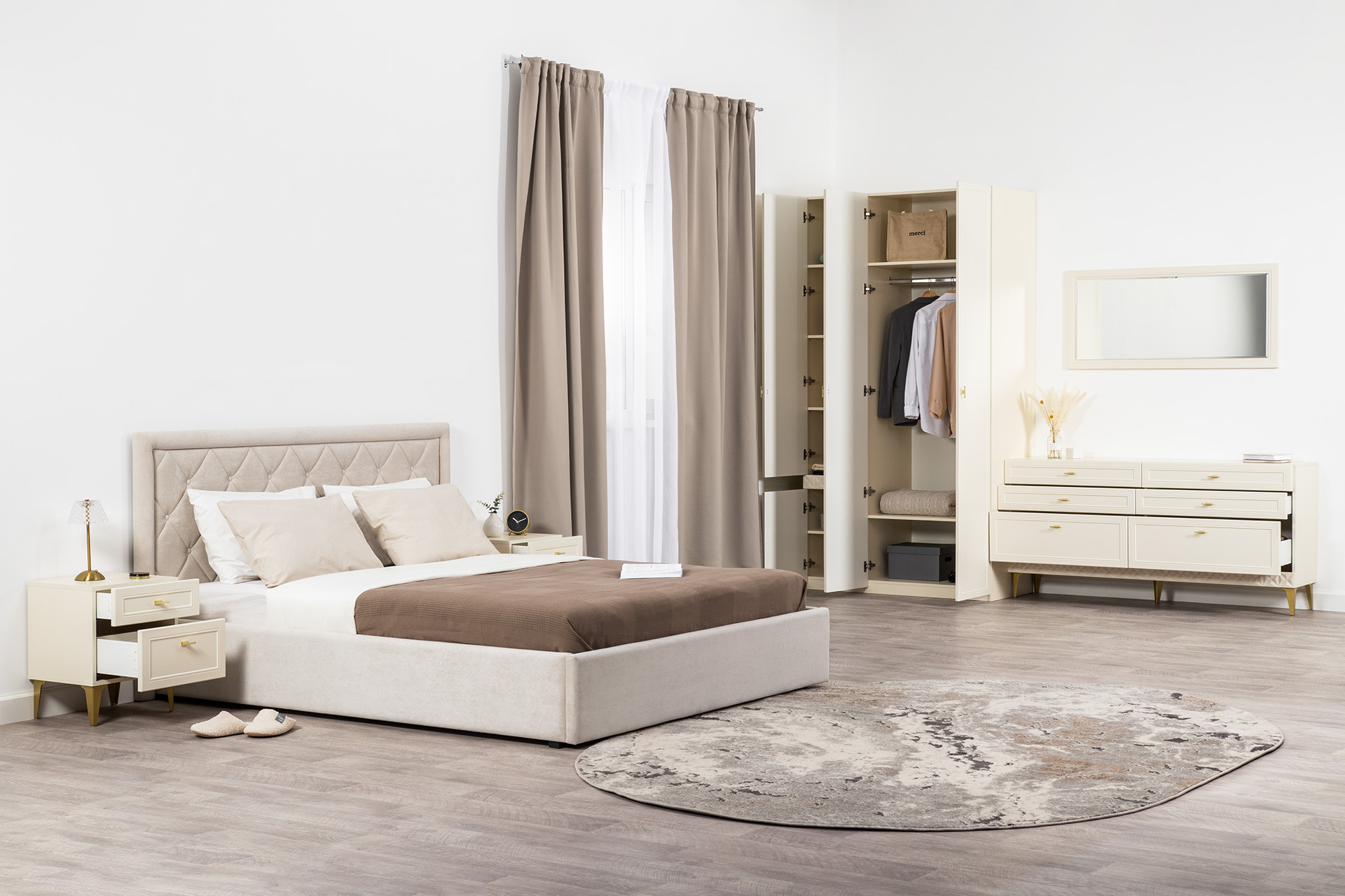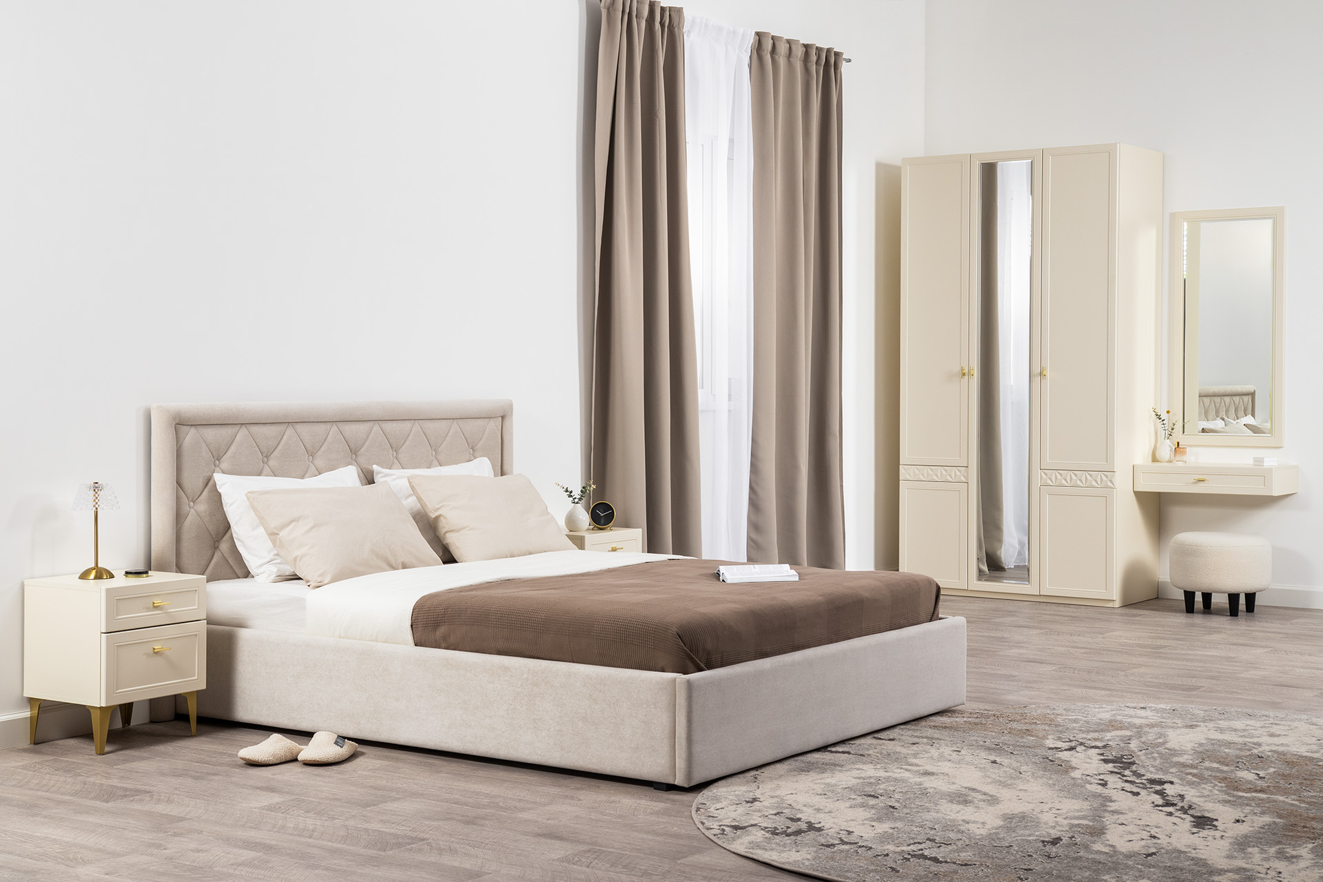 Изящные линии, глубокая фрезеровка фасадов из МДФ и благородные оттенки. Утончённая «Слоновая кость» и изысканная «Олива Шагрень» с глубоким зелёным тоном — создают атмосферу уюта, тепла и благородства. Металлические ручки и опоры золотого цвета придают мебели утончённый блеск, а петли и направляющие с доводчиками обеспечивают плавное и бесшумное закрытие фасадов.