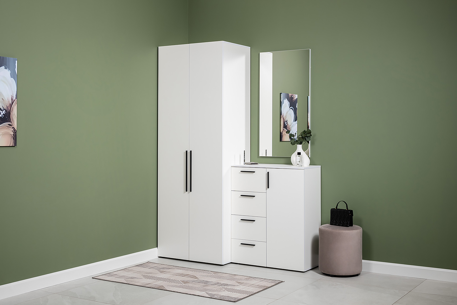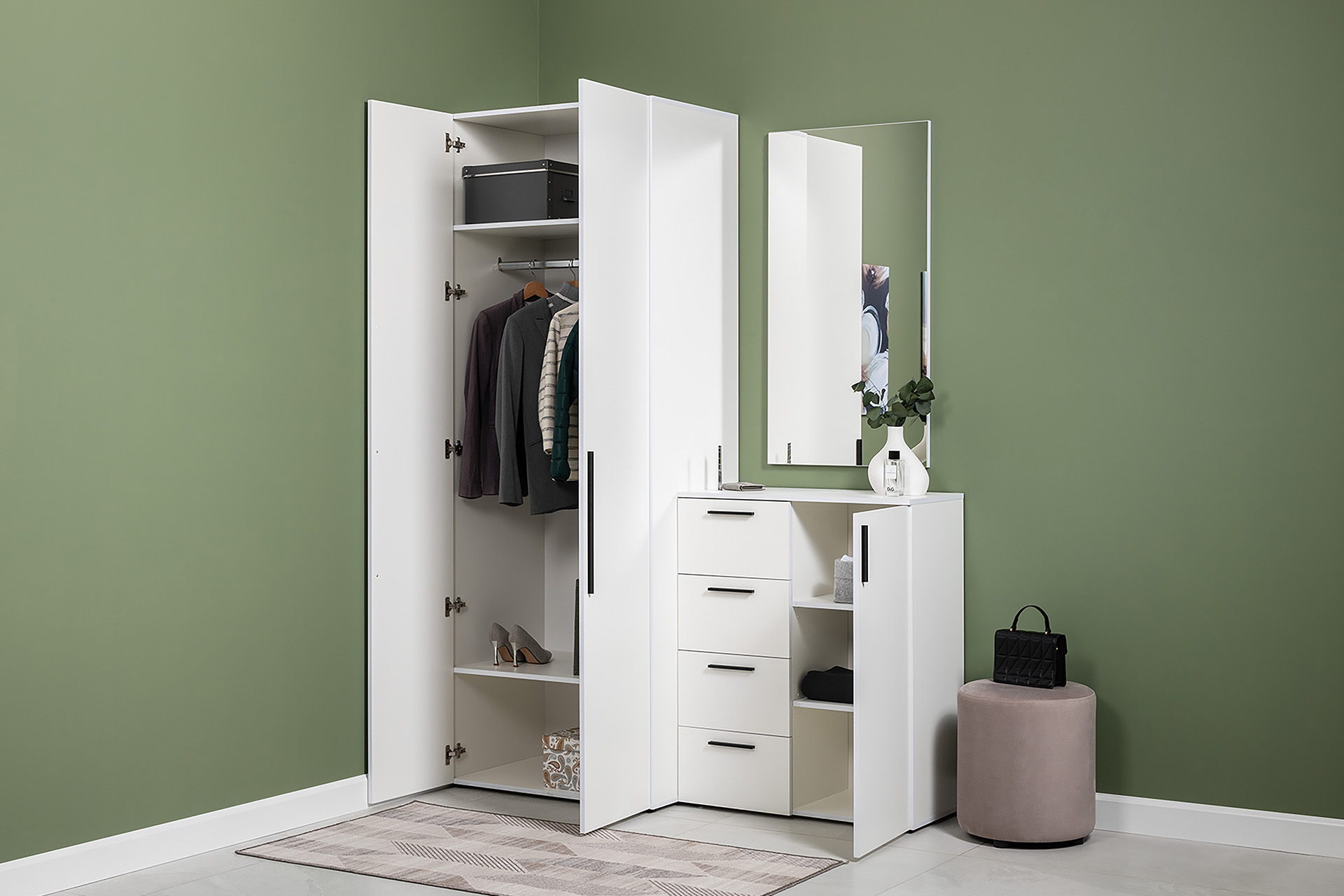 Вместительный шкаф полноразмерной глубины можно дополнить тумбой для обуви с мягким сиденьем и нишами для хранения, зеркалом и минималистичными вешалками.
